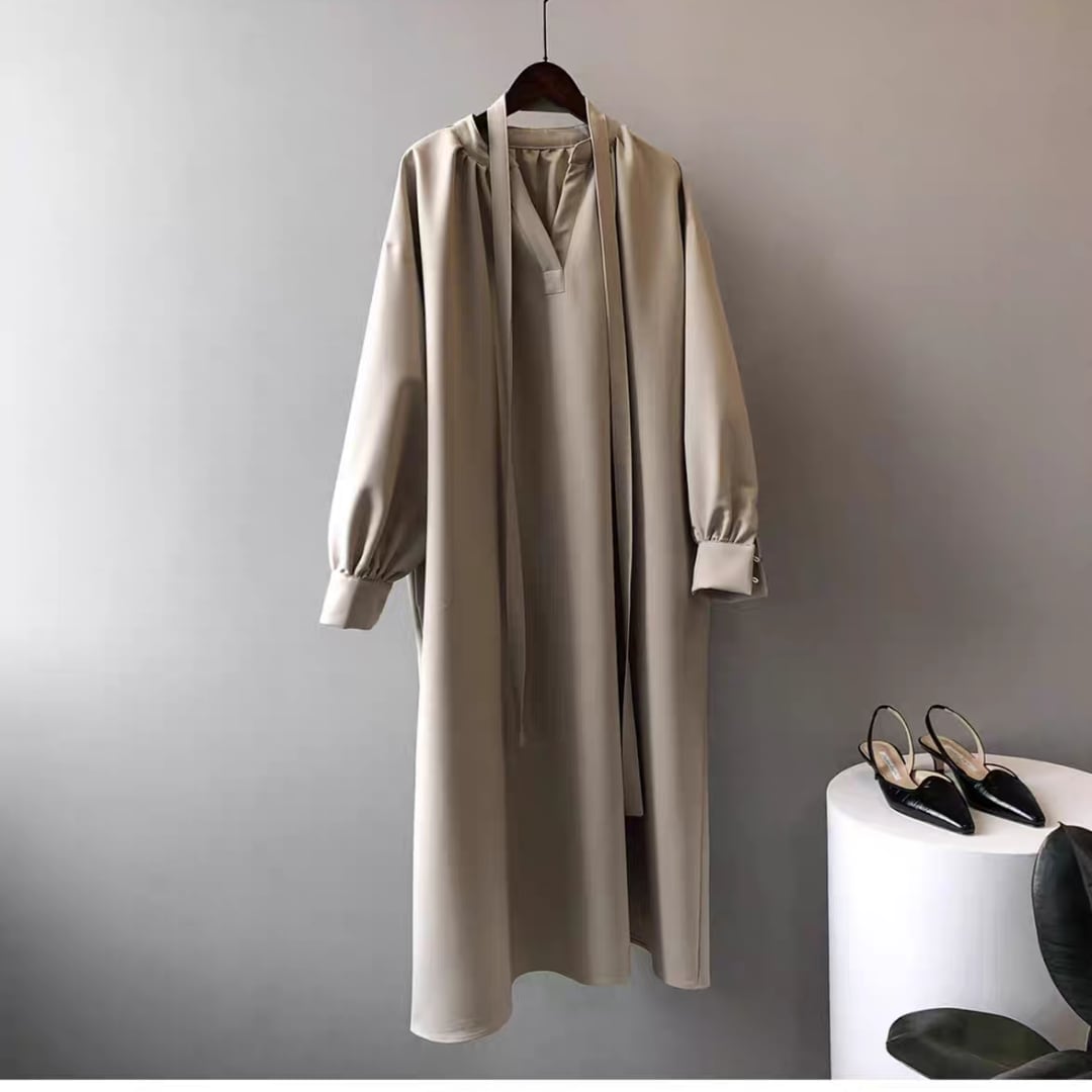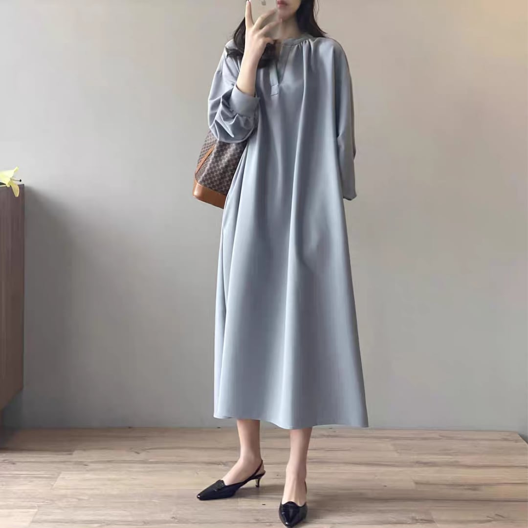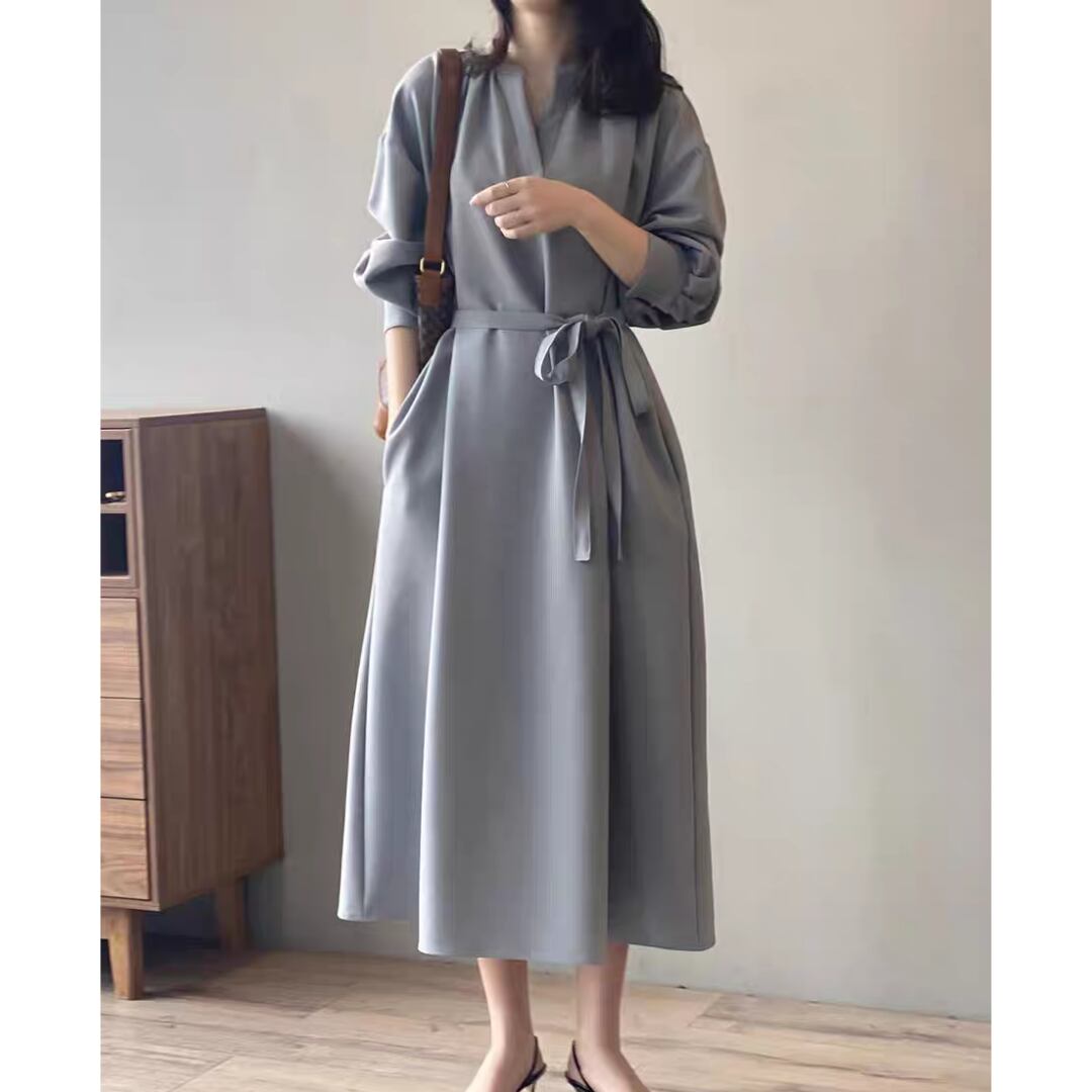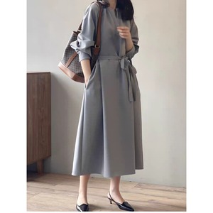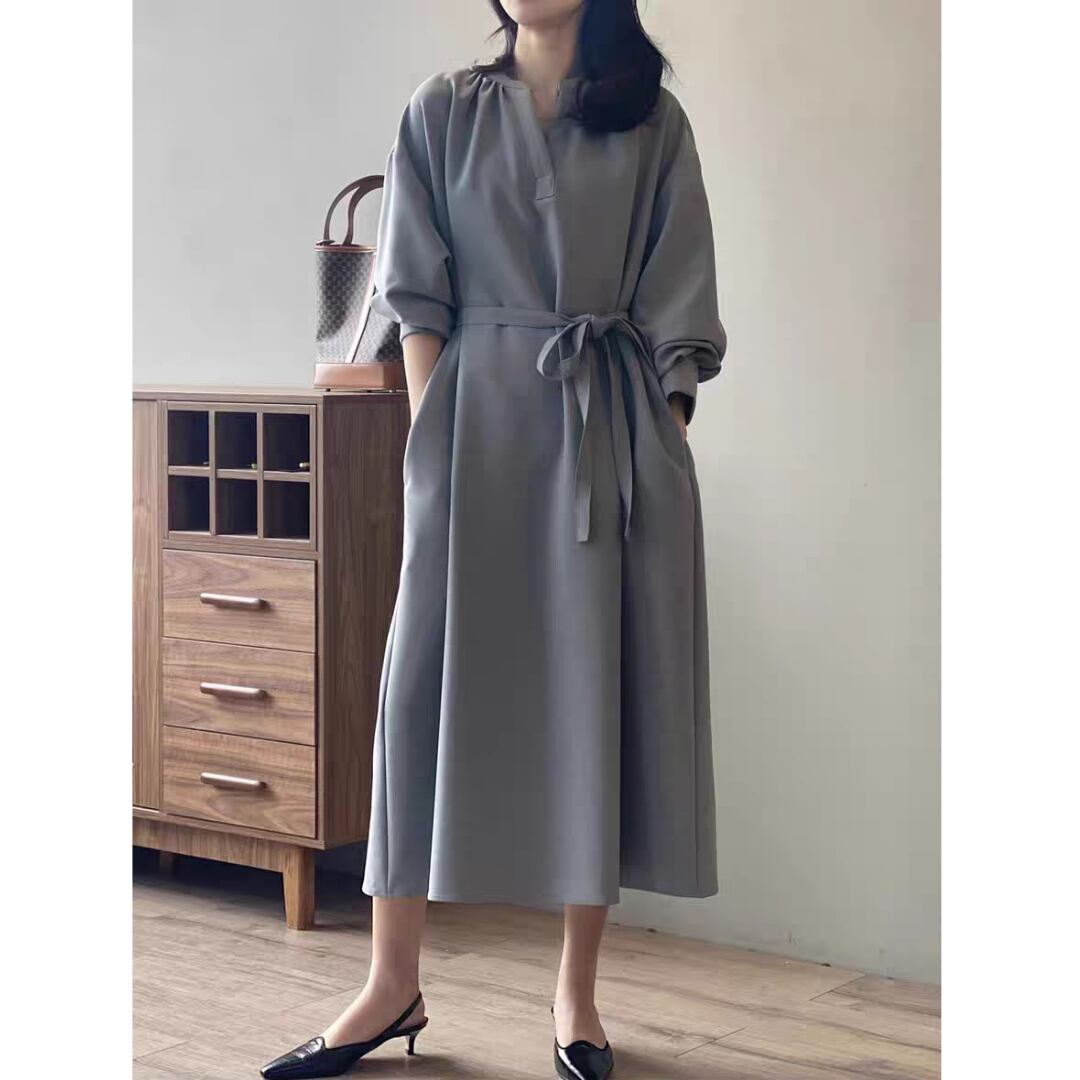 ゆったりとしたシルエットにウエストリボンを添え、スタイルアップも叶うロングワンピース。