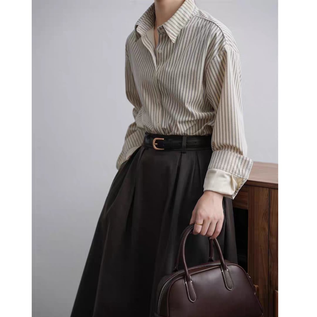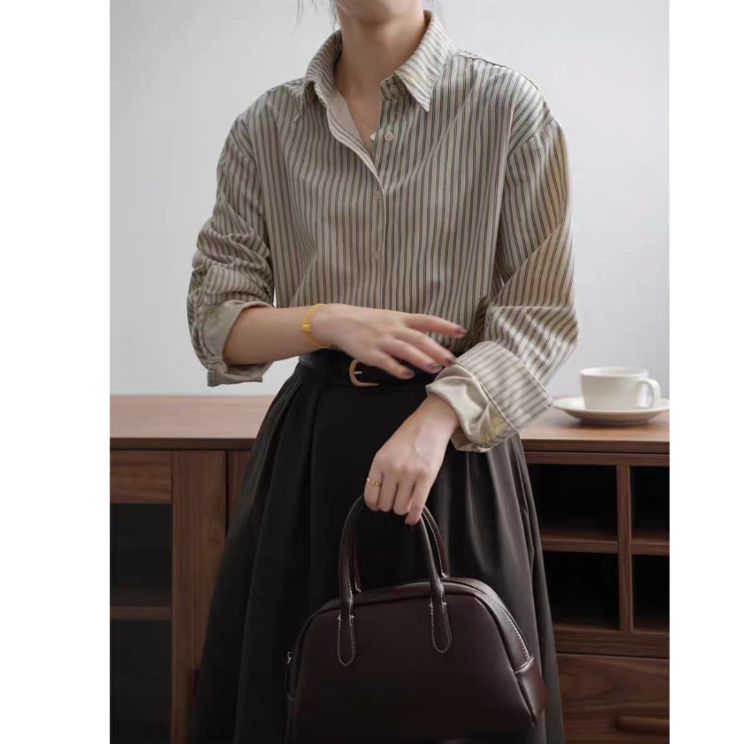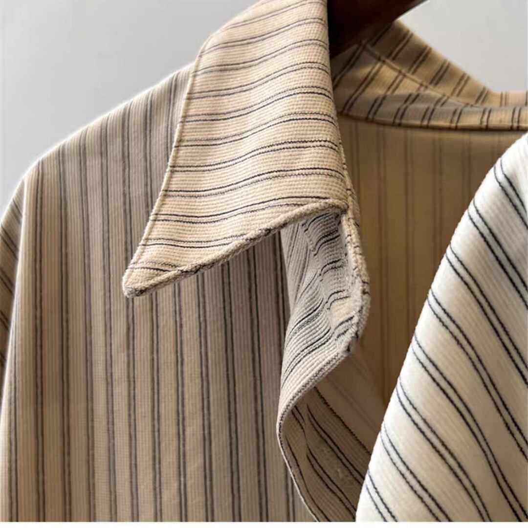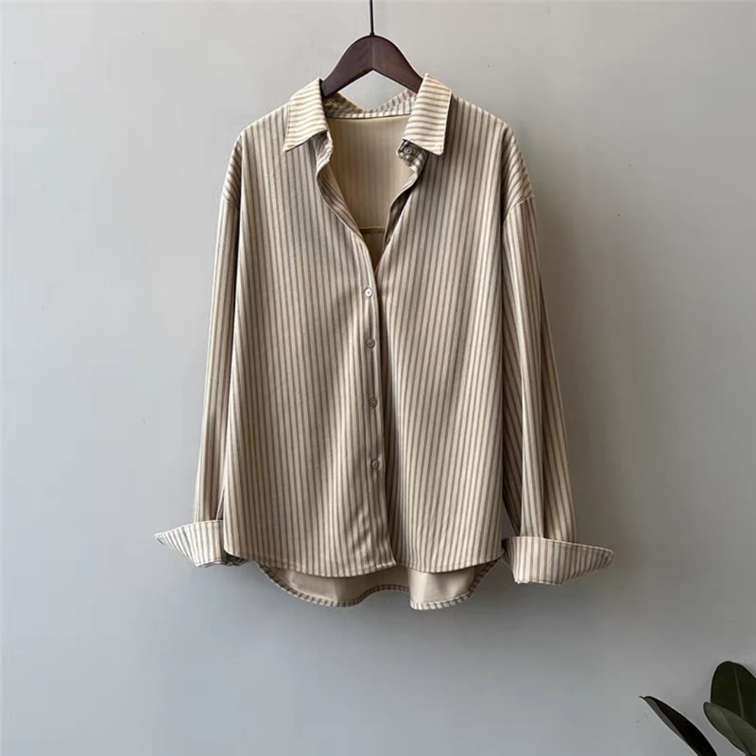 軽やかなポリエステル素材を使用した、洗練ムード漂うストライプ柄シャツ。ゆったりとしたシルエットと落ち感のある生地が、動くたびに女性らしい抜け感を演出します。