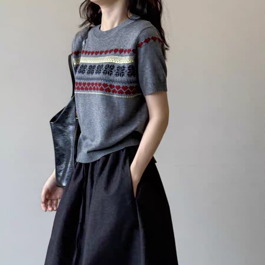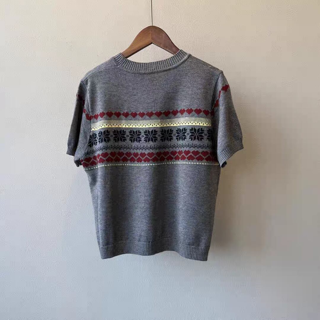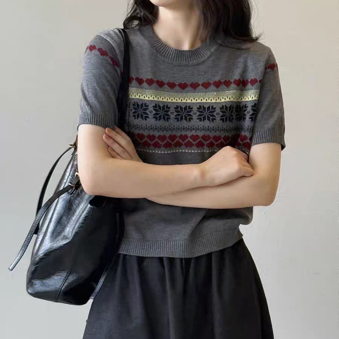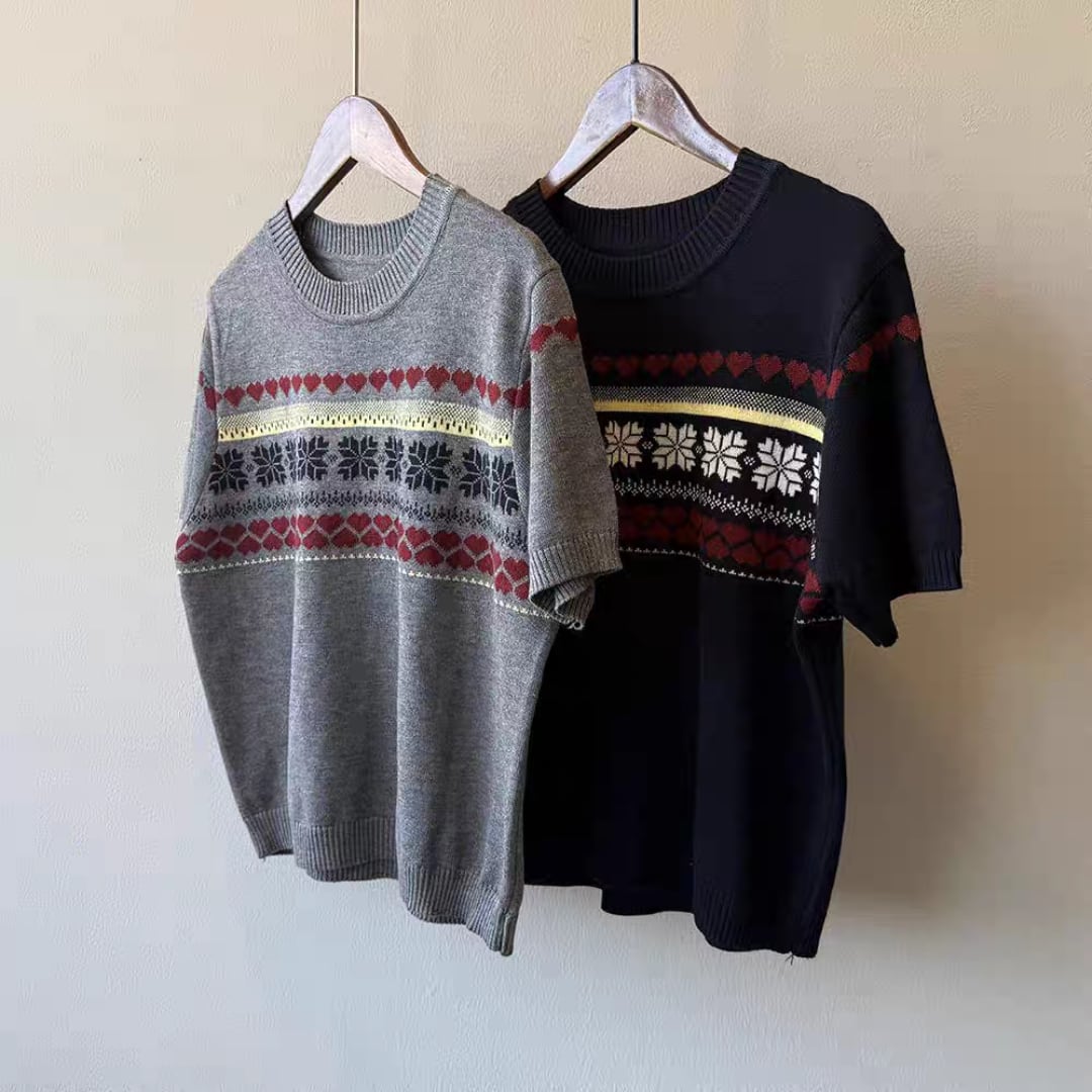 温かみのあるノルディック調の柄を胸元にあしらった半袖ニットプルオーバー。ほどよい厚みで季節の変わり目にも活躍し、スカートにもパンツにも合わせやすいデザイン。カジュアルにもフェミニンにも着こなせる万能ニットです。