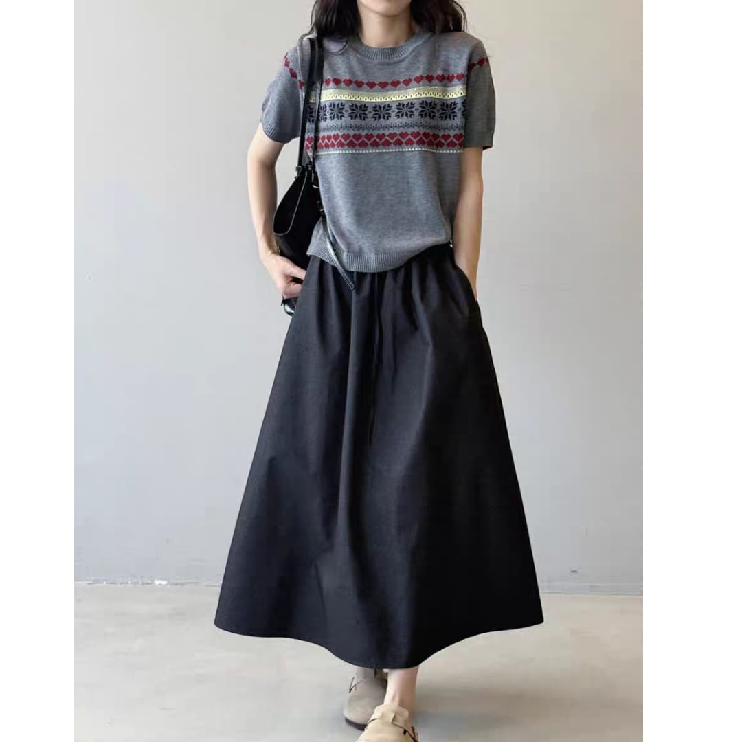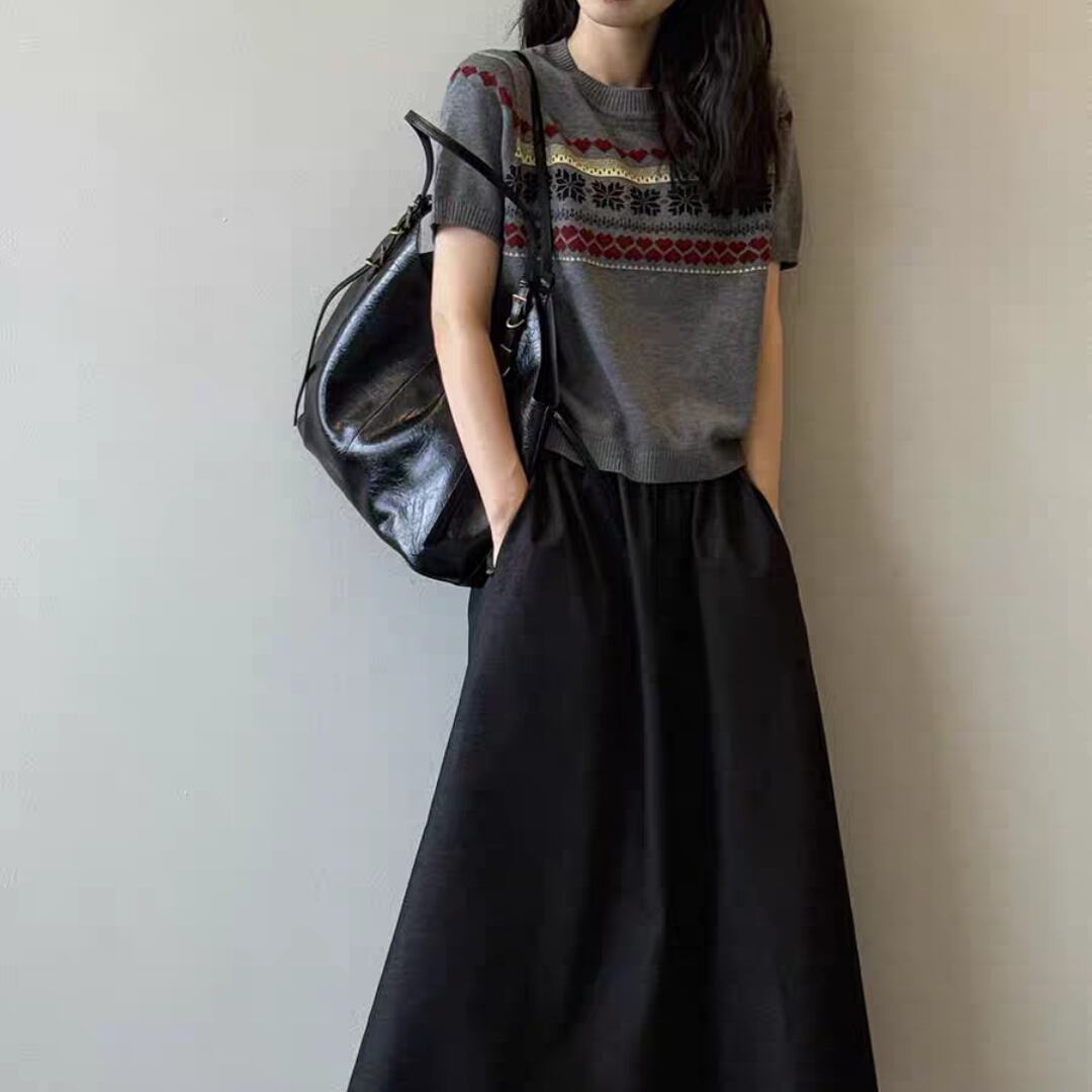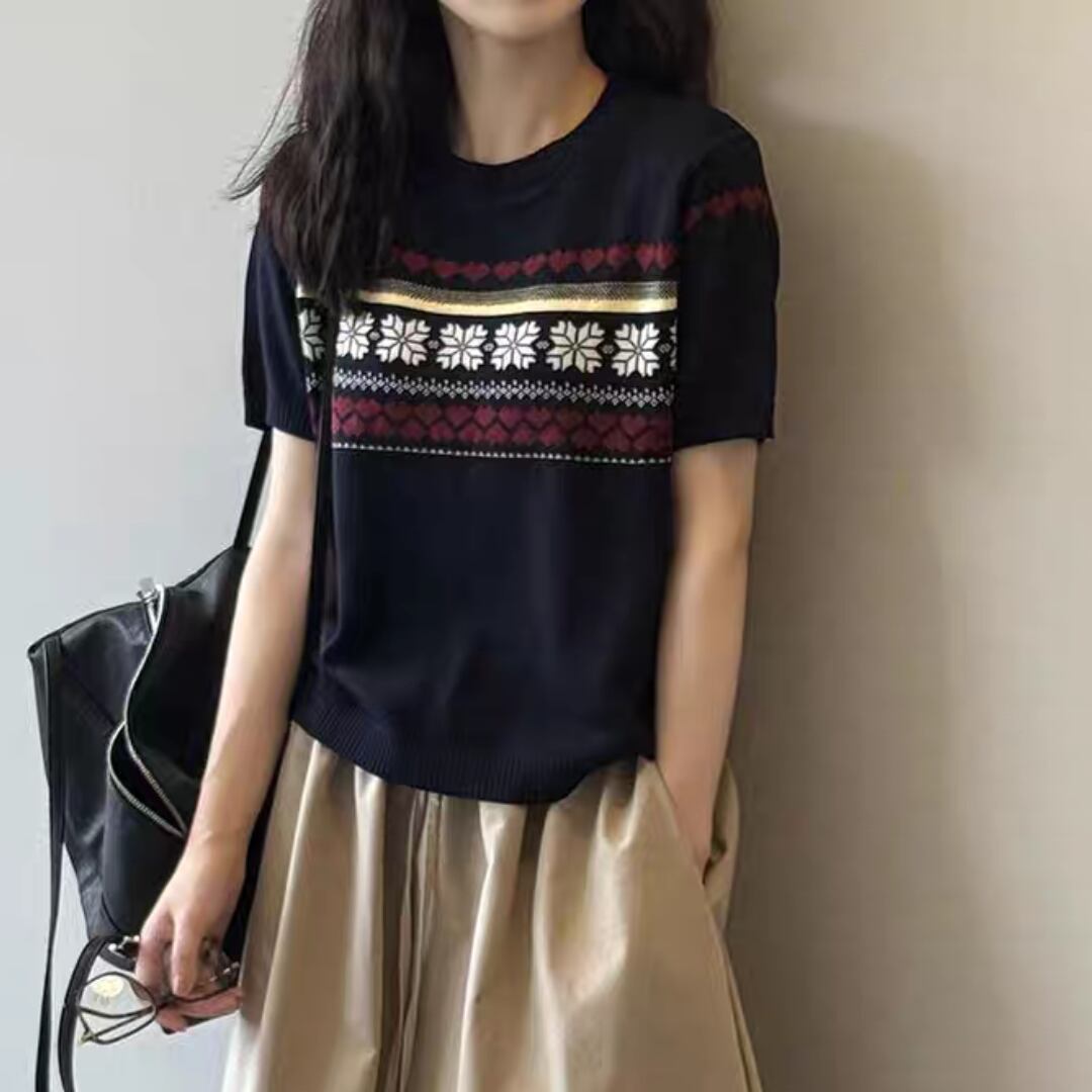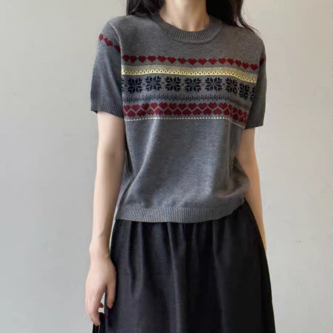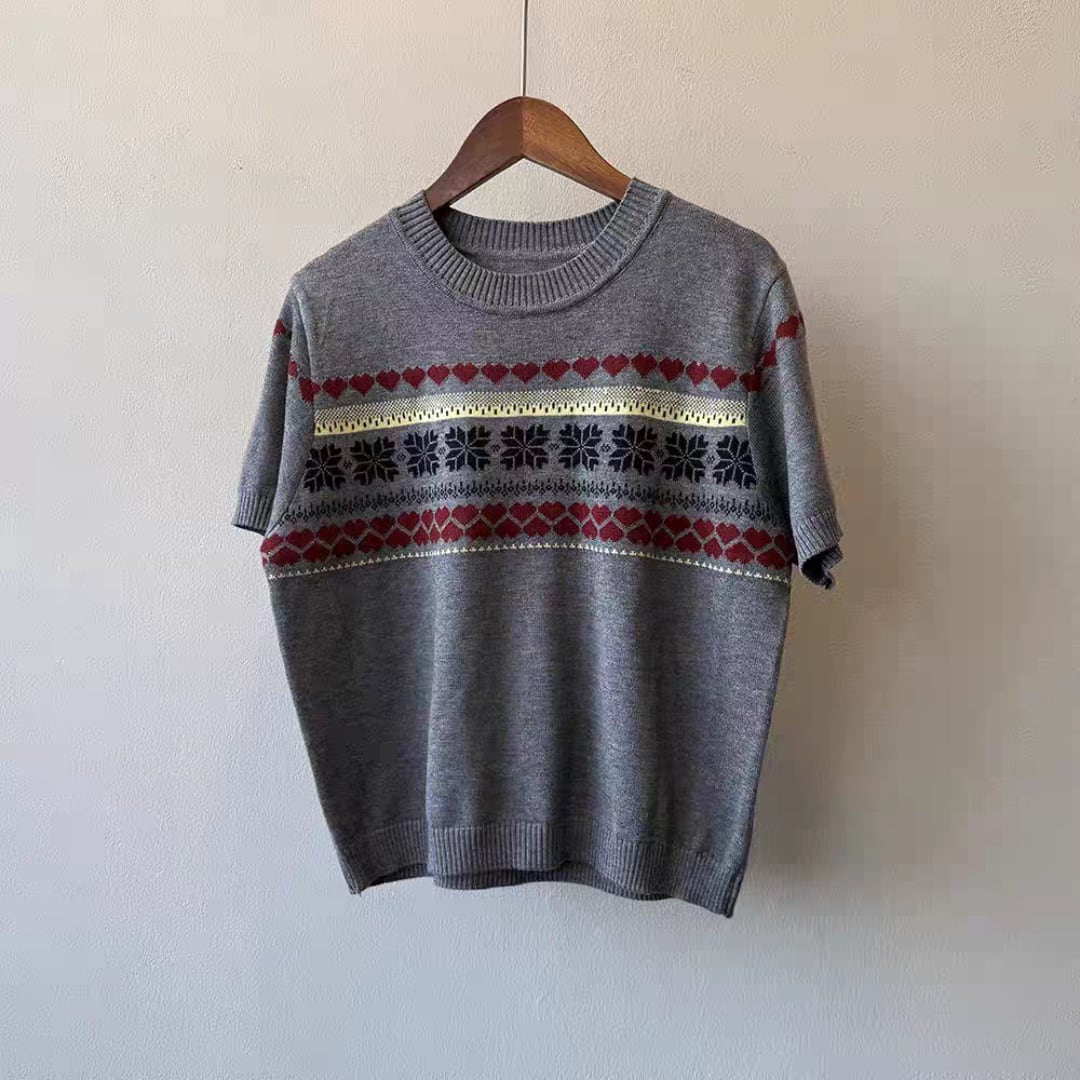 温かみのあるノルディック調の柄を胸元にあしらった半袖ニットプルオーバー。ほどよい厚みで季節の変わり目にも活躍し、スカートにもパンツにも合わせやすいデザイン。カジュアルにもフェミニンにも着こなせる万能ニットです。