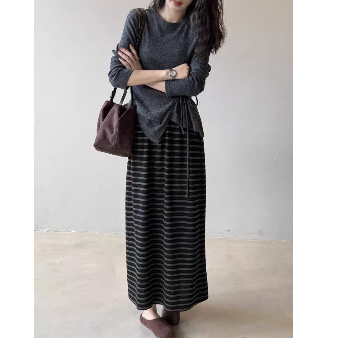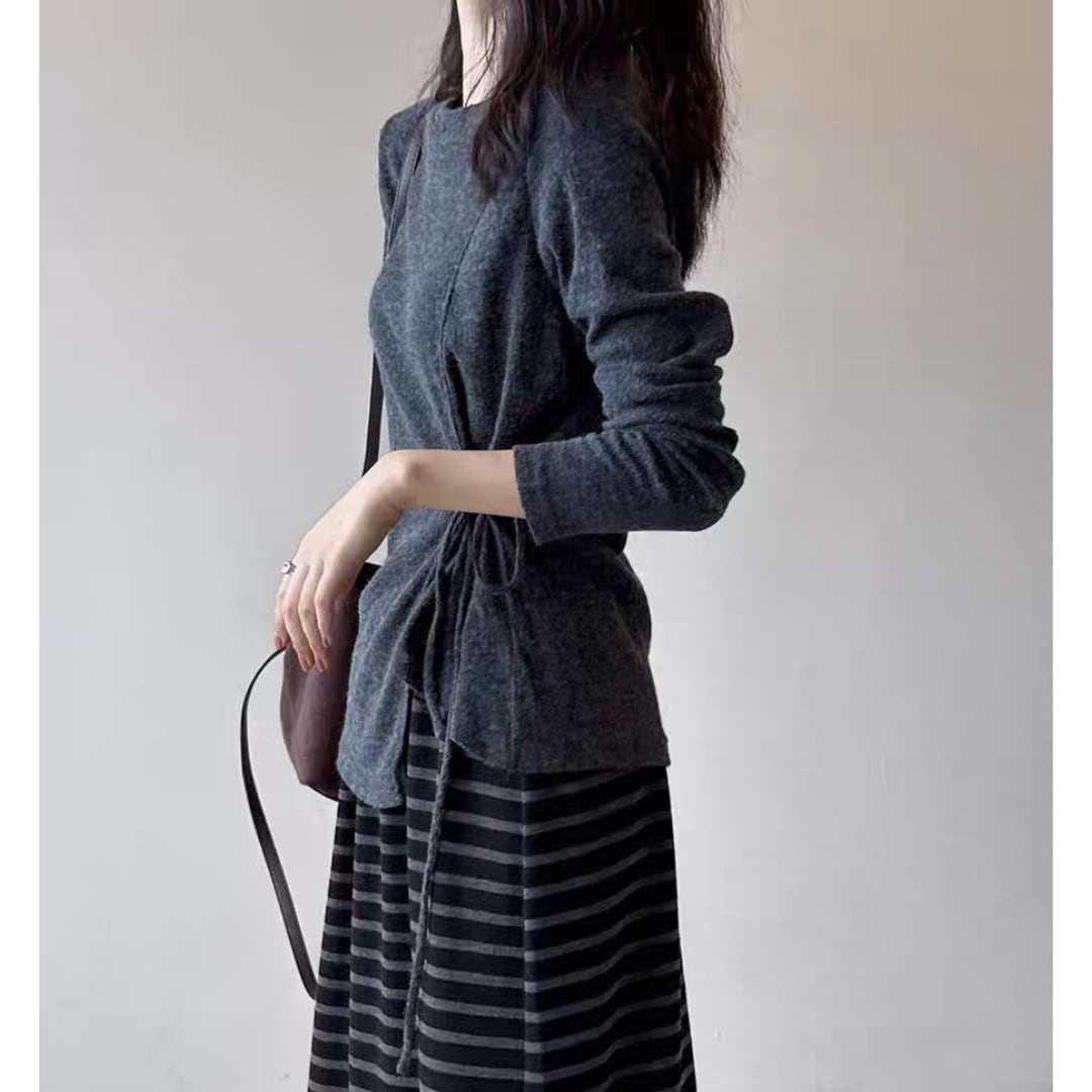 サイドのリボンディテールがさりげないアクセントとなり、ウエストラインをすっきり見せます。パンツやスカートはもちろん、ワンピースの上からレイヤードしても◎。デイリーからお出かけまで幅広く活躍する一枚です。