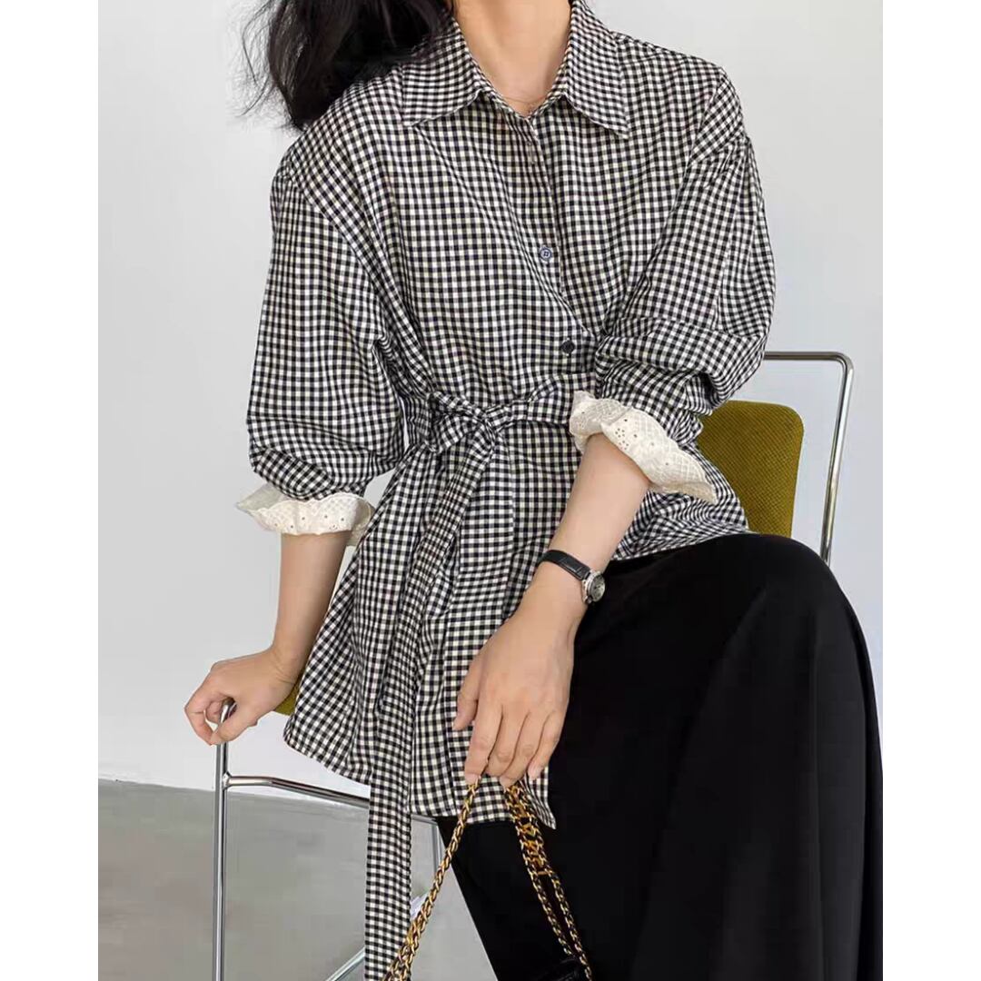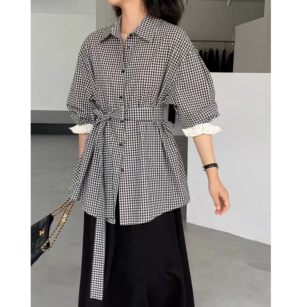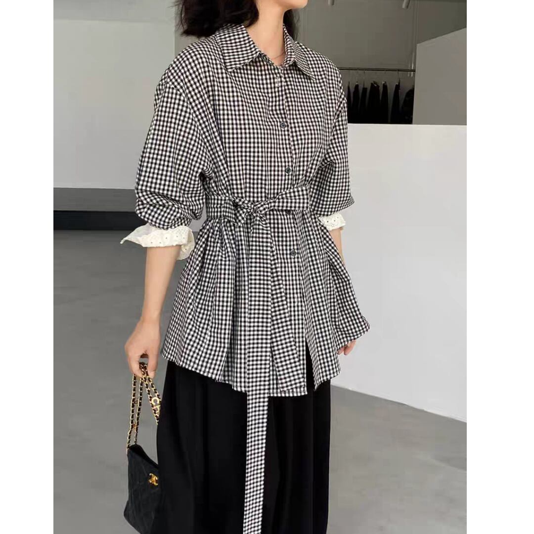 ギンガムチェック ウエストリボンシャツ 0196