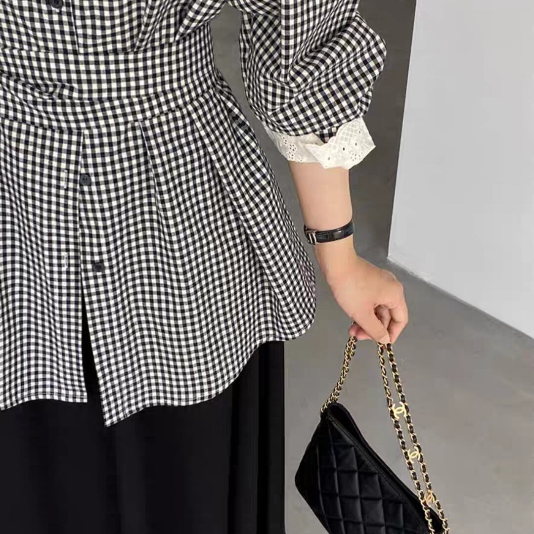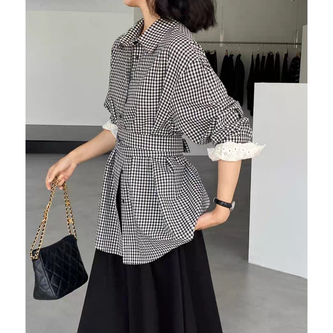モノトーンのギンガムチェック柄が大人可愛い印象のウエストリボンシャツ。ウエストリボンでシルエットを引き締め、前後差のある裾ラインがスタイルアップ効果を演出。パンツにもスカートにも合わせやすく、オフィスからカジュアルまで幅広く活躍します。