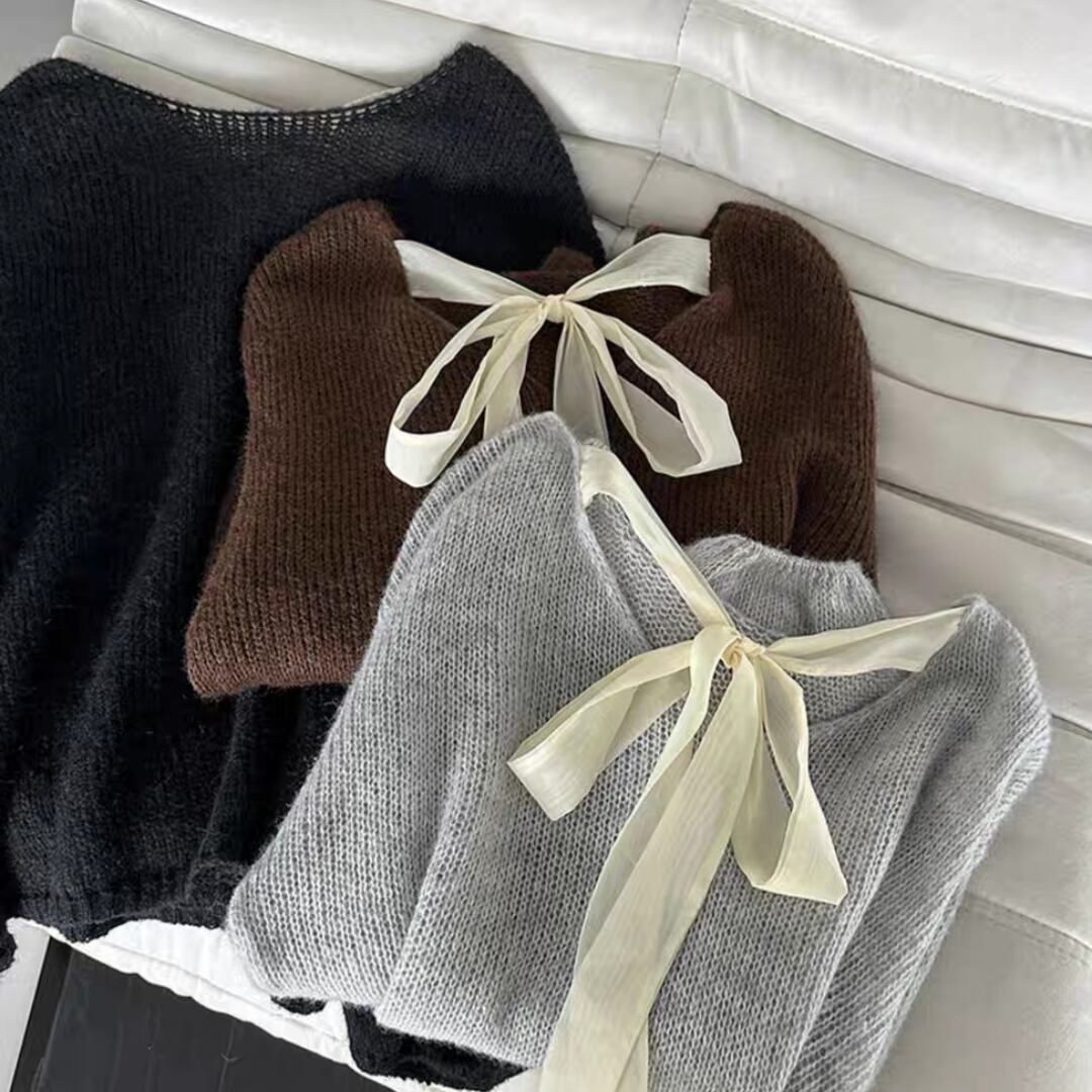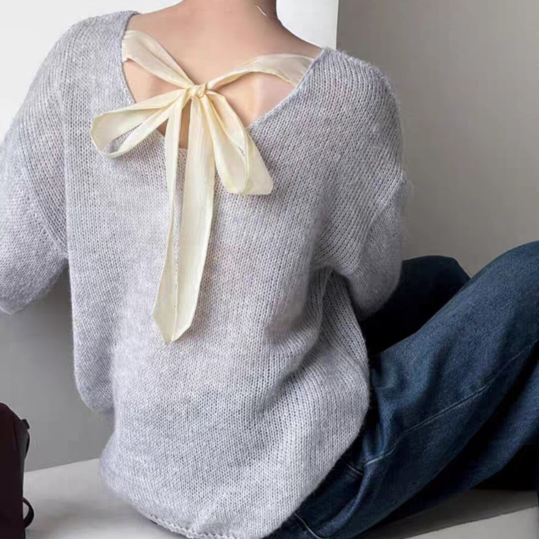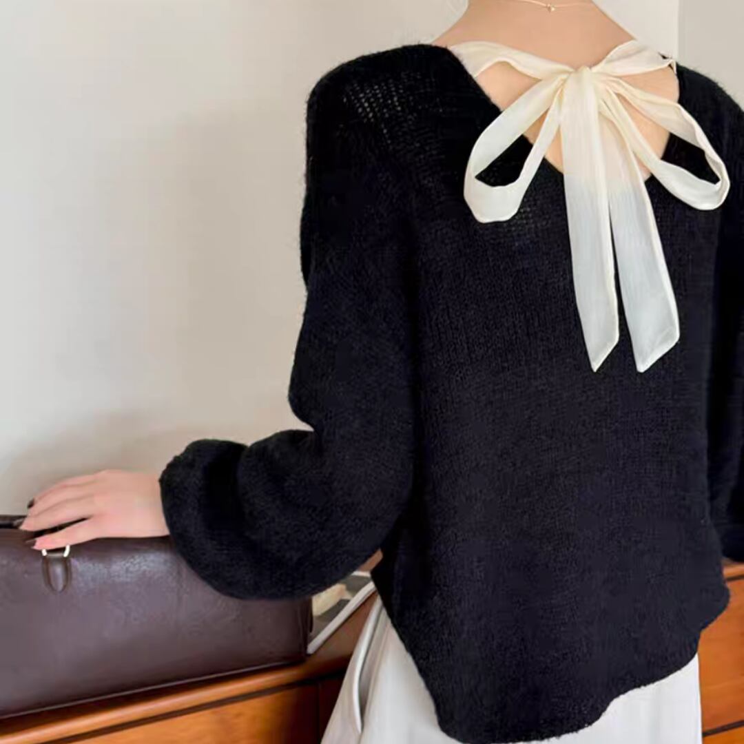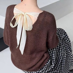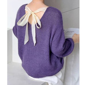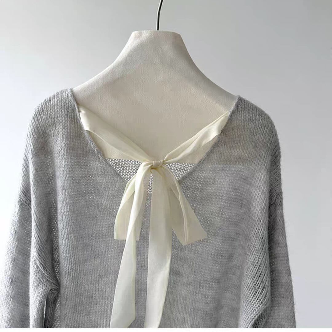 背中にあしらったサテンリボンが女性らしさを引き立て、後ろ姿まで印象的に演出します。ゆったりとしたシルエットで体型カバーも叶い、カジュアルにもフェミニンにも着回せる一枚です。