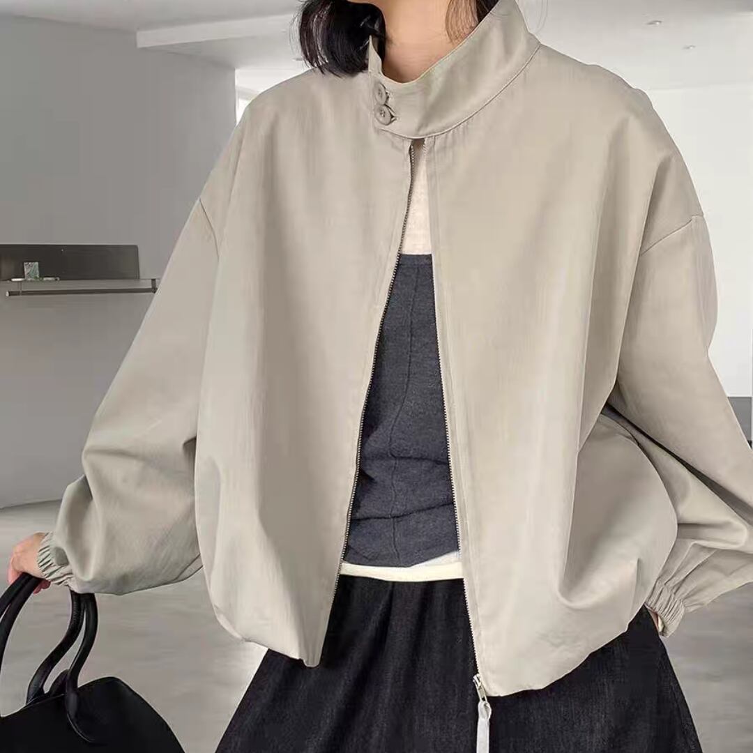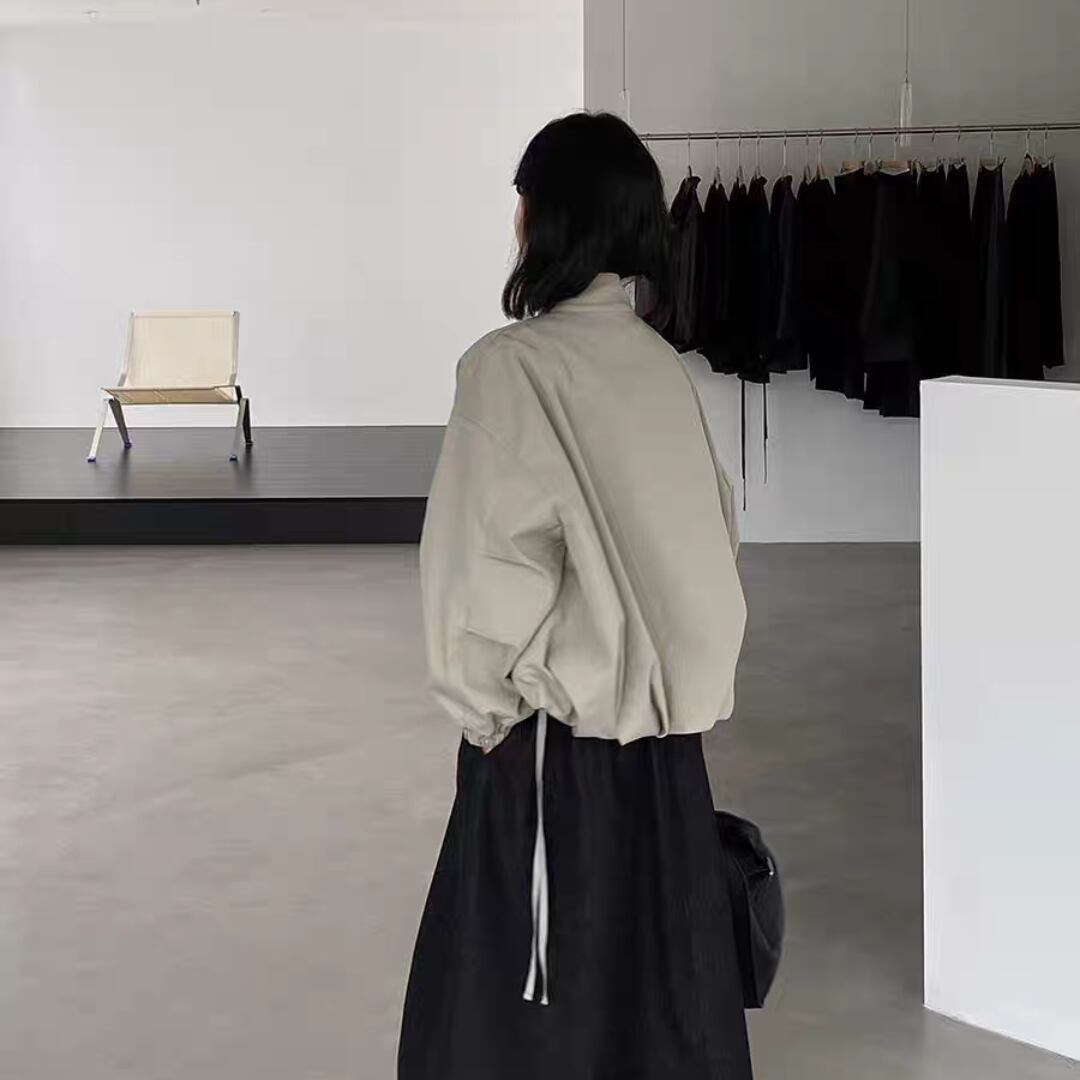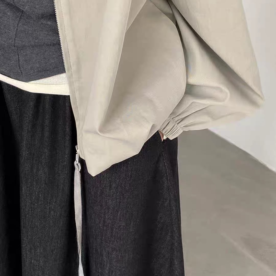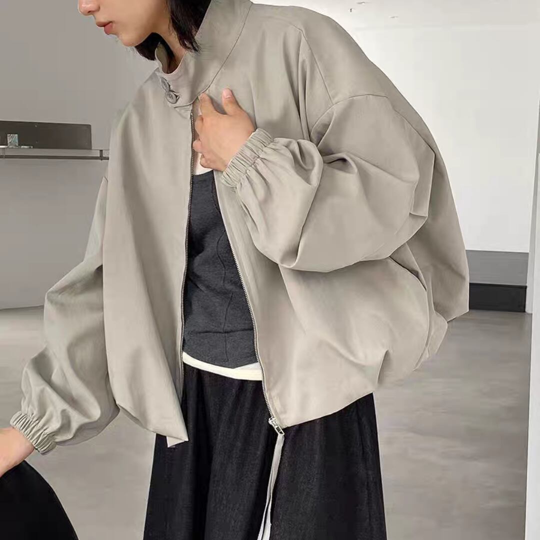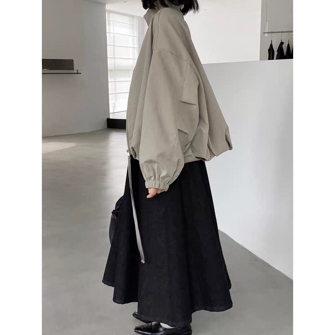 スタンドカラーとフロントジップがすっきりとした印象を与えつつ、ボリュームスリーブが大人の抜け感を演出します。ゆったりとしたシルエットで羽織るだけでこなれた雰囲気に。パンツにもスカートにも合わせやすく、デイリーからお出かけまで幅広く活躍する一枚です。