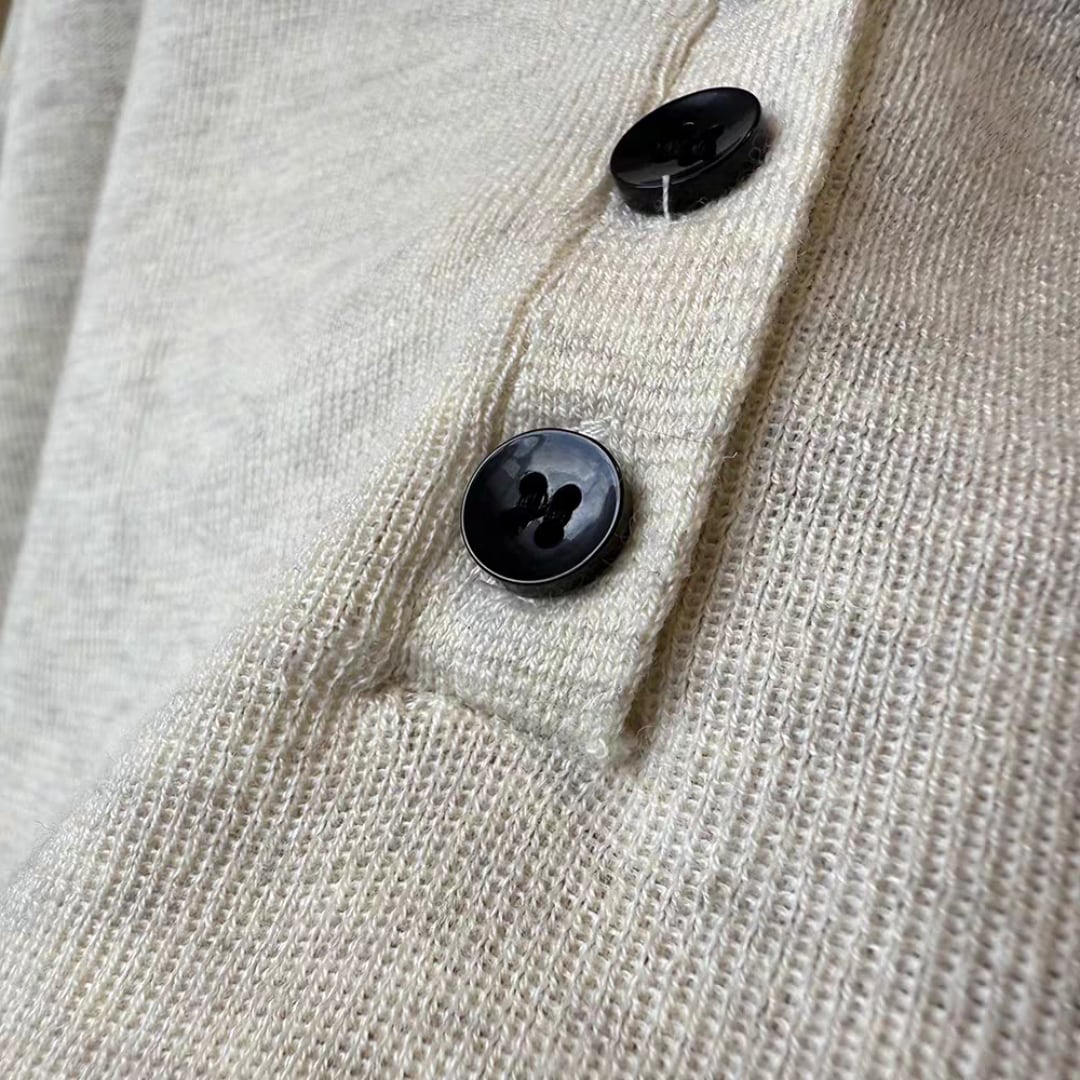 胸元のヘンリーネックボタンがさりげないアクセントになり、首元に抜け感を演出します。両サイドにはドローストリング仕様を施し、絞り具合でシルエットのアレンジが可能。ボトムスを選ばず、大人カジュアルにもフェミニンにも着こなせる万能アイテムです。