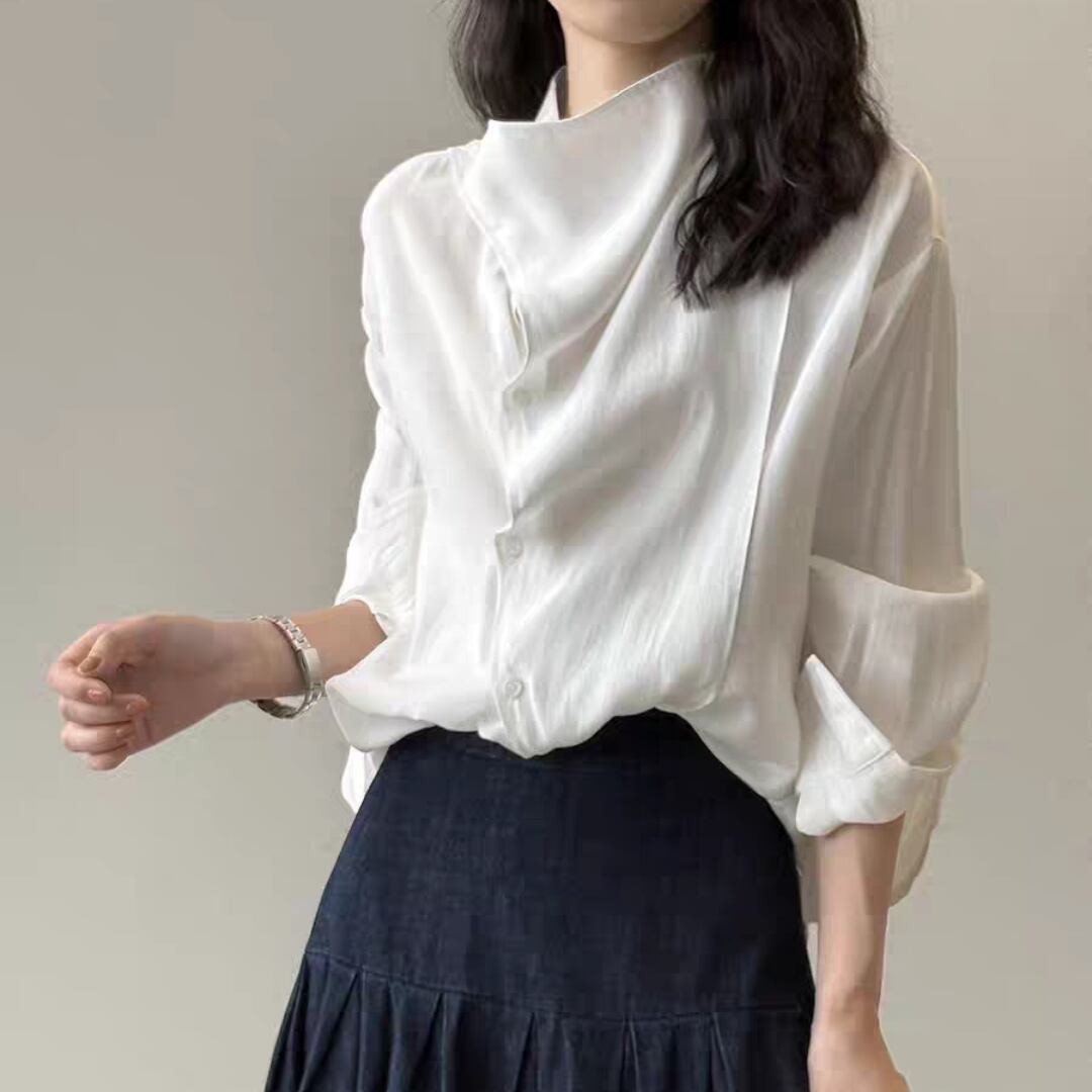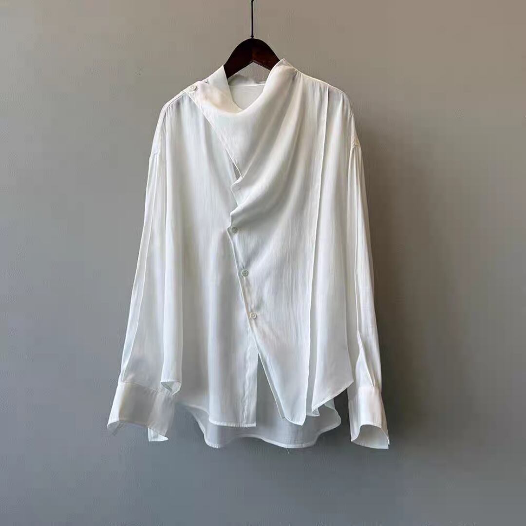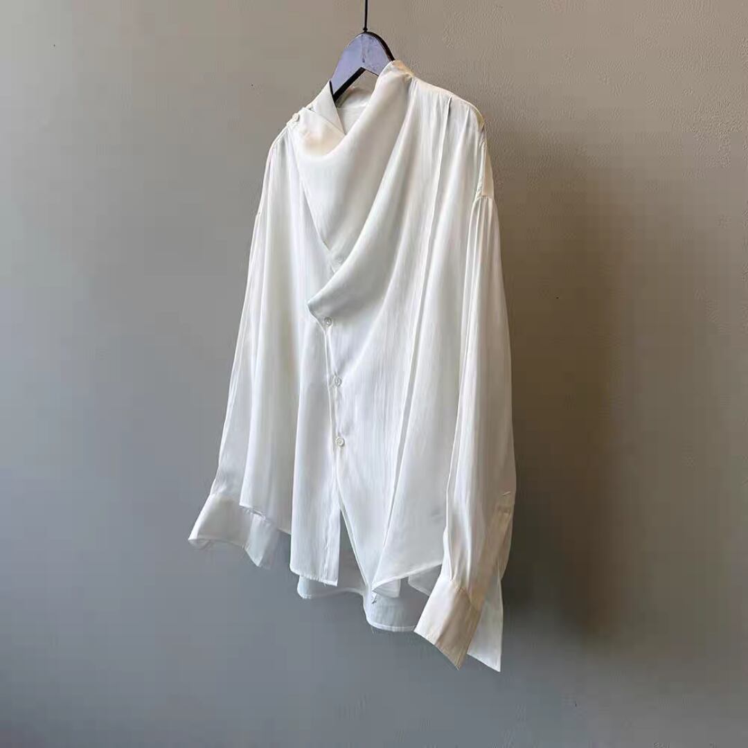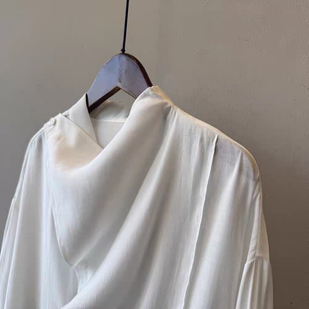 フロントに施したアシンメトリーなドレープとボタン使いが、シンプルながら洗練された印象を演出します。