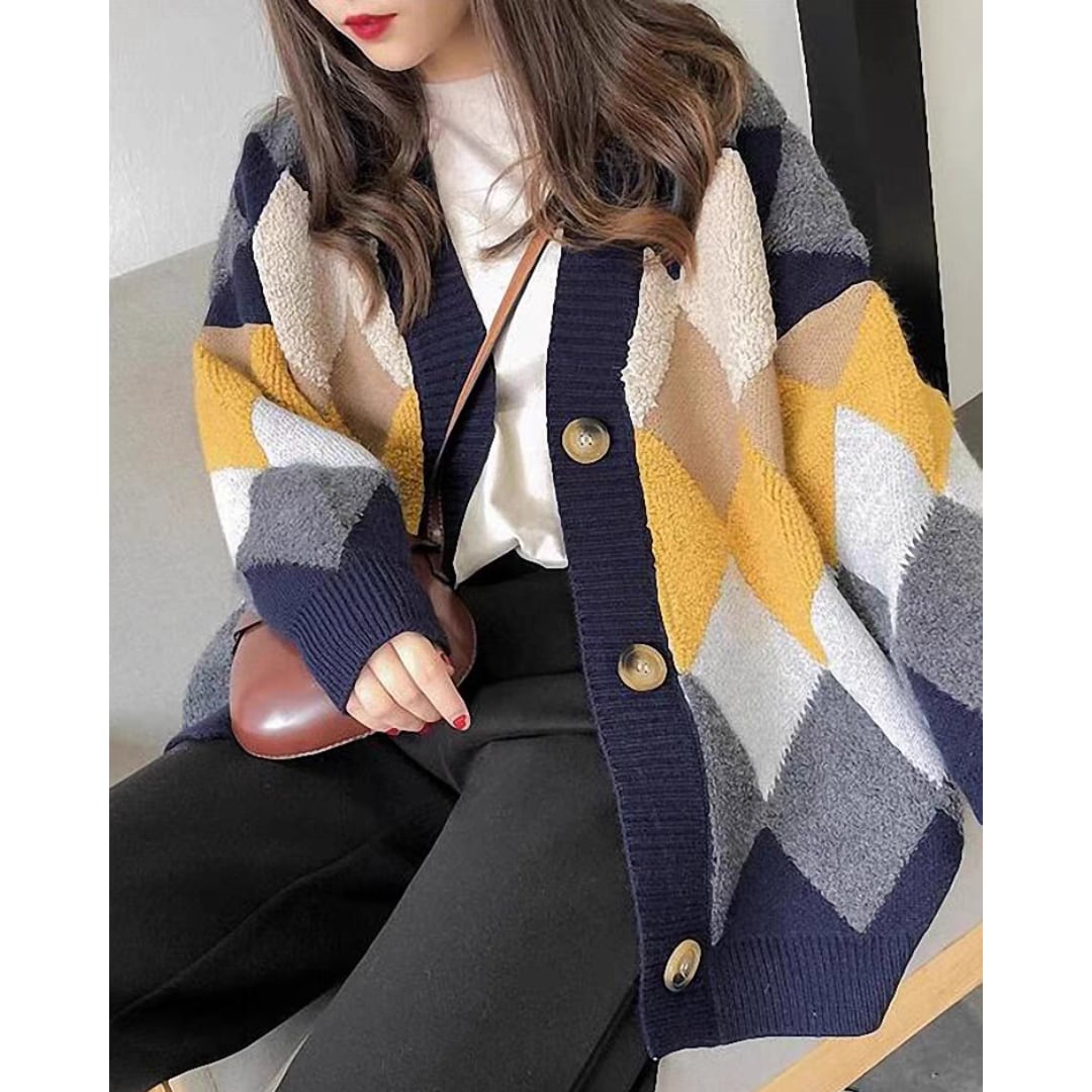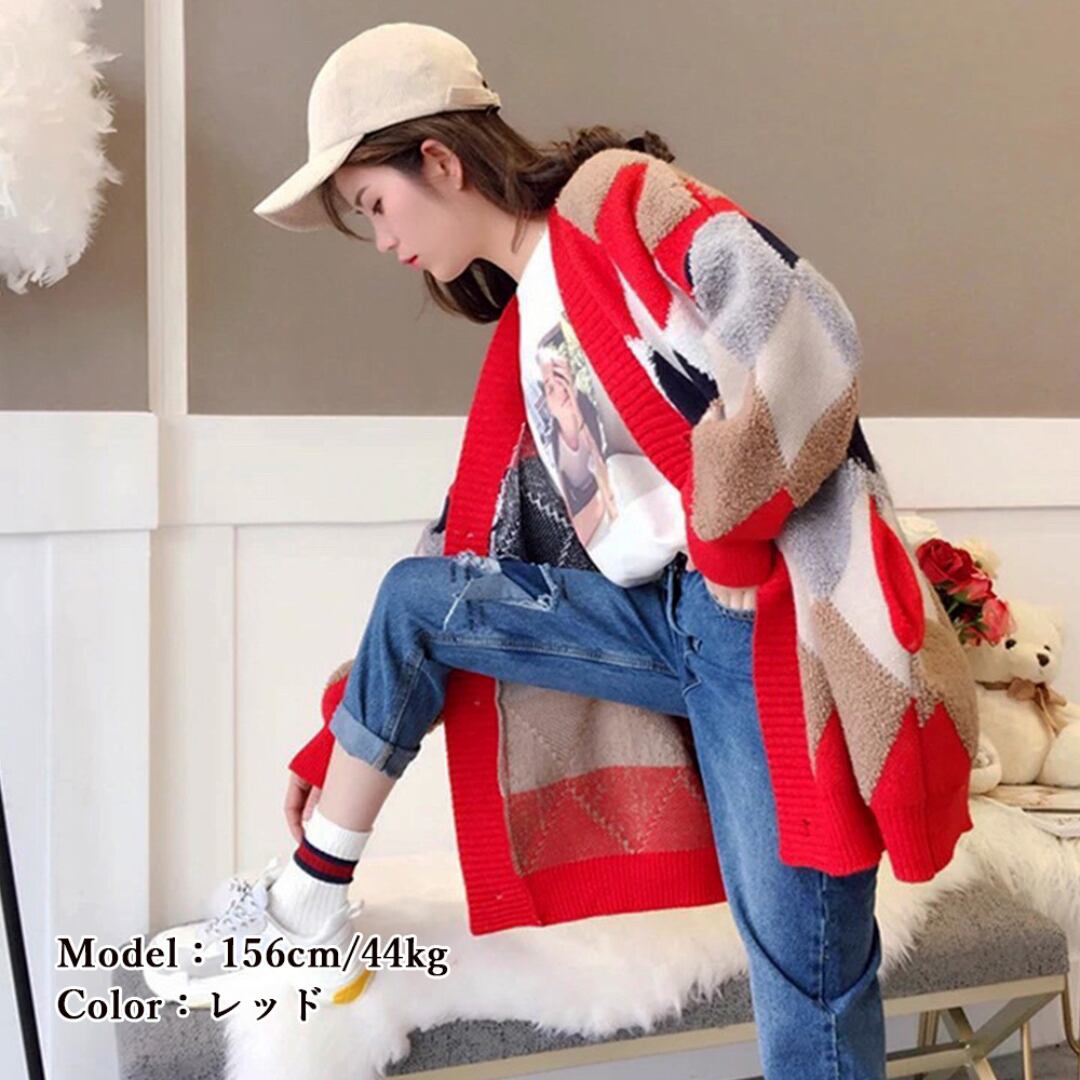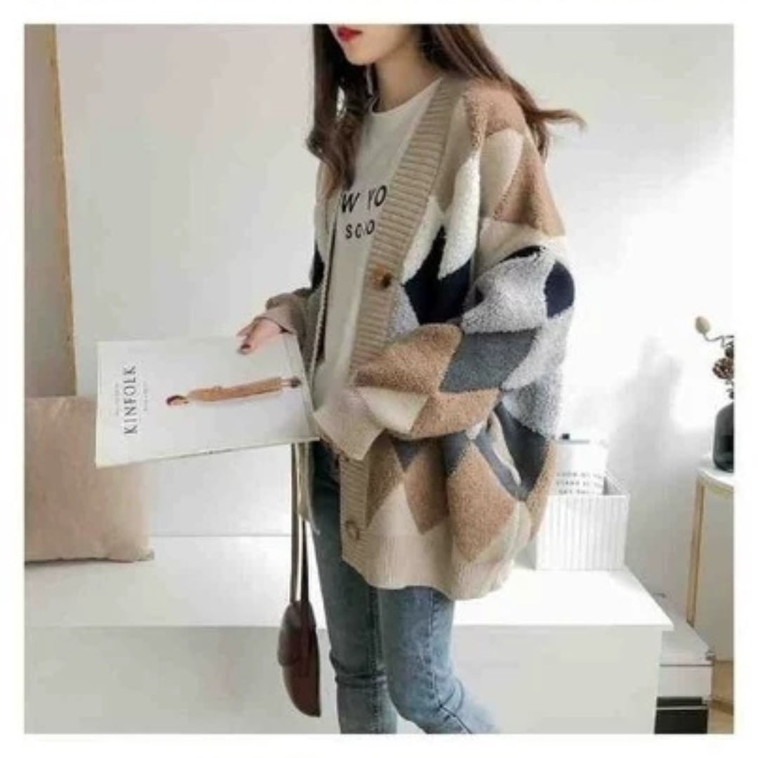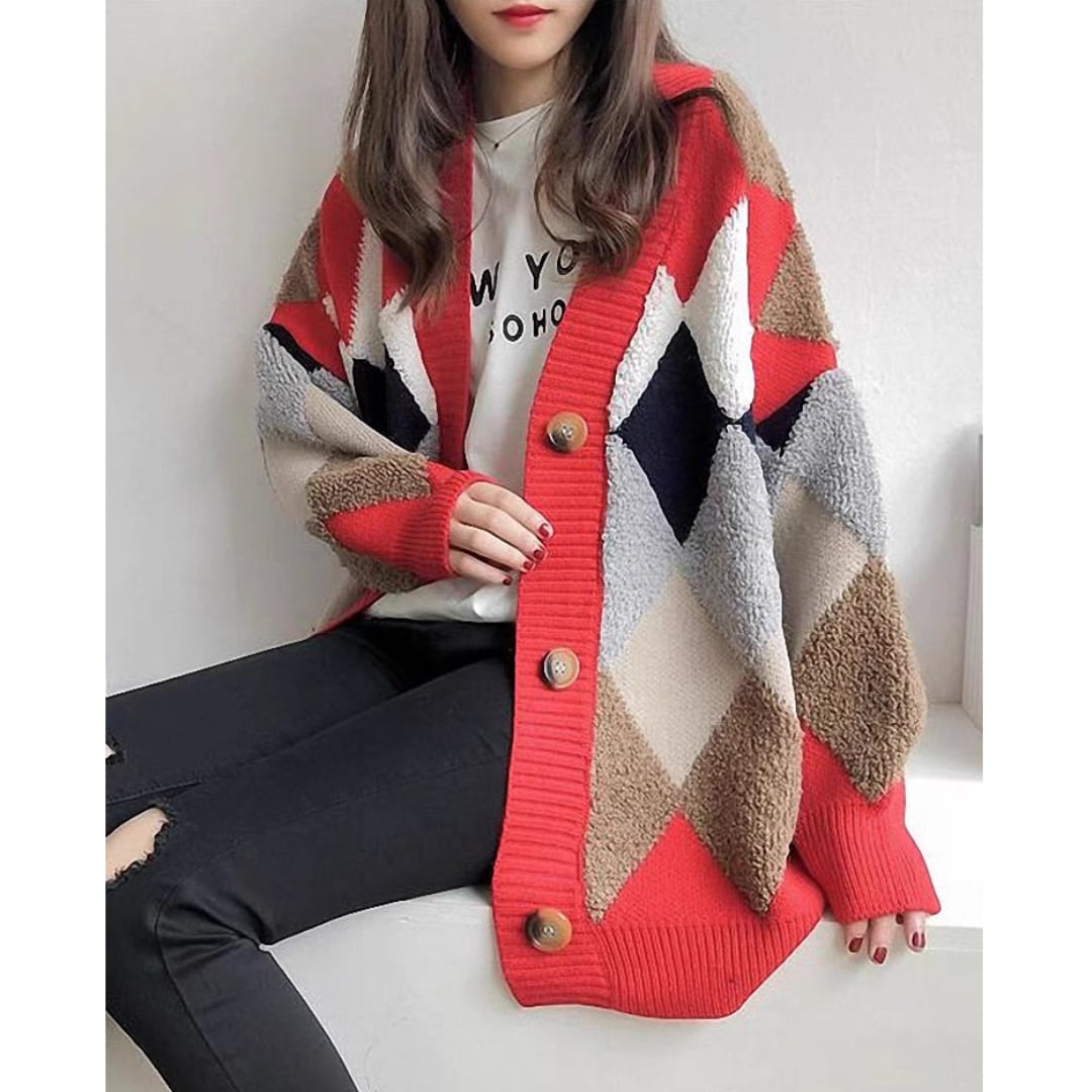 明るい配色のひし形チェック柄が浮き出るもこもこボアでアクセントになるカーディガン