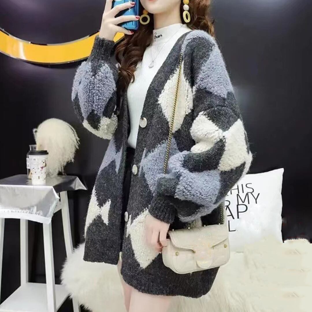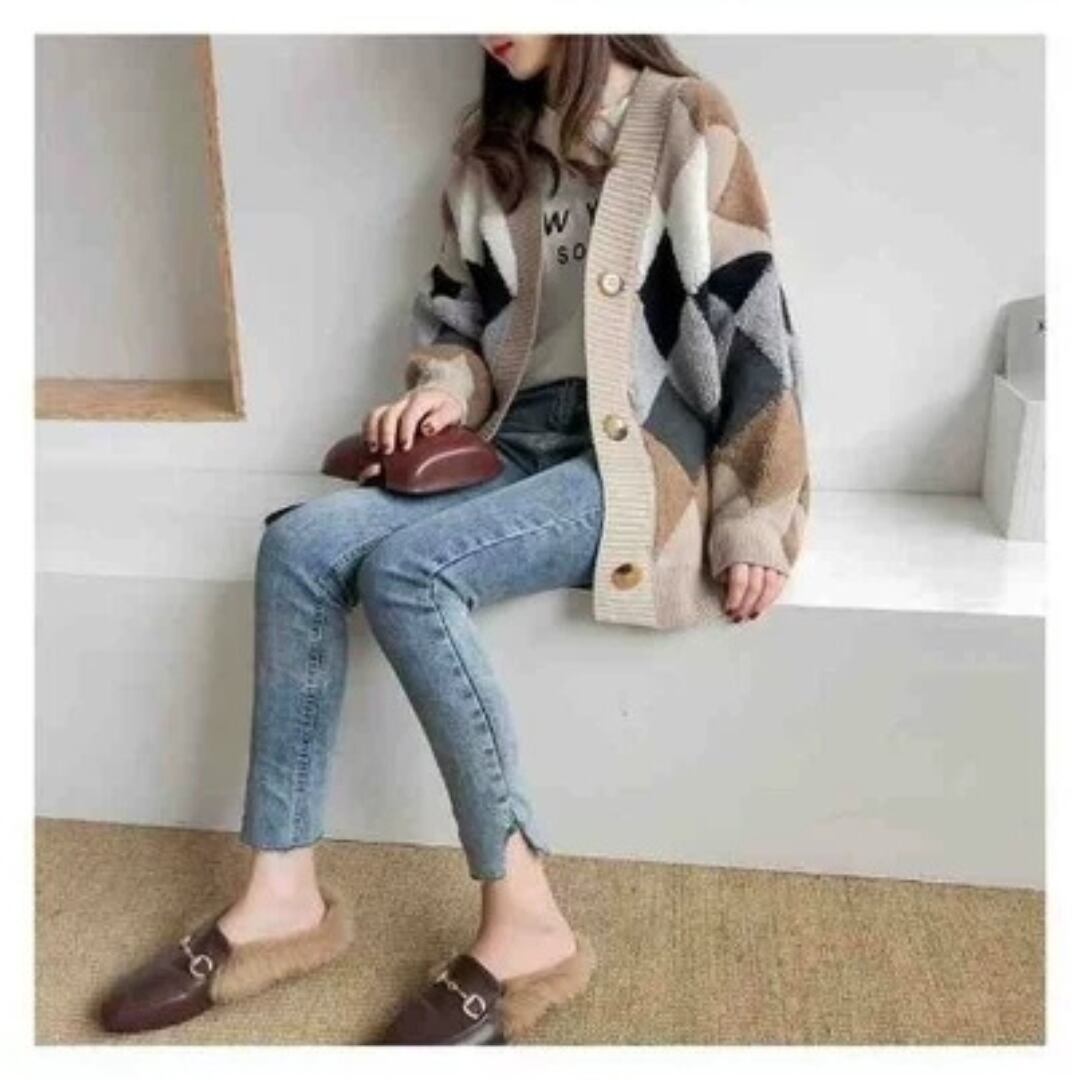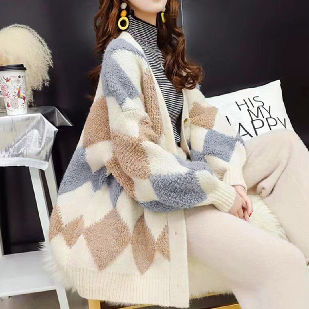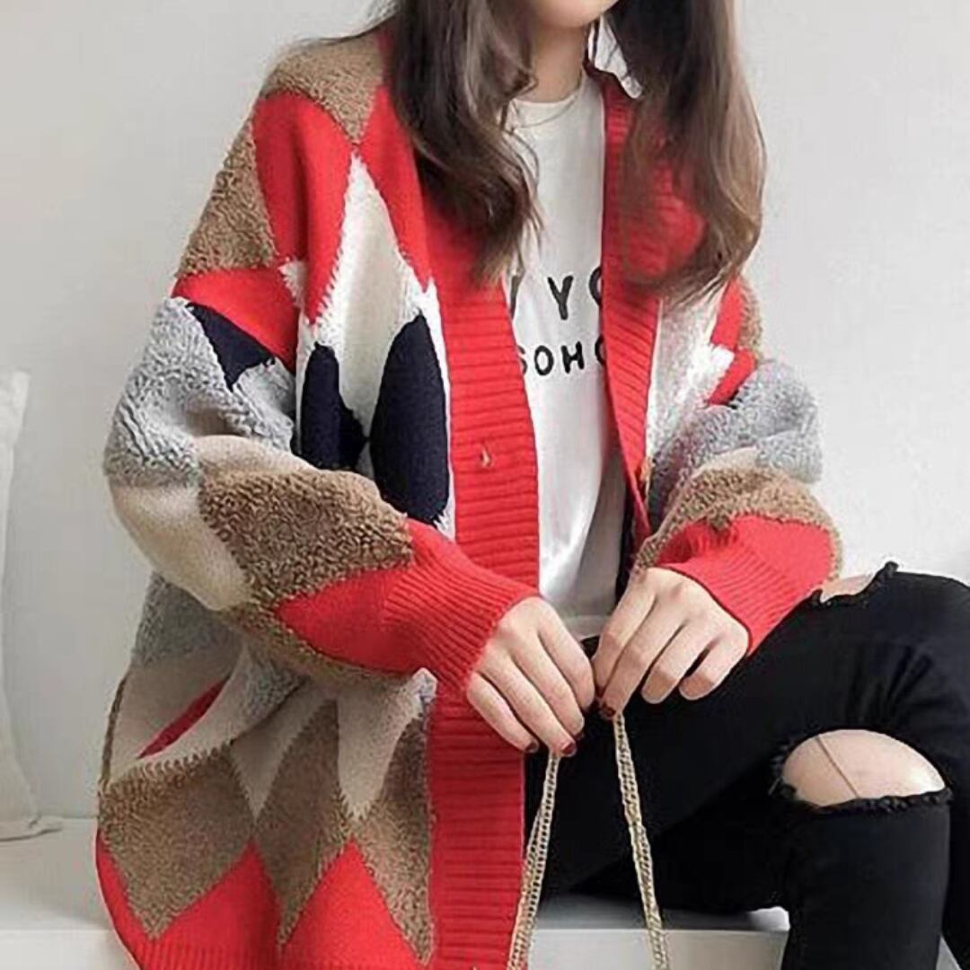 明るい配色のひし形チェック柄が浮き出るもこもこボアでアクセントになるカーディガン