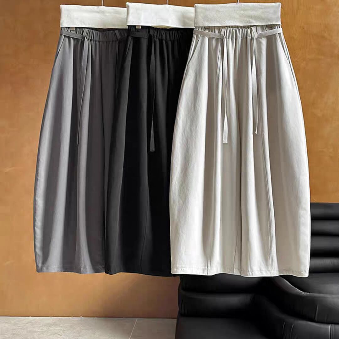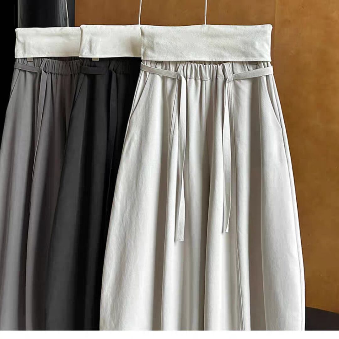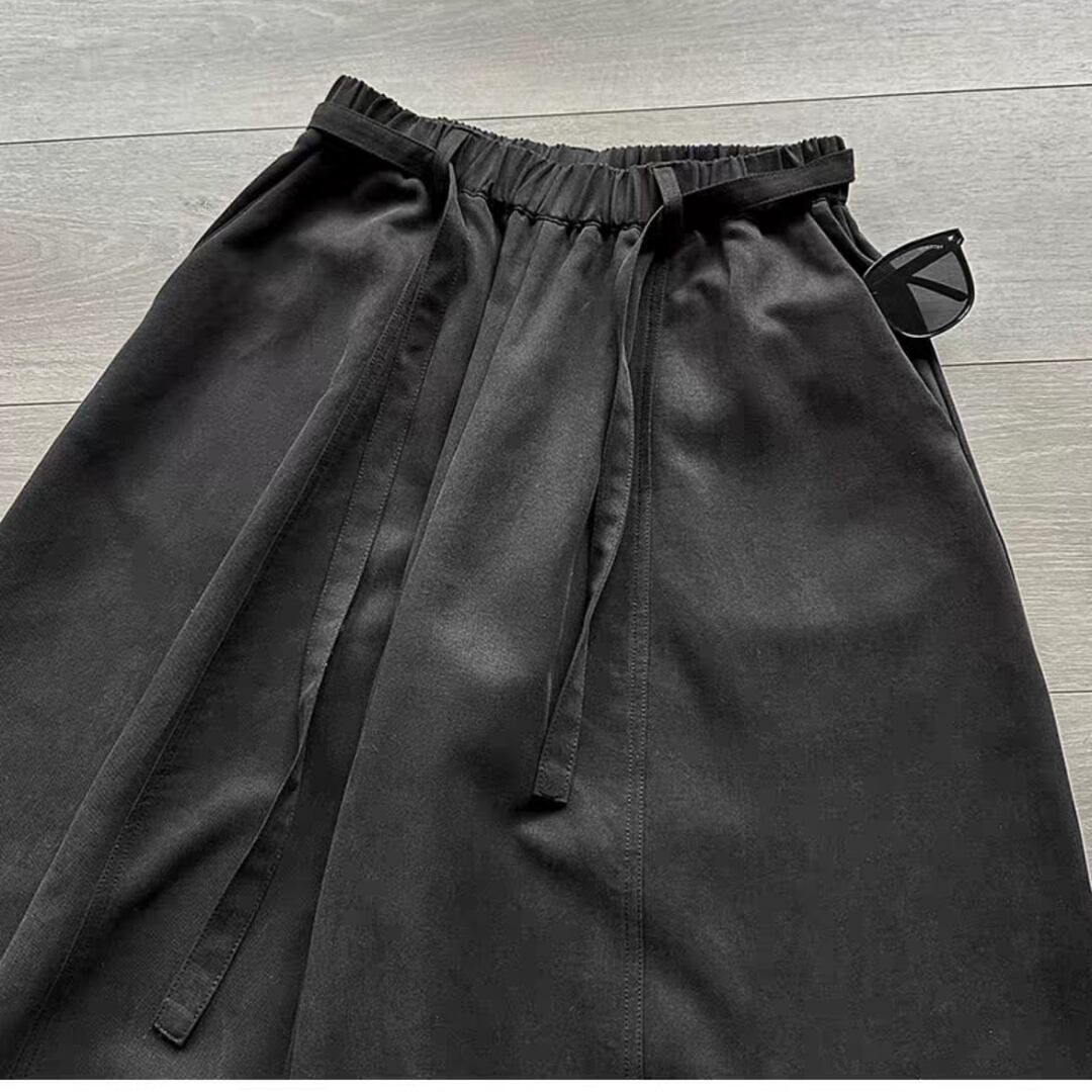 落ち感のある生地が美しいドレープを生み出し、体型を拾わずに上品な着こなしを叶えます。ウエストはゴム仕様に加え、共布リボンでサイズ調整が可能。