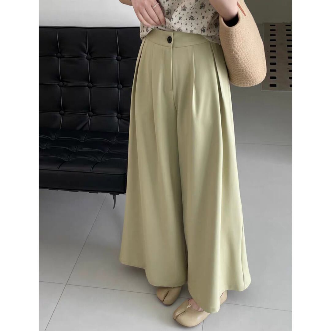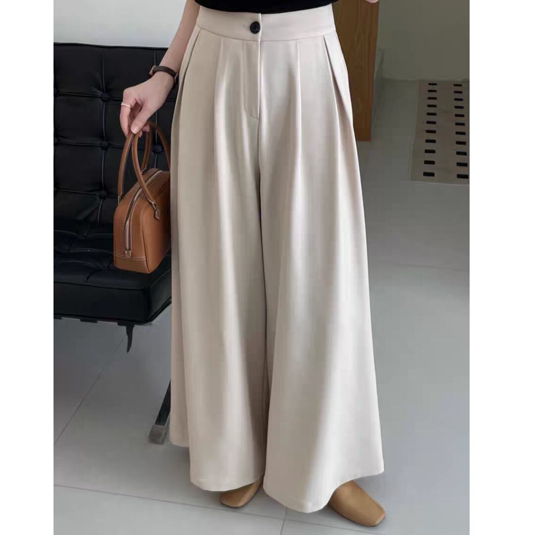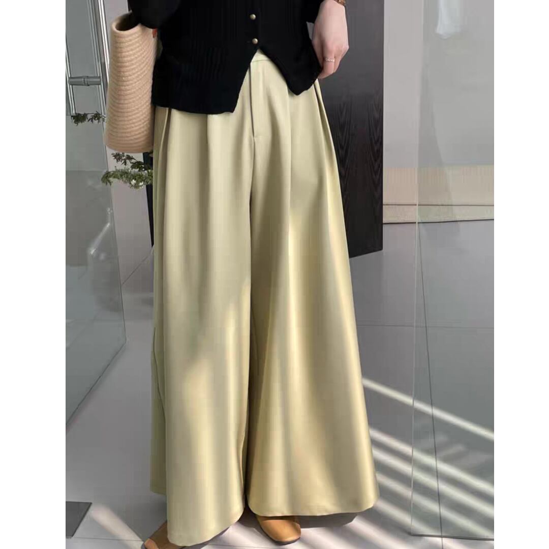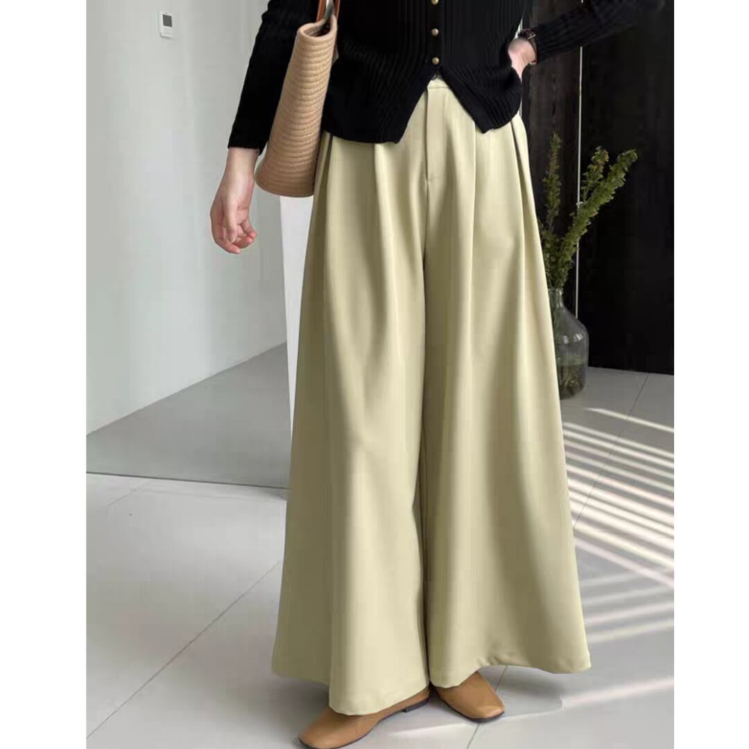 動きやすさと美しいシルエットを兼ね備えた、上品なタック入りワイドパンツです。