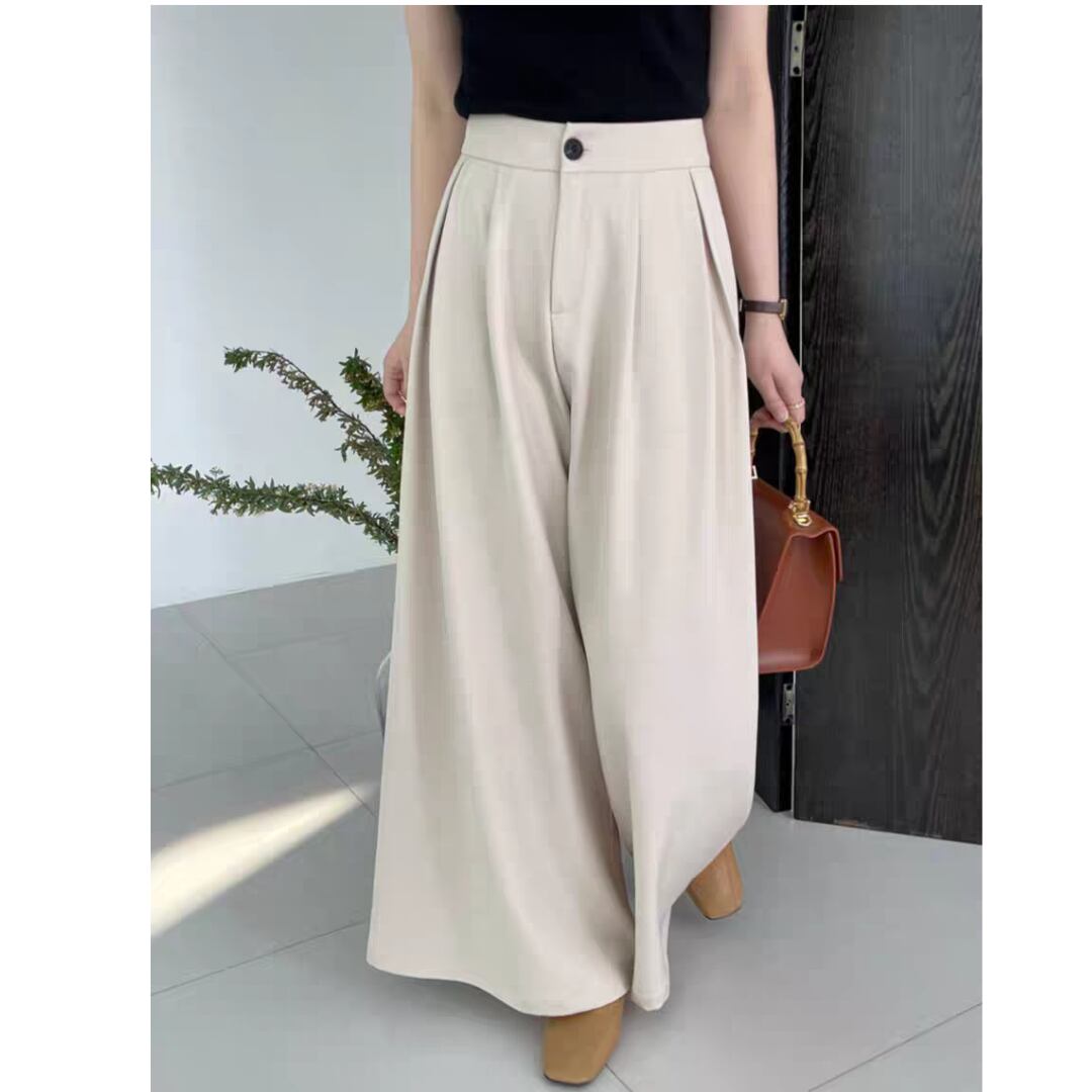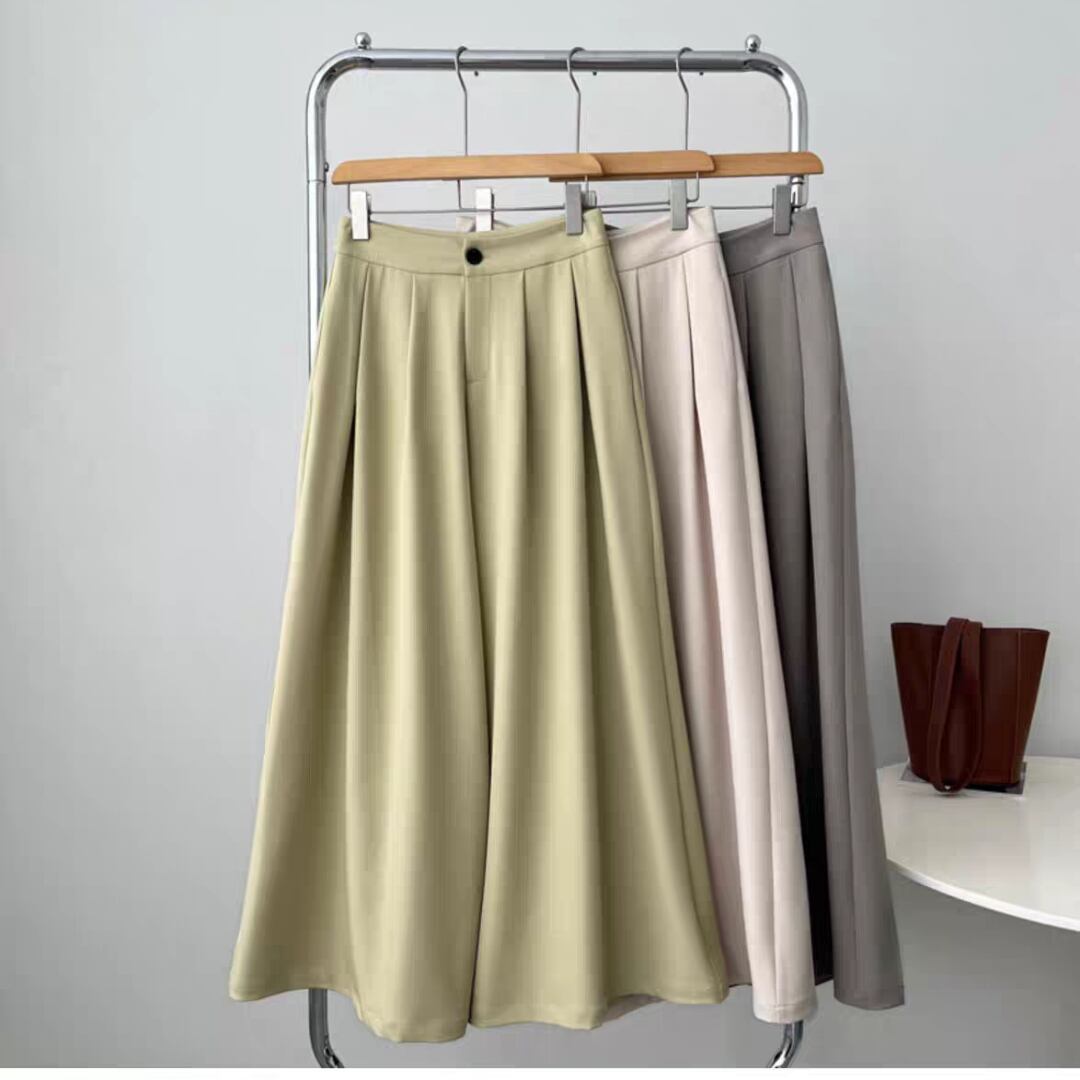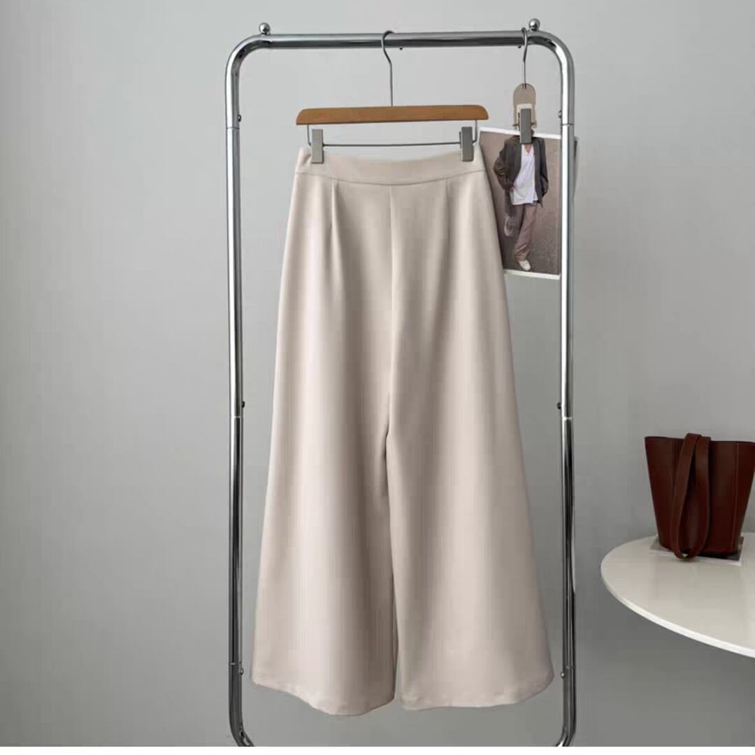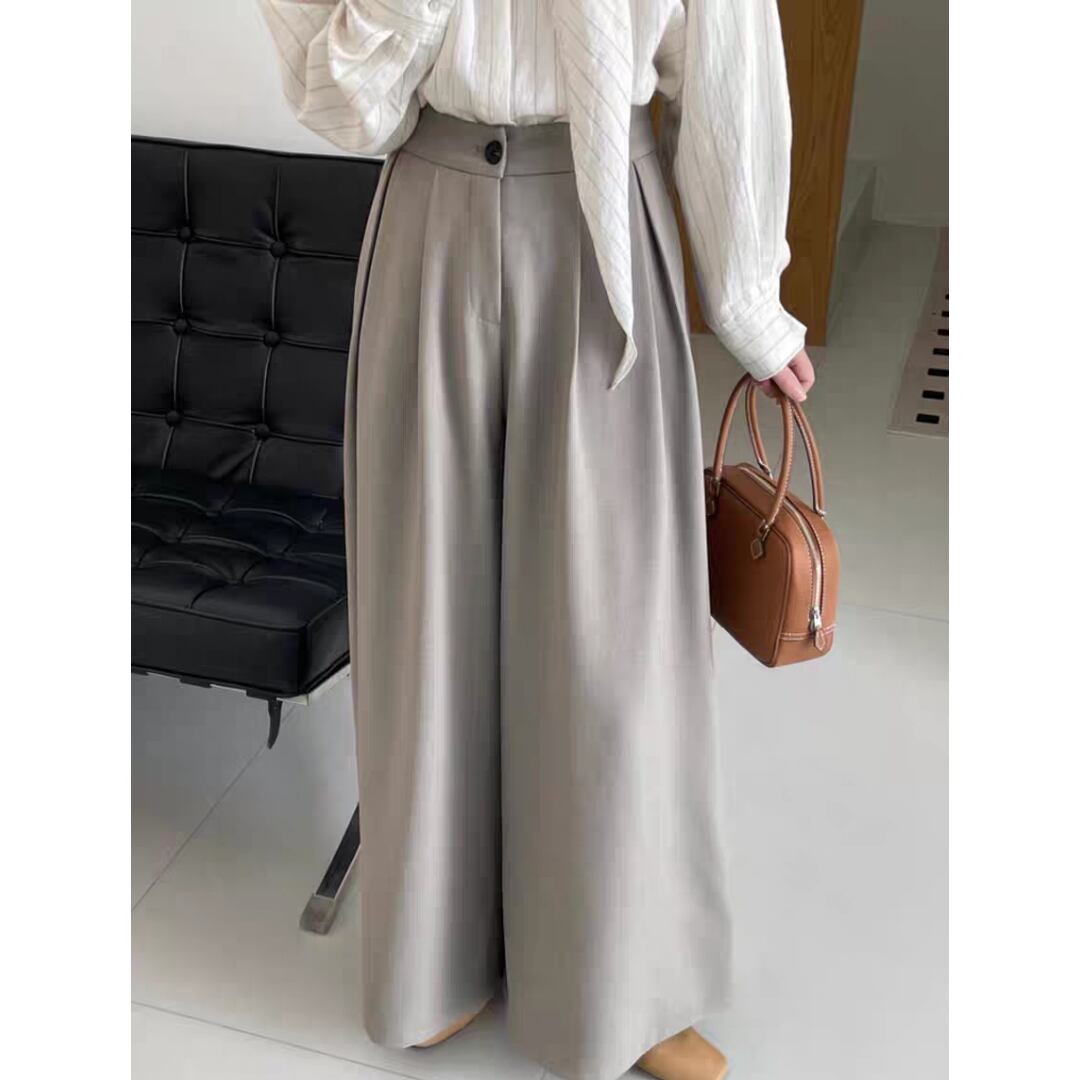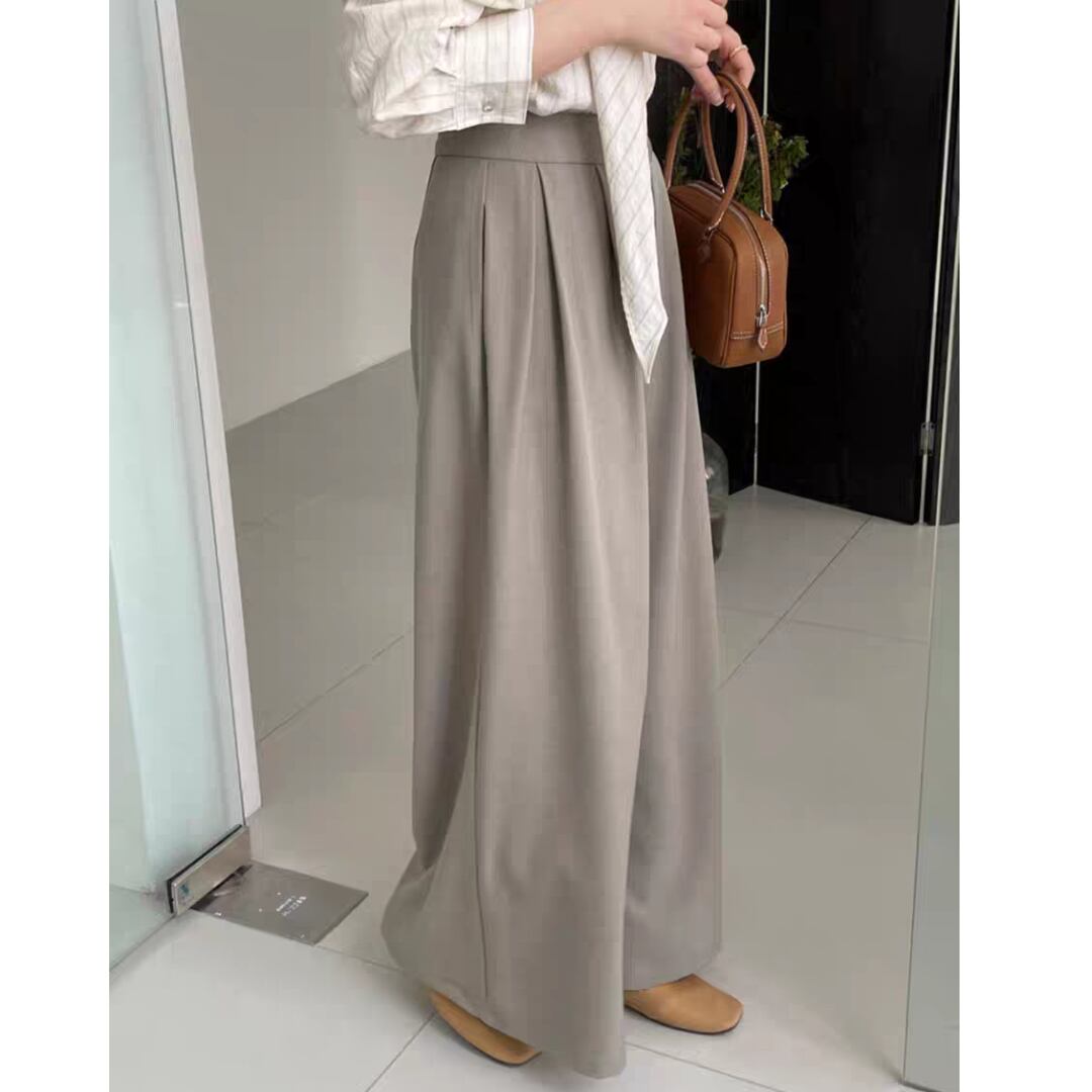 動きやすさと美しいシルエットを兼ね備えた、上品なタック入りワイドパンツです。