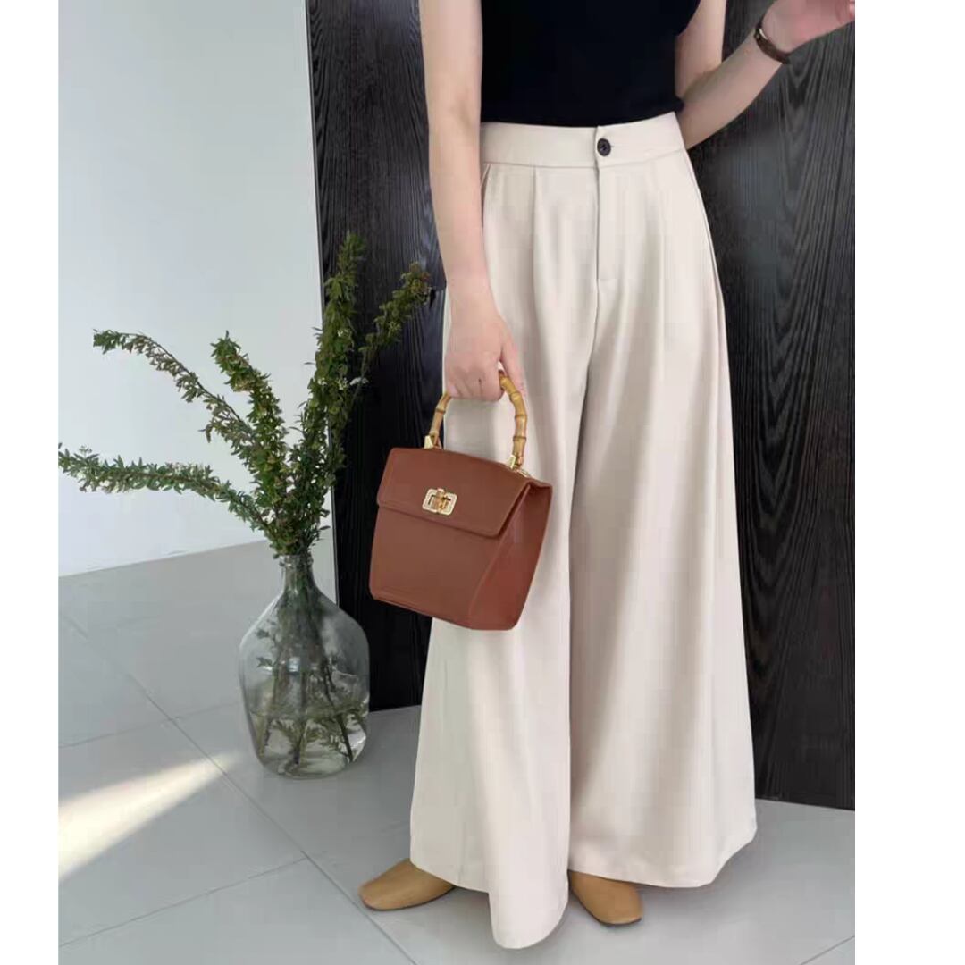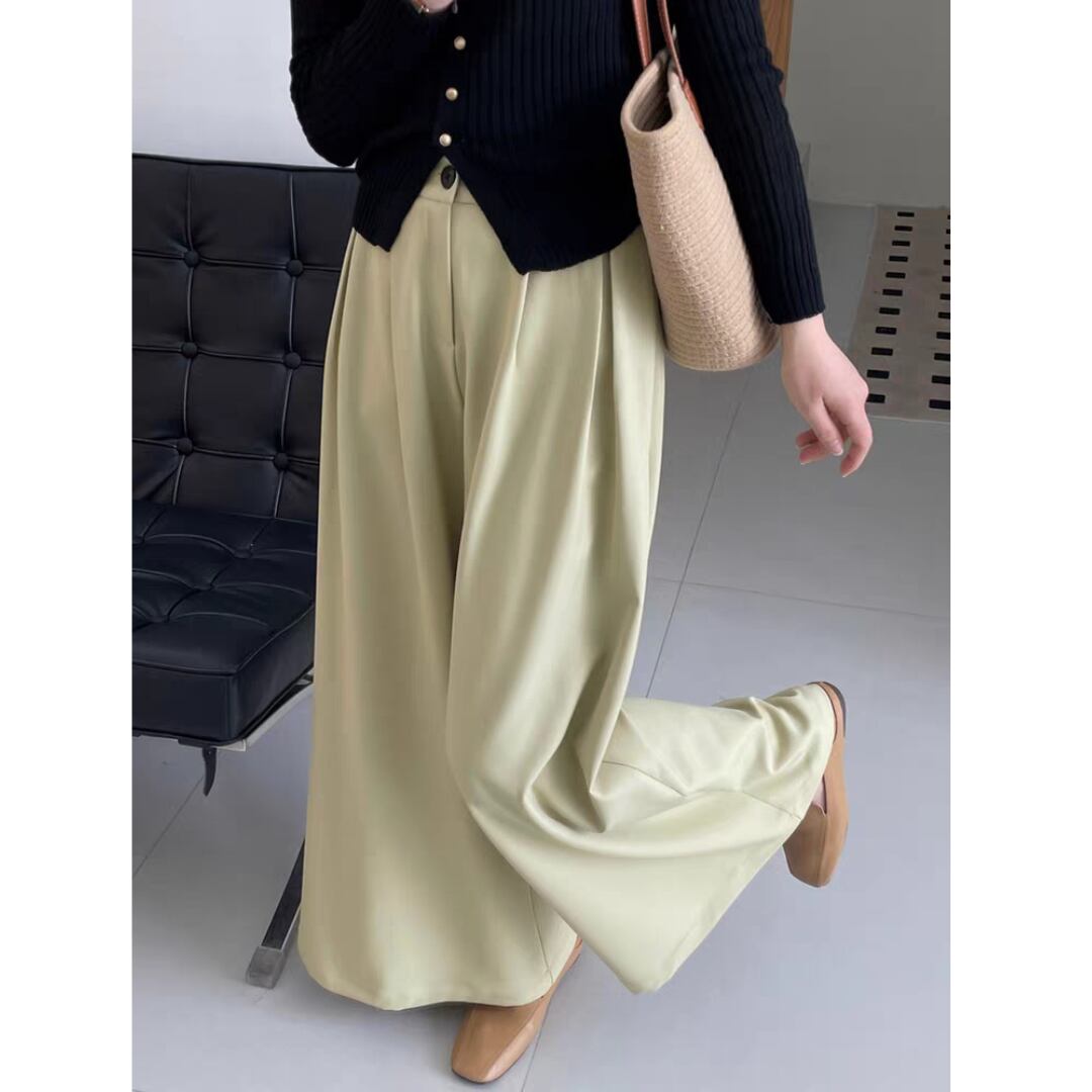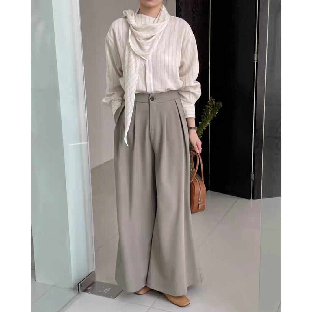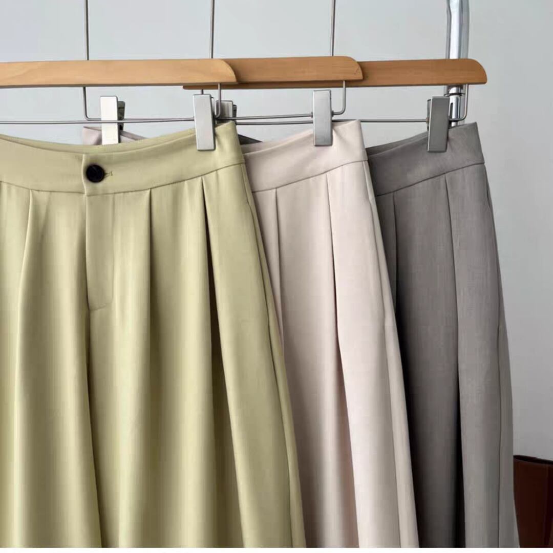 動きやすさと美しいシルエットを兼ね備えた、上品なタック入りワイドパンツです。