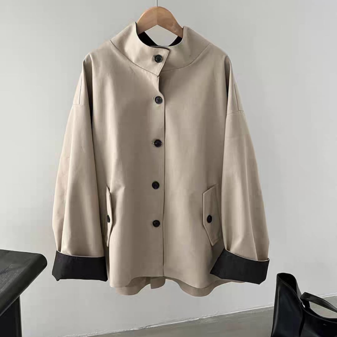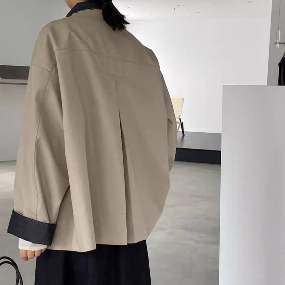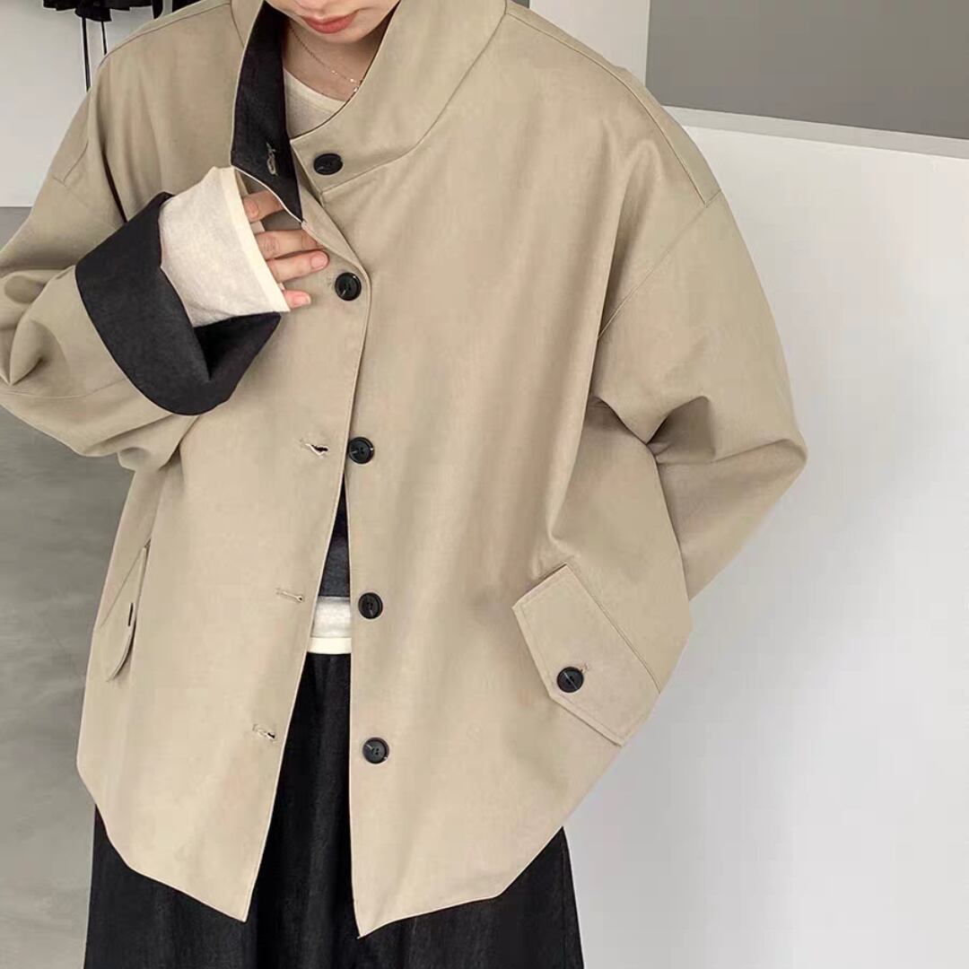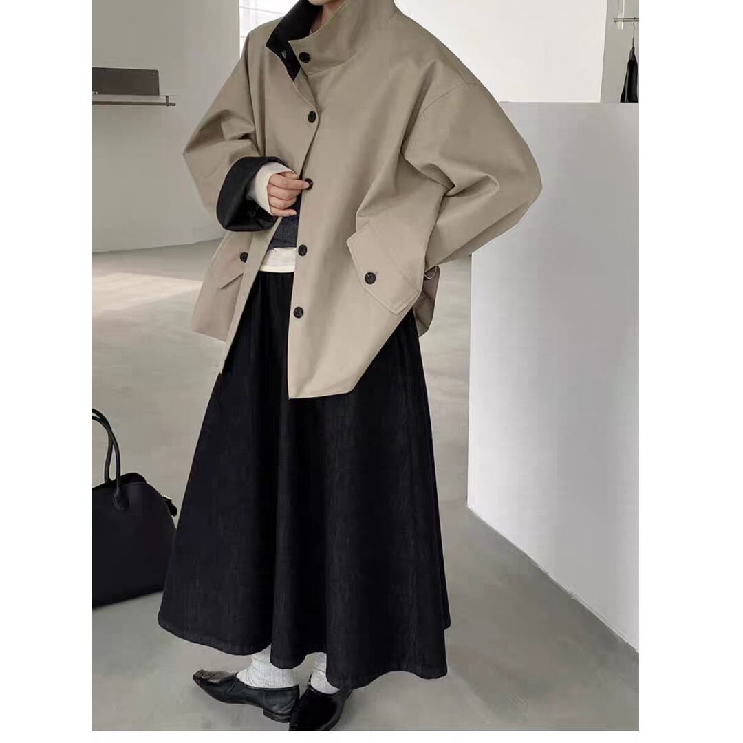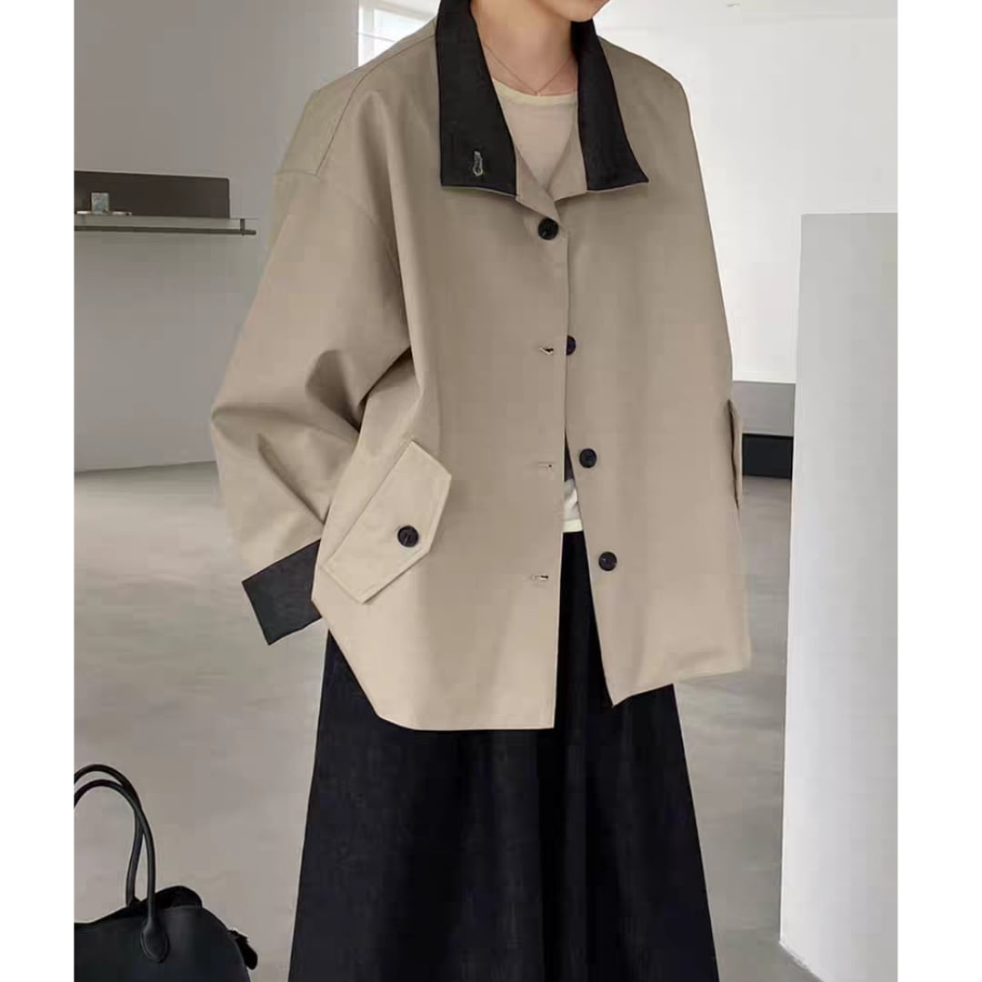 配色のスタンドカラーと袖裏の折り返しデザインがアクセントになり、シンプルながらも洗練された大人の印象に。