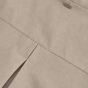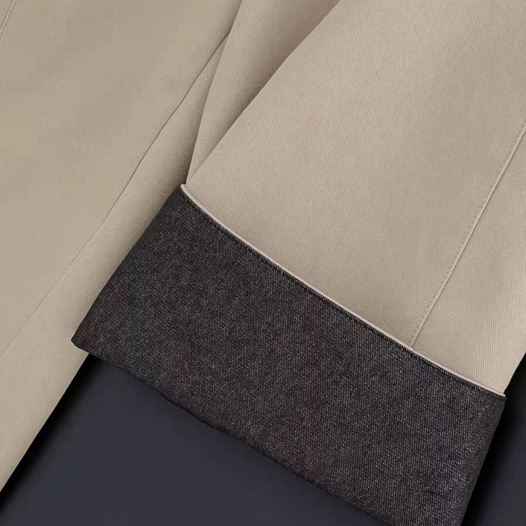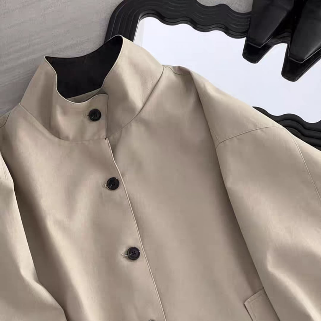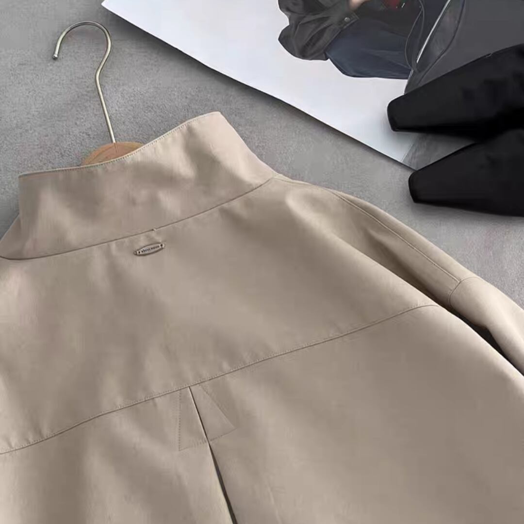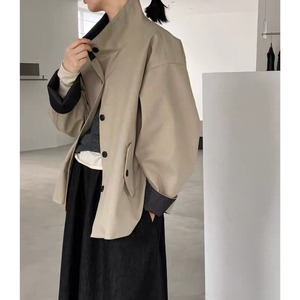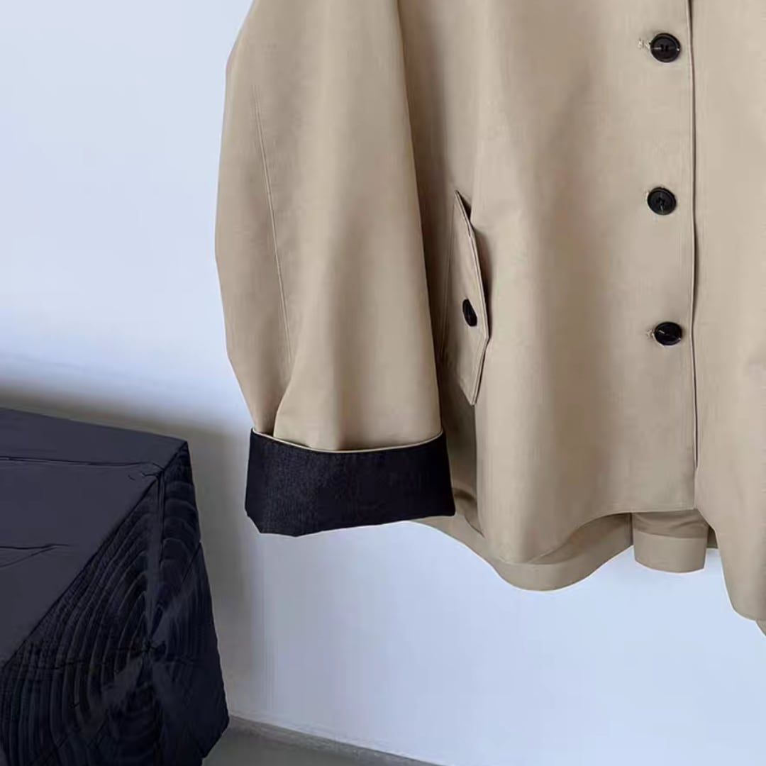 配色のスタンドカラーと袖裏の折り返しデザインがアクセントになり、シンプルながらも洗練された大人の印象に。
