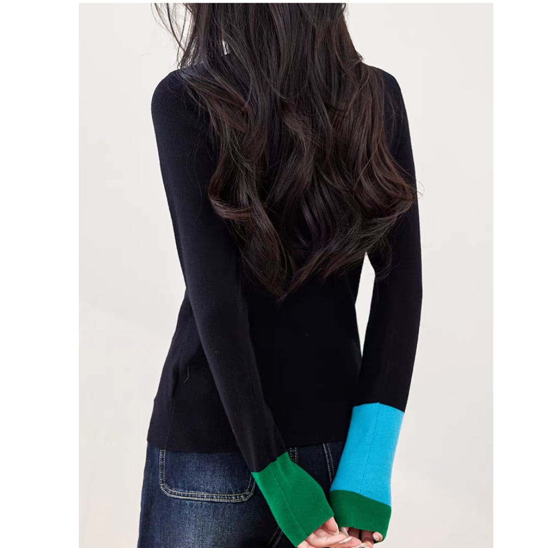 シンプルなブラックニットに、袖口のグリーン×ブルーがアクセントになったモードな一枚。