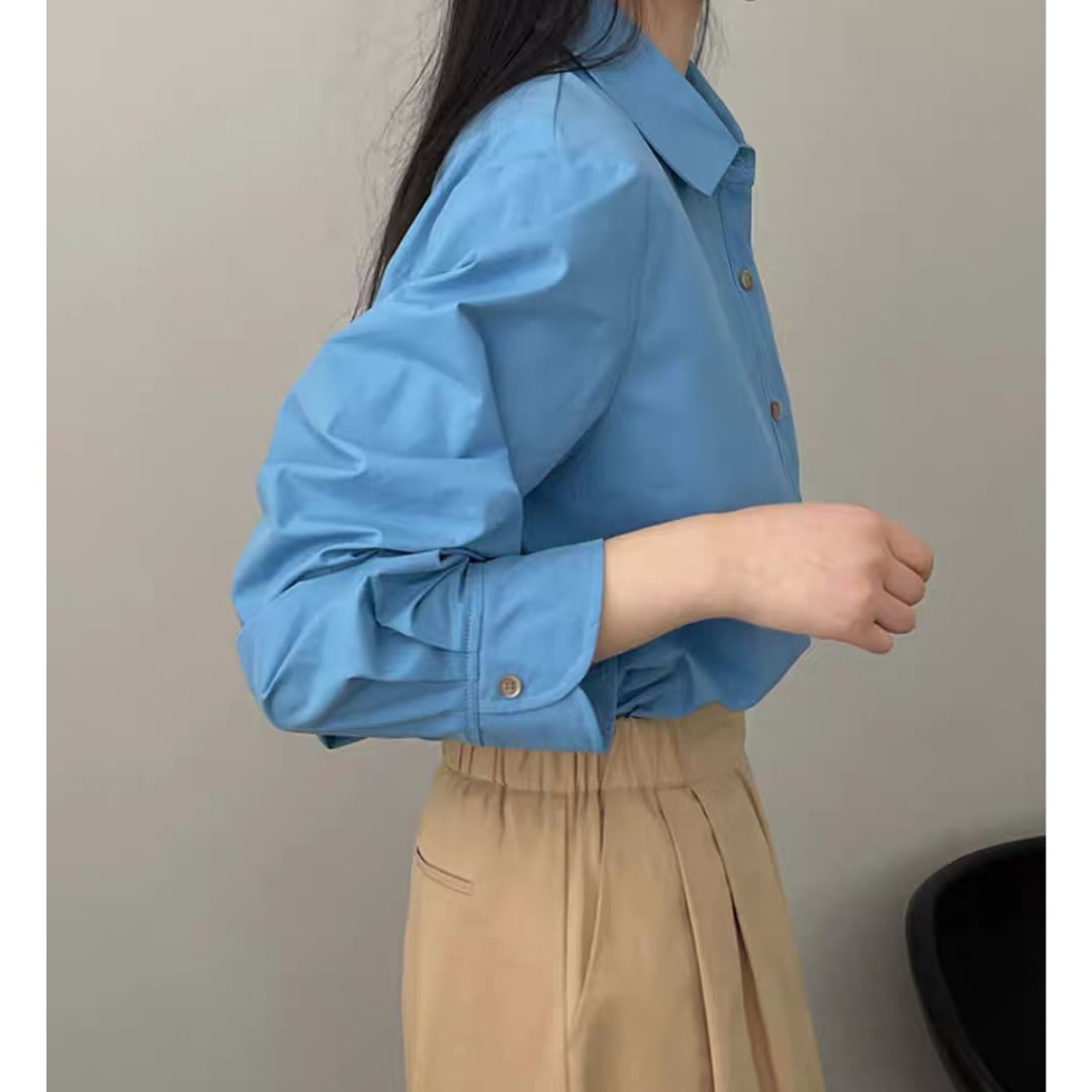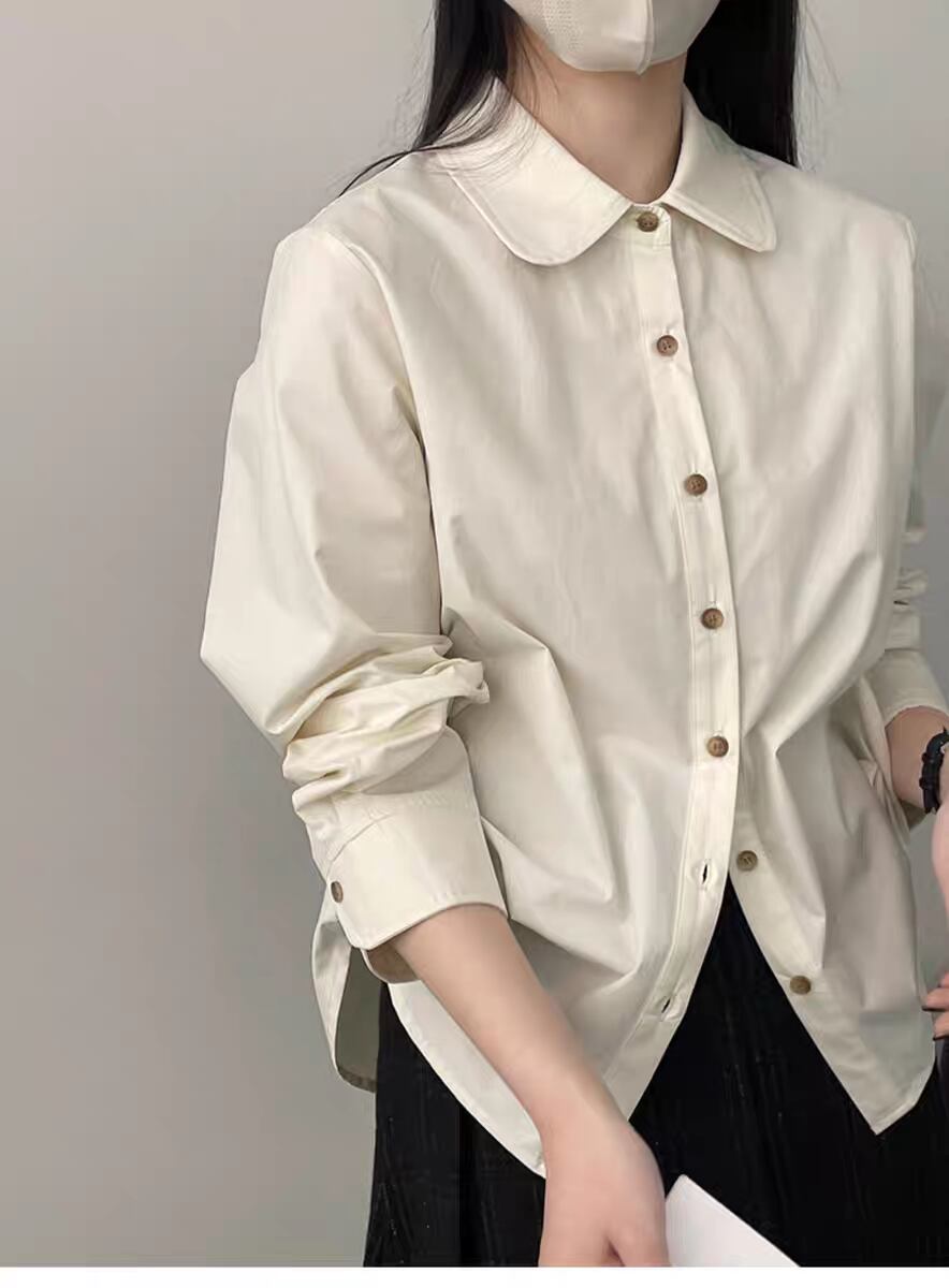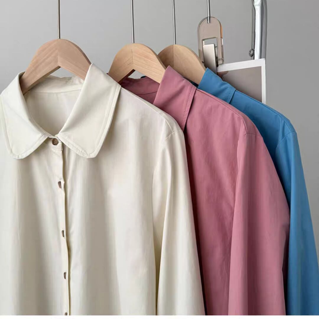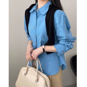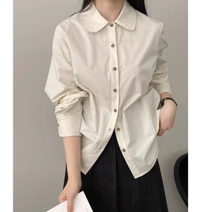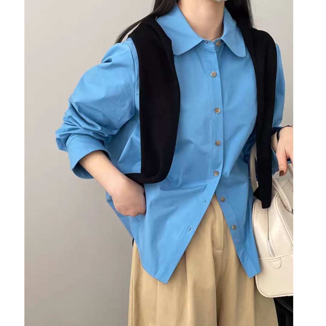 丸みのある襟とシンプルなボタンデザインが、ほんのりフェミニンな雰囲気をプラスします。ジャケットやカーディガンのインナーとしても映え、ボトムス次第でカジュアルにもきれいめにも着こなし可能。