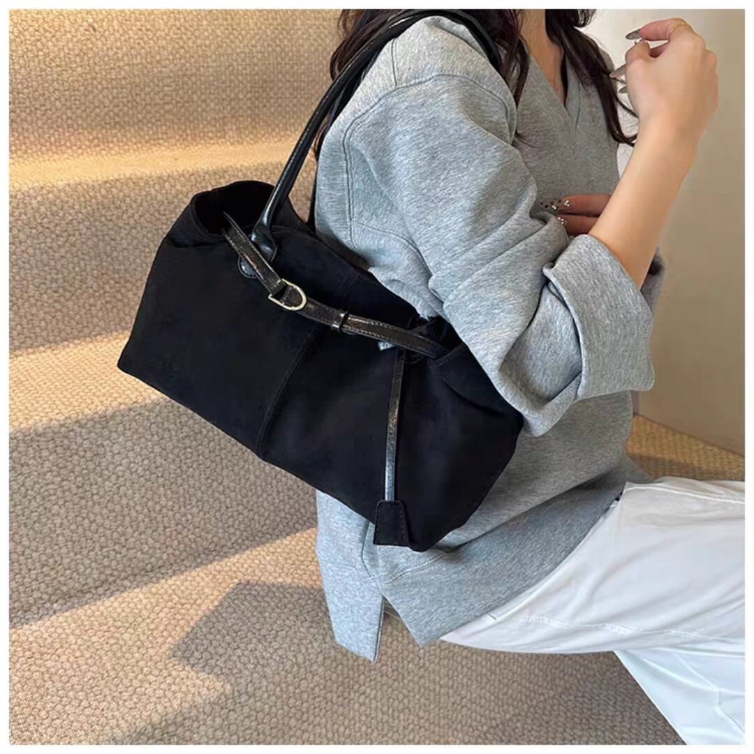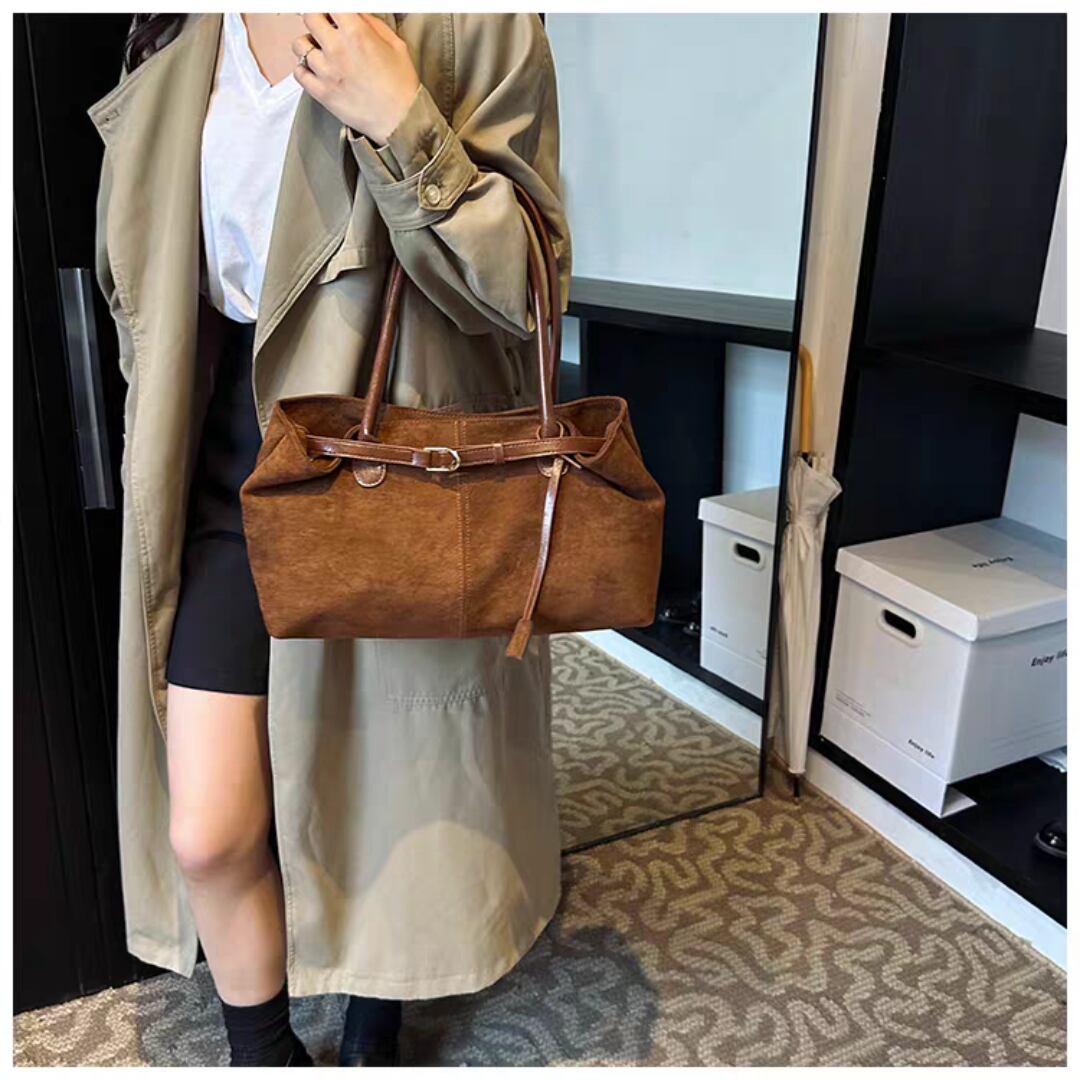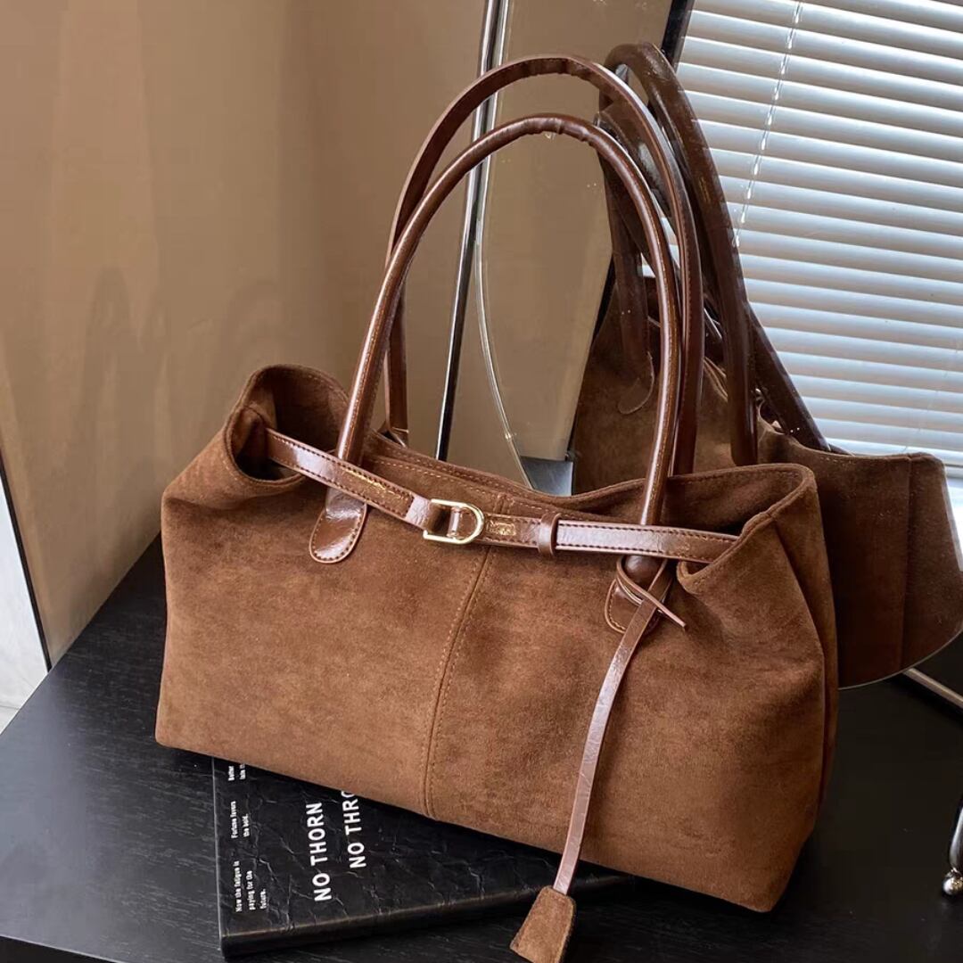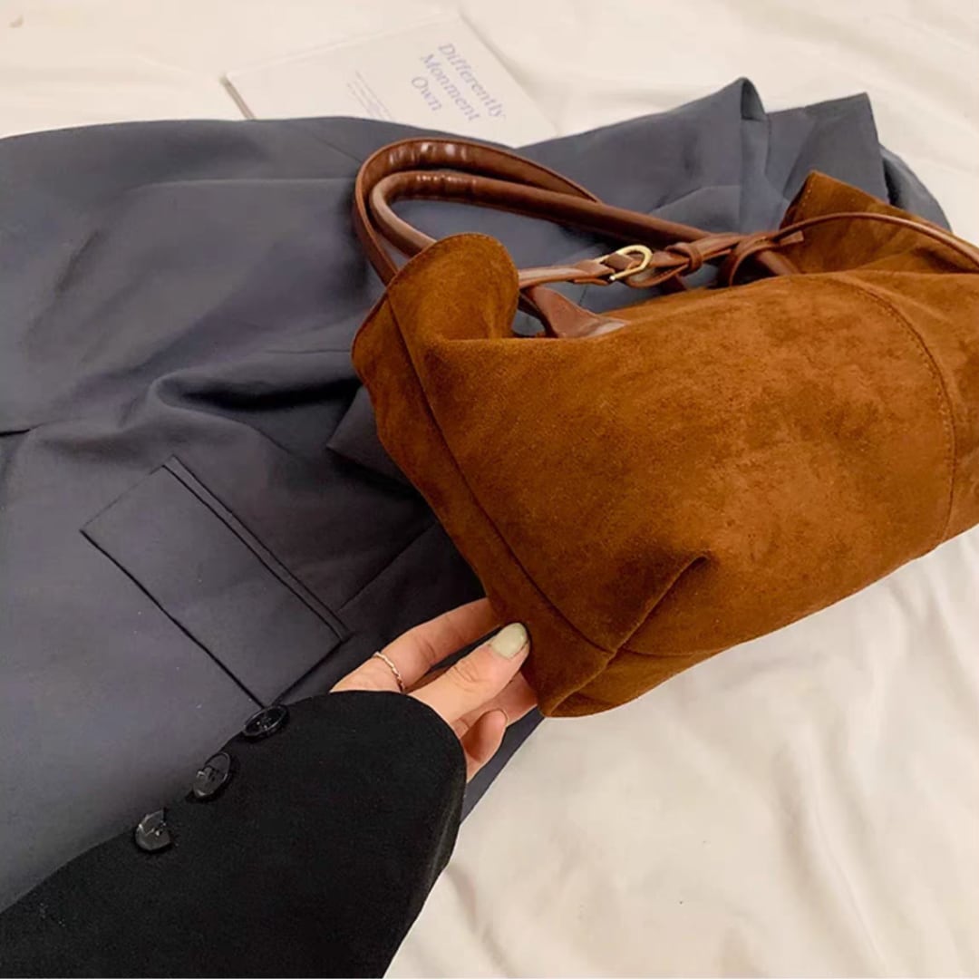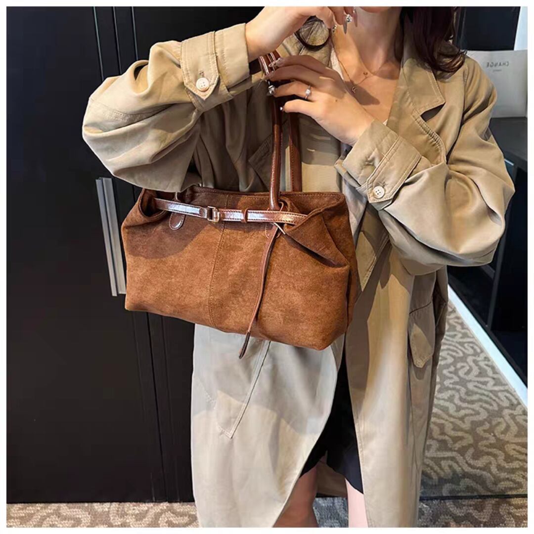 上品なスエード調PU素材で仕立てたショルダーバッグ。