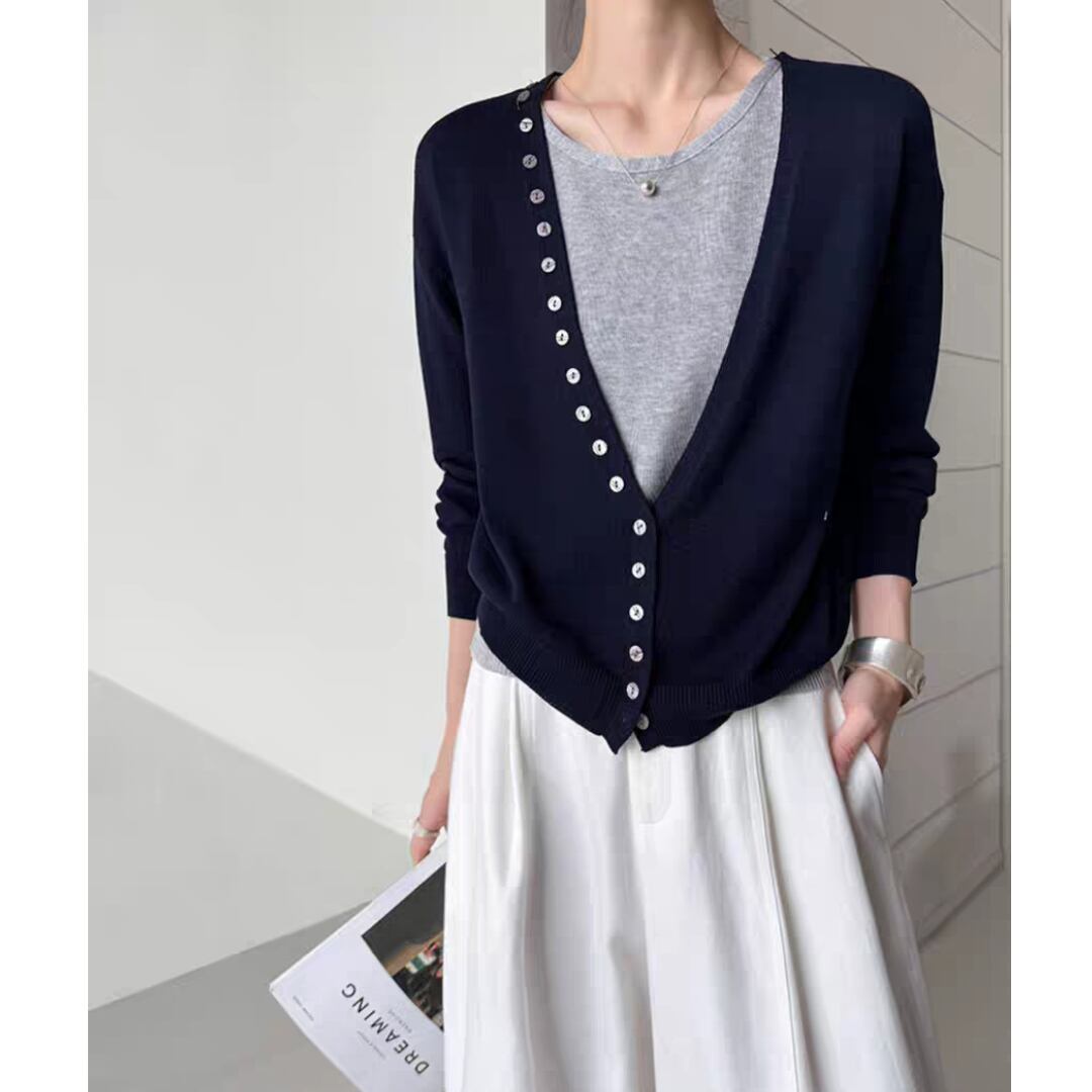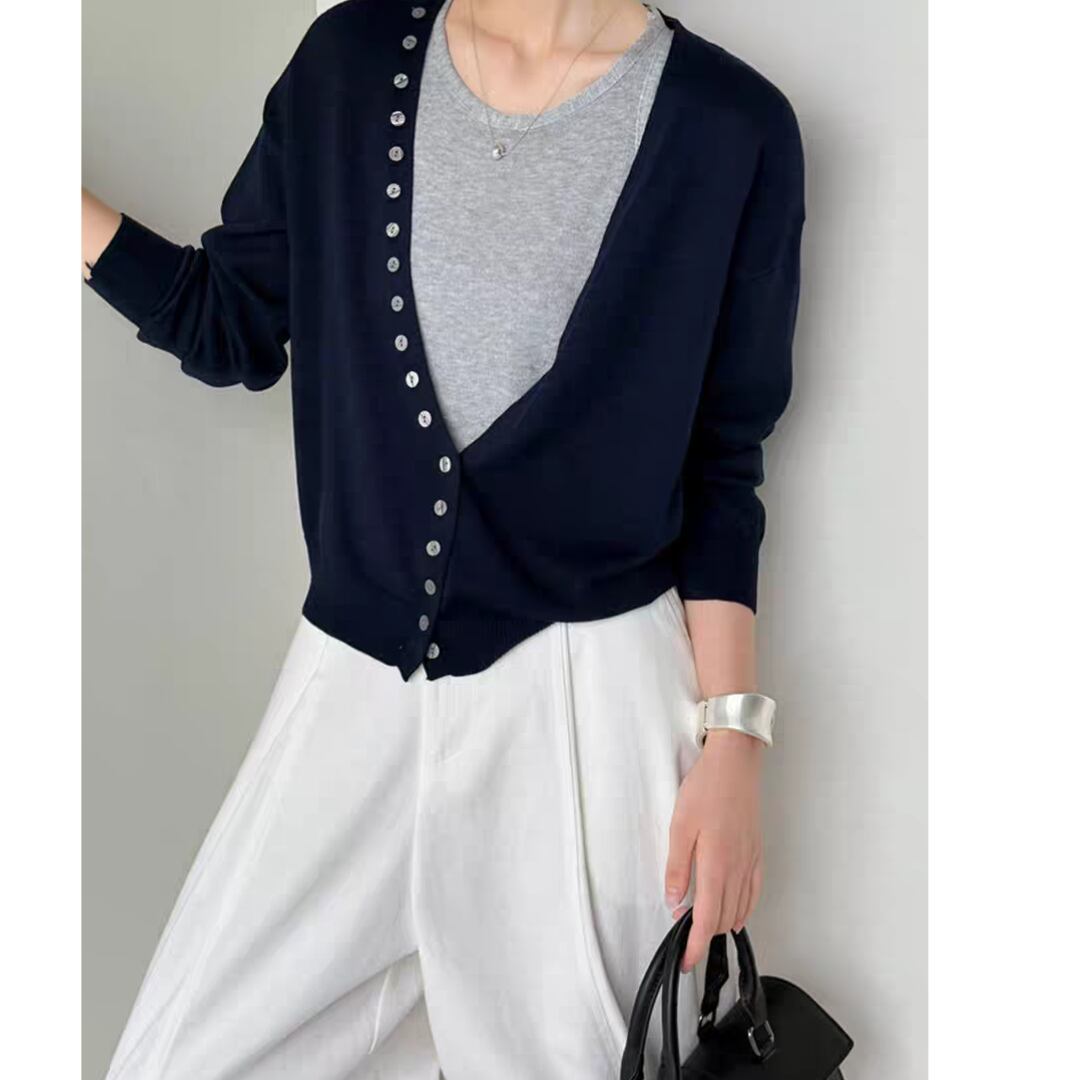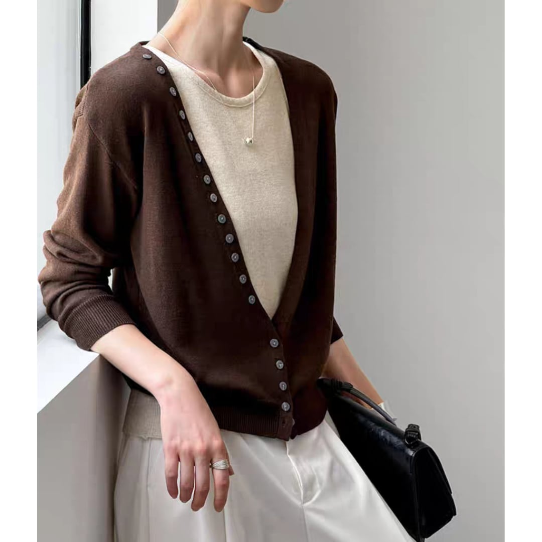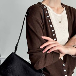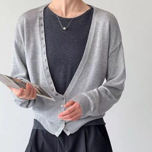 カーディガンは深めのVネックに並んだボタンがポイント。