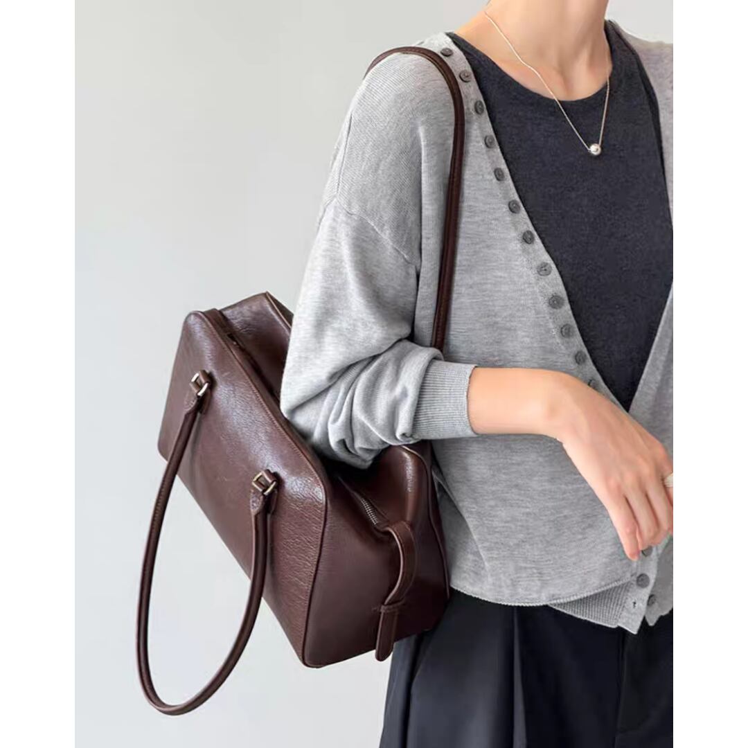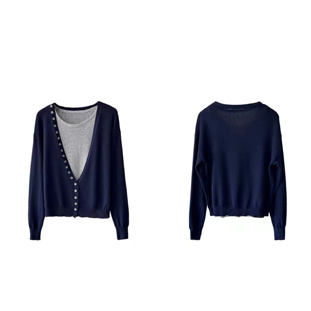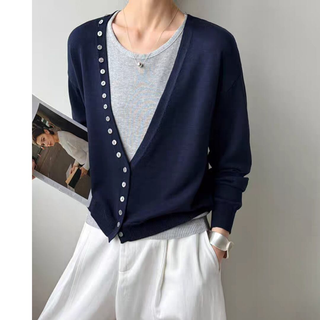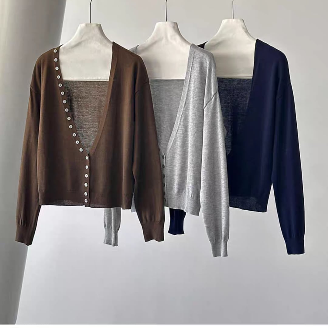 カーディガンは深めのVネックに並んだボタンがポイント。