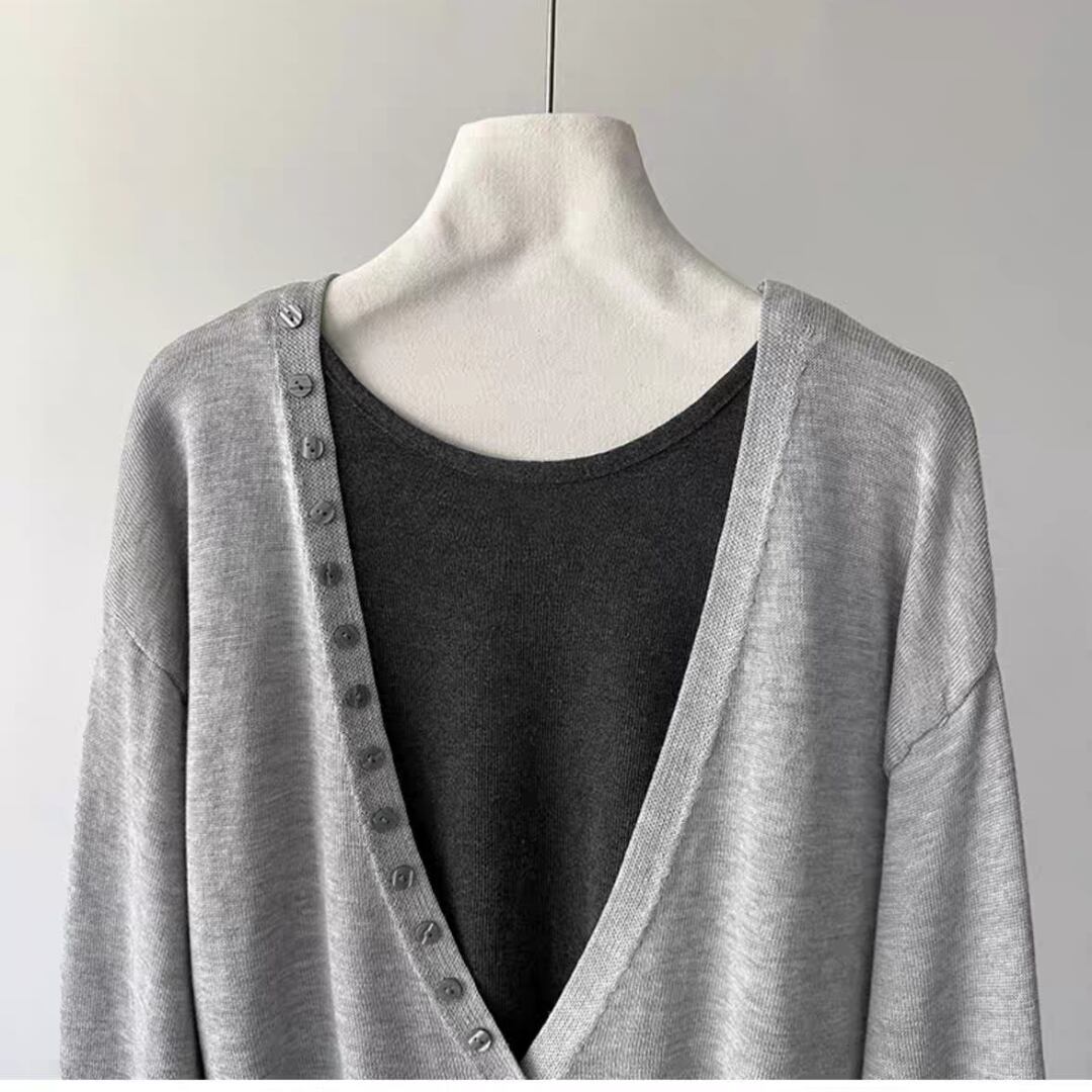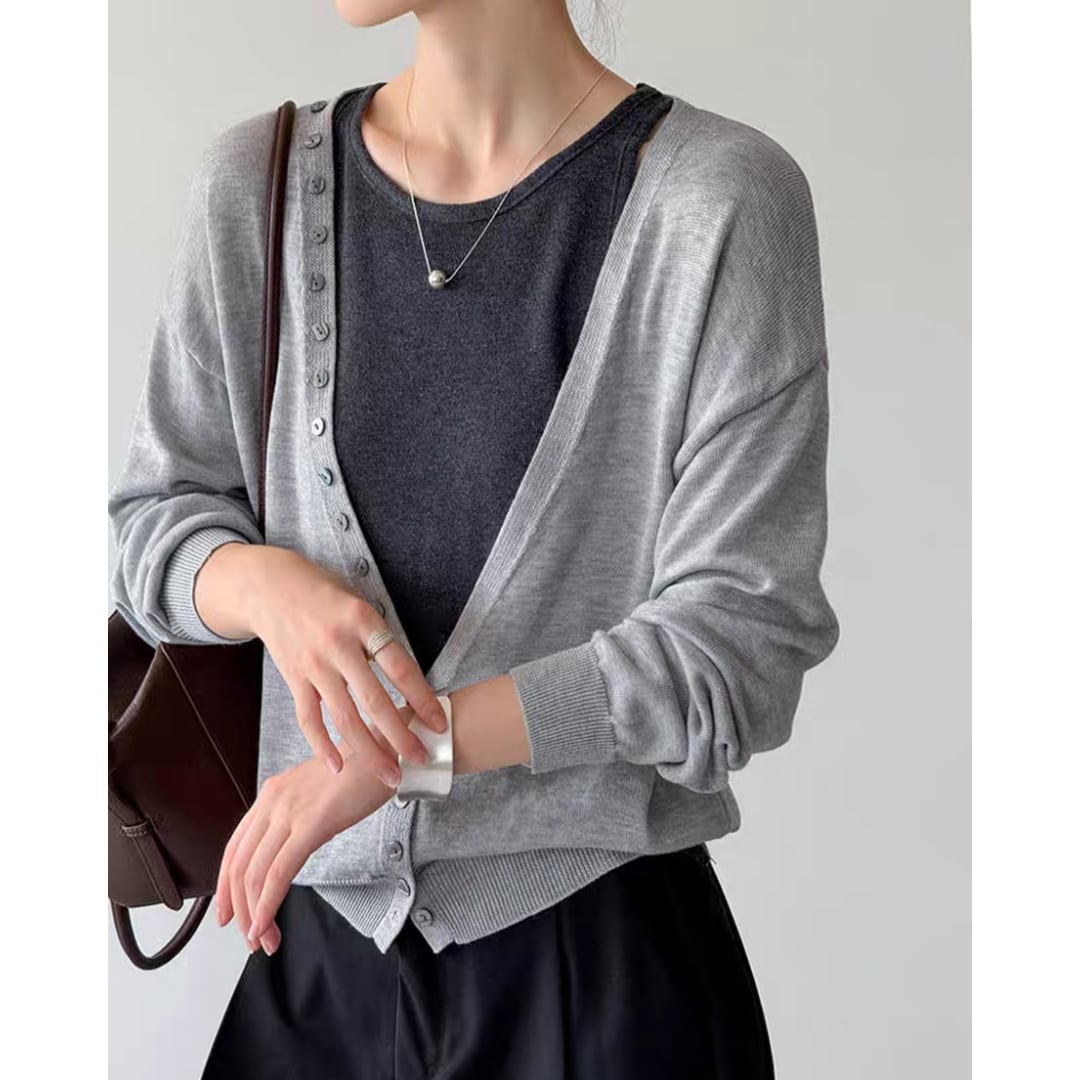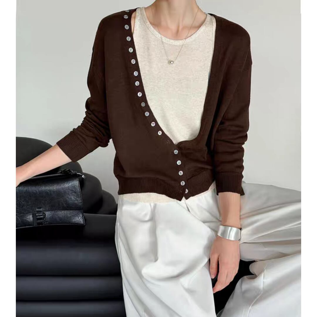 シンプルながらも洗練されたレイヤードスタイルが完成する、タンクトップ風ニットとVネックカーディガンの2点セット。