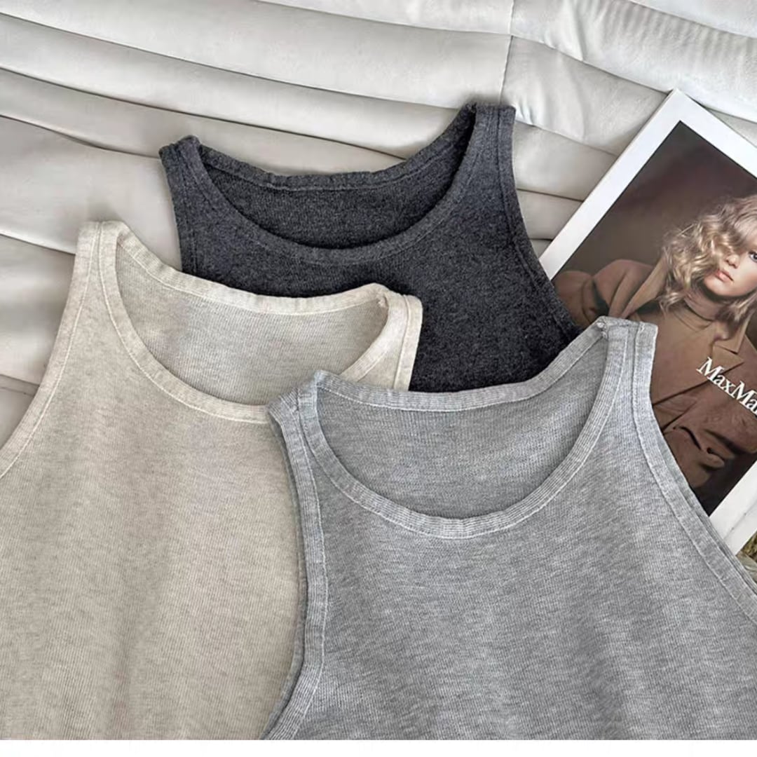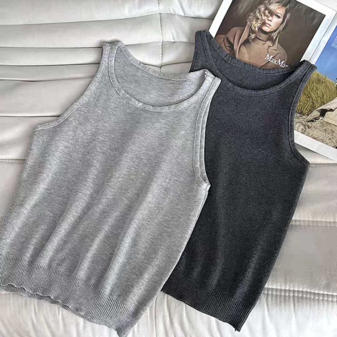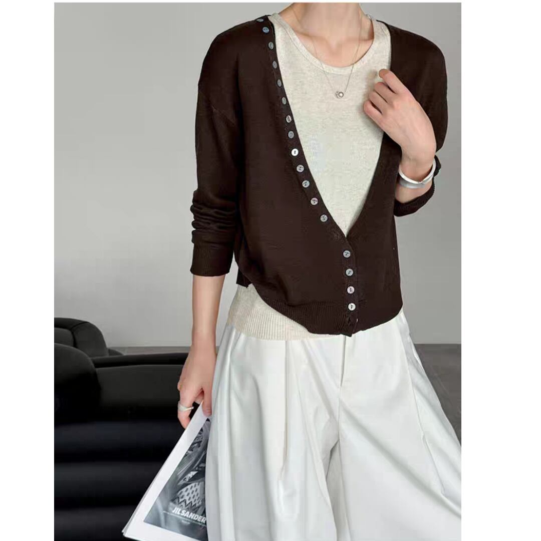 シンプルながらも洗練されたレイヤードスタイルが完成する、タンクトップ風ニットとVネックカーディガンの2点セット。