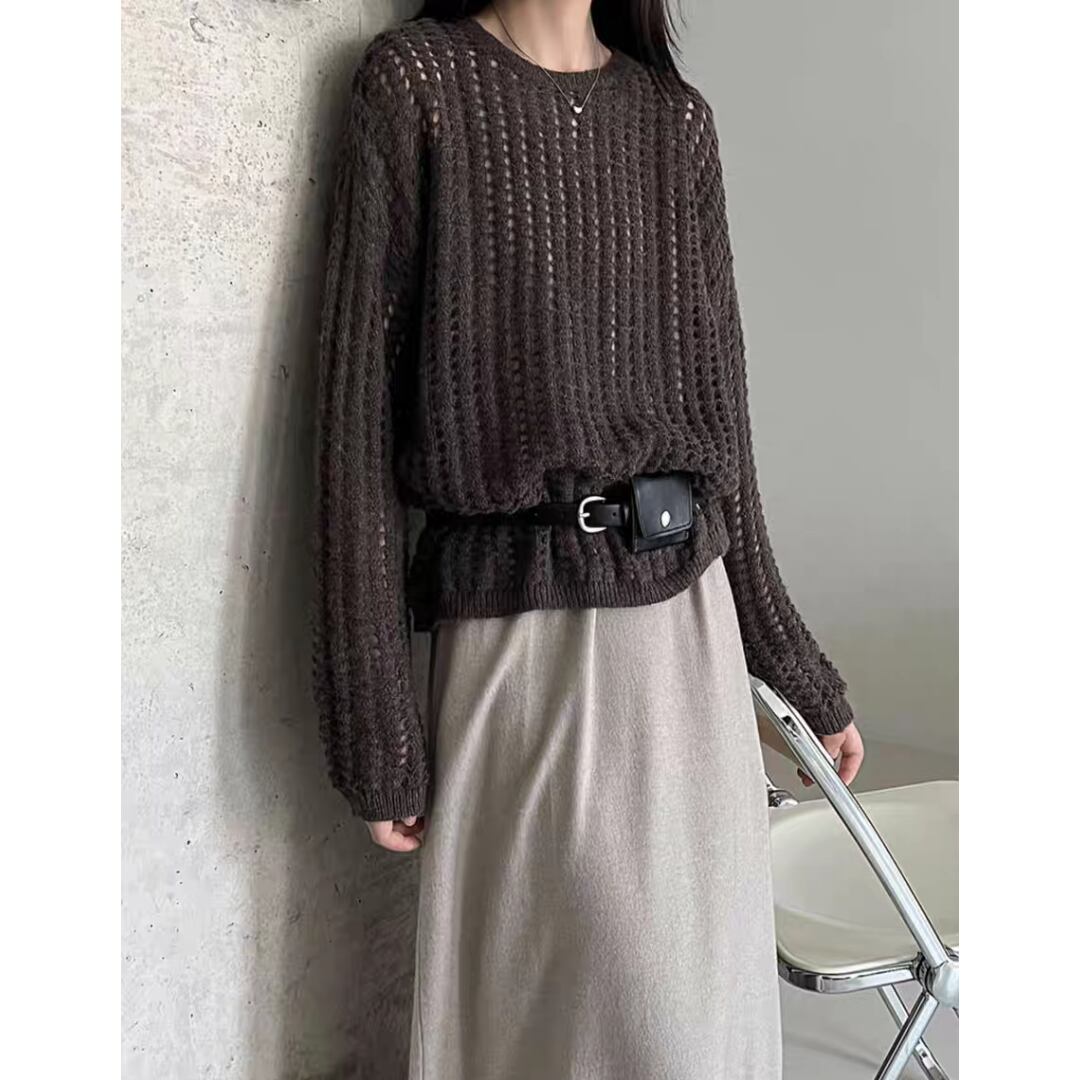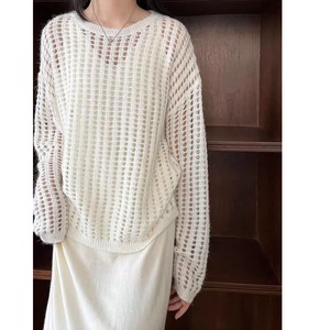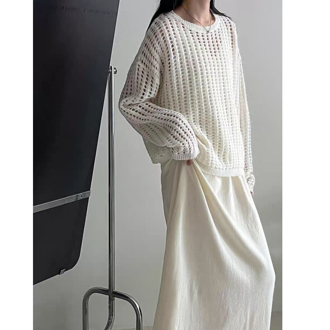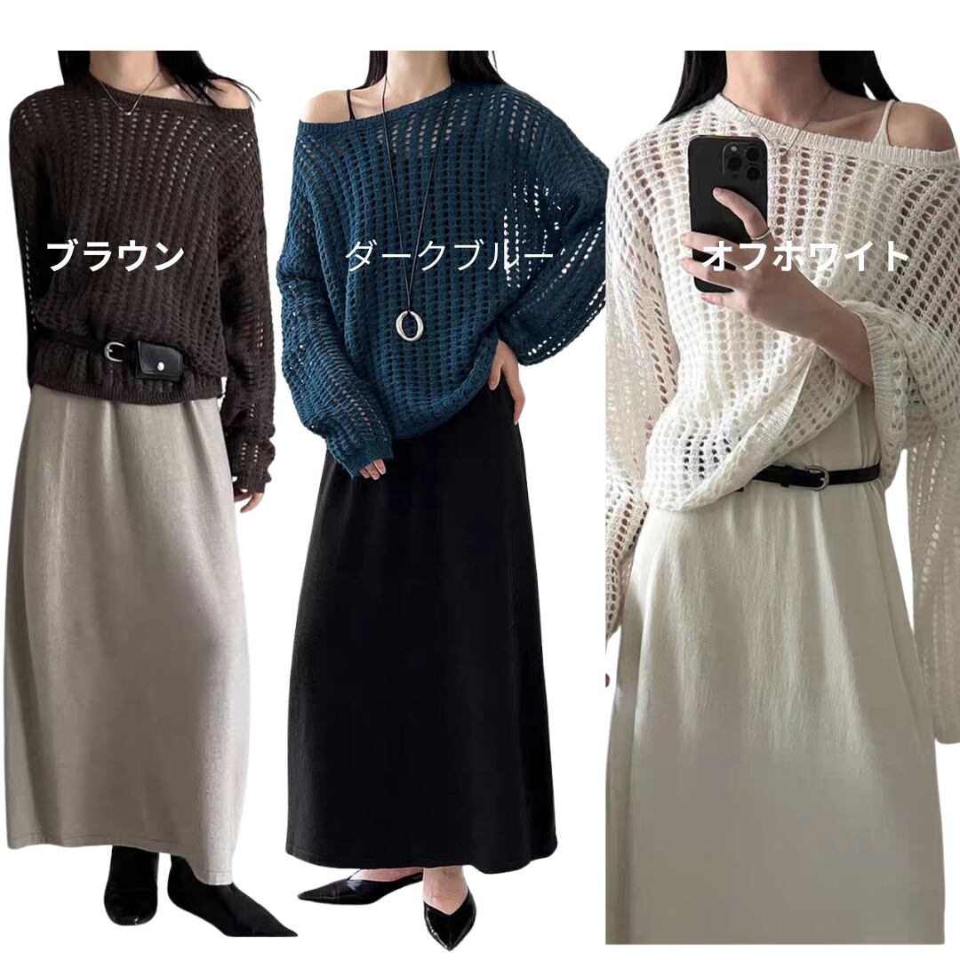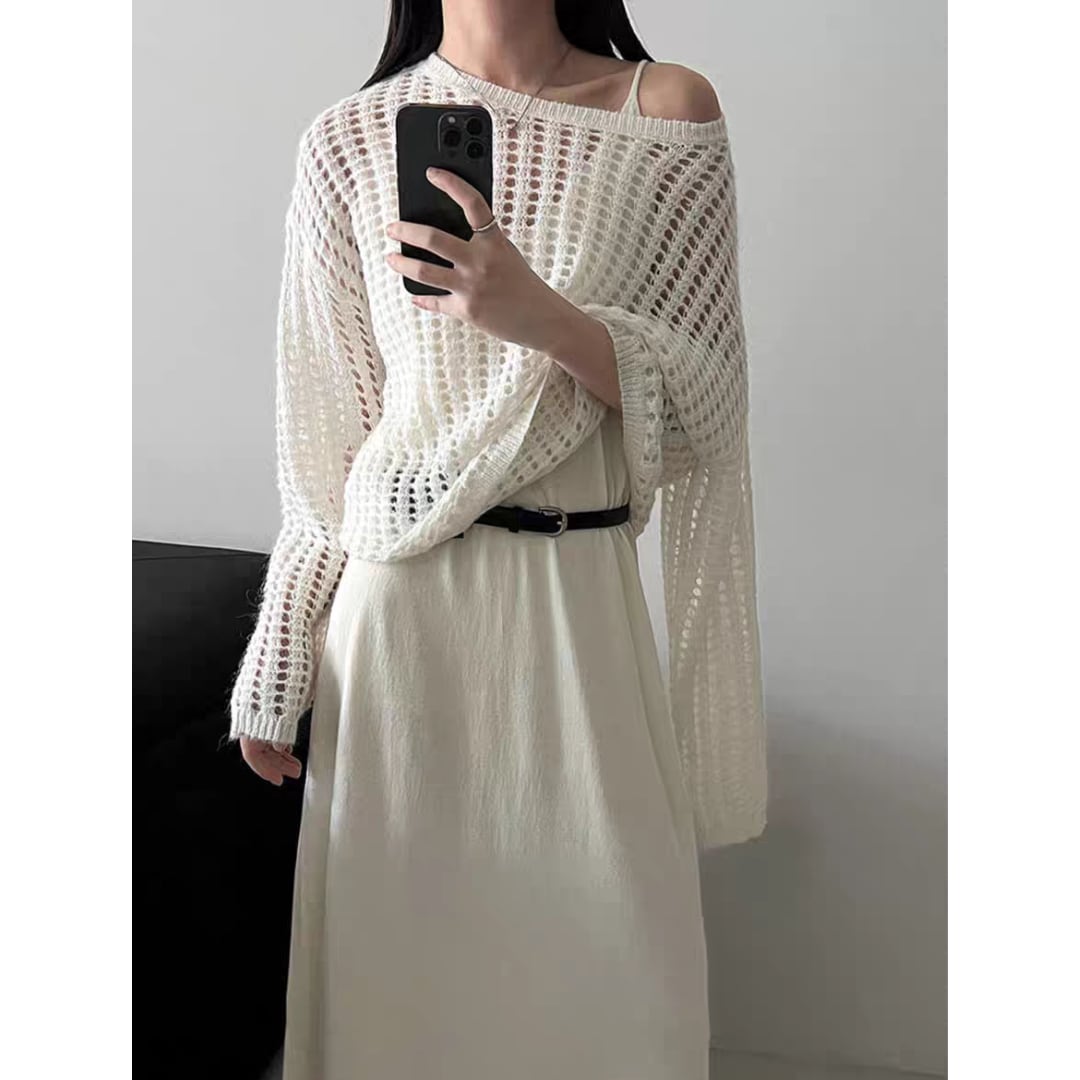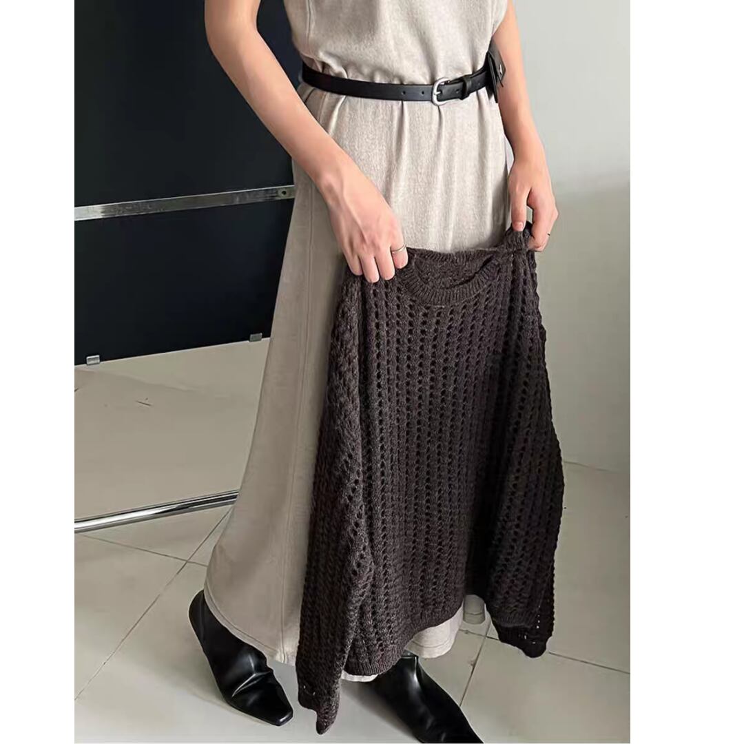 ざっくりとした透かし編みが魅力のメッシュニットと、シンプルなキャミソールワンピースを組み合わせたセットアップ。