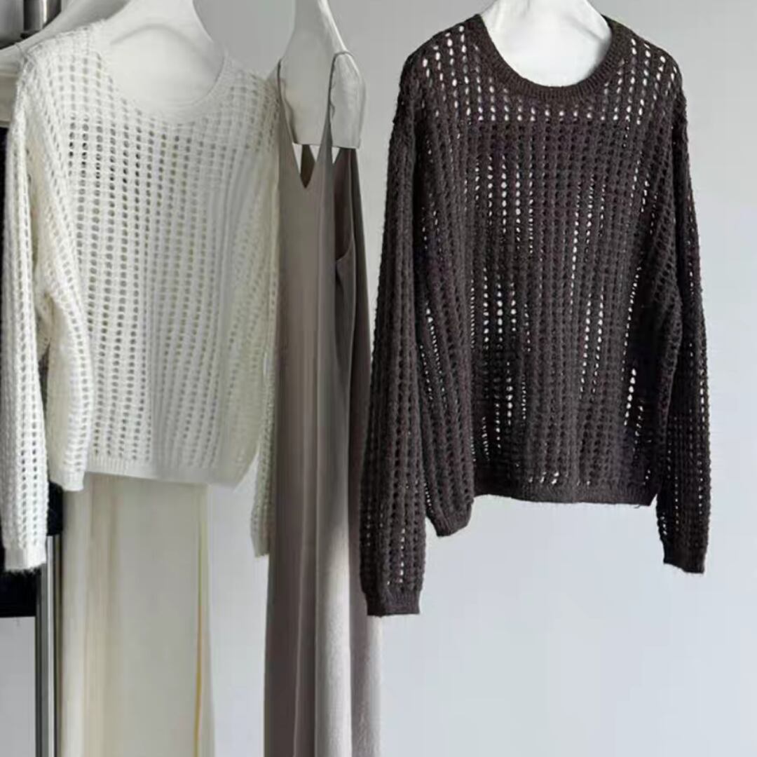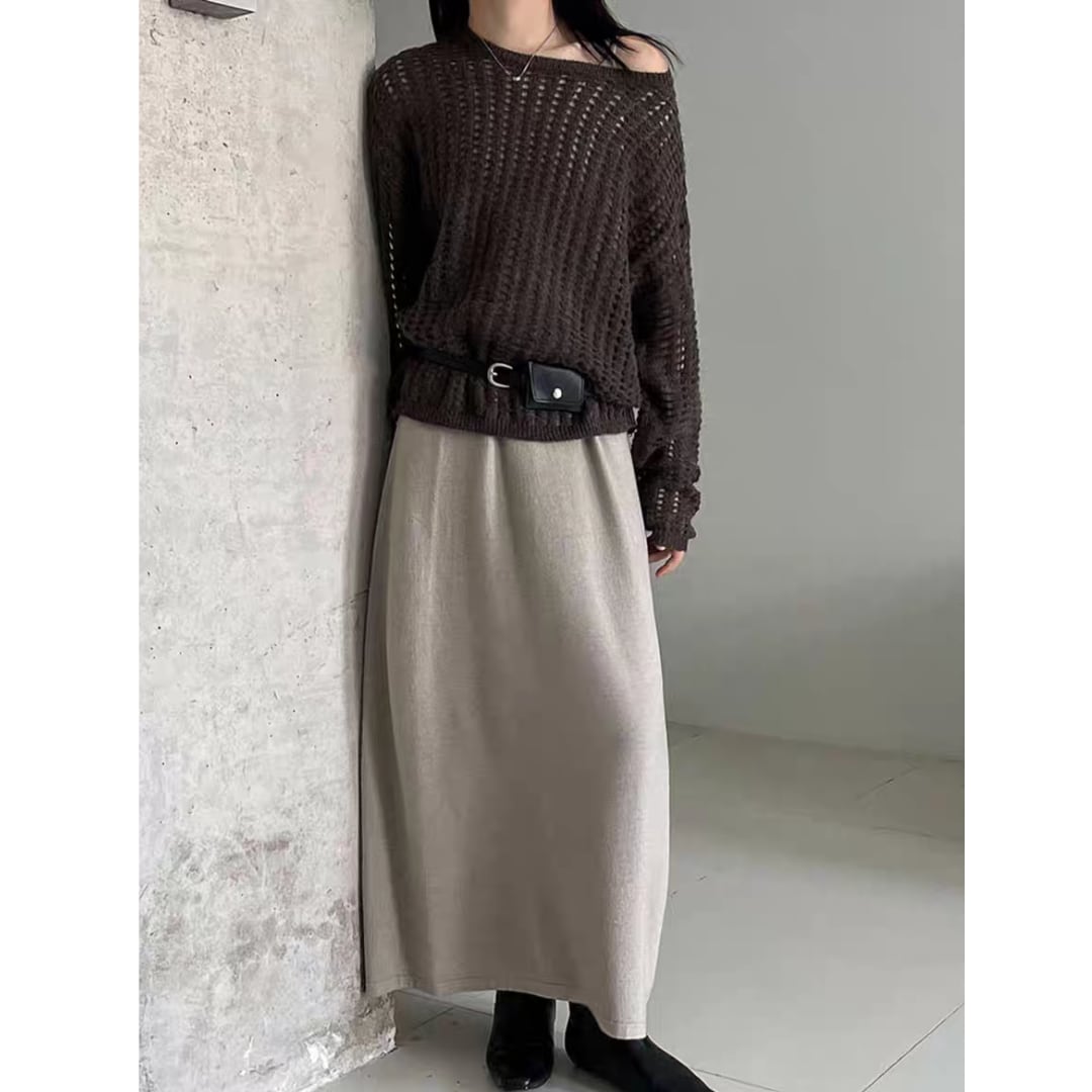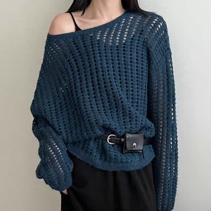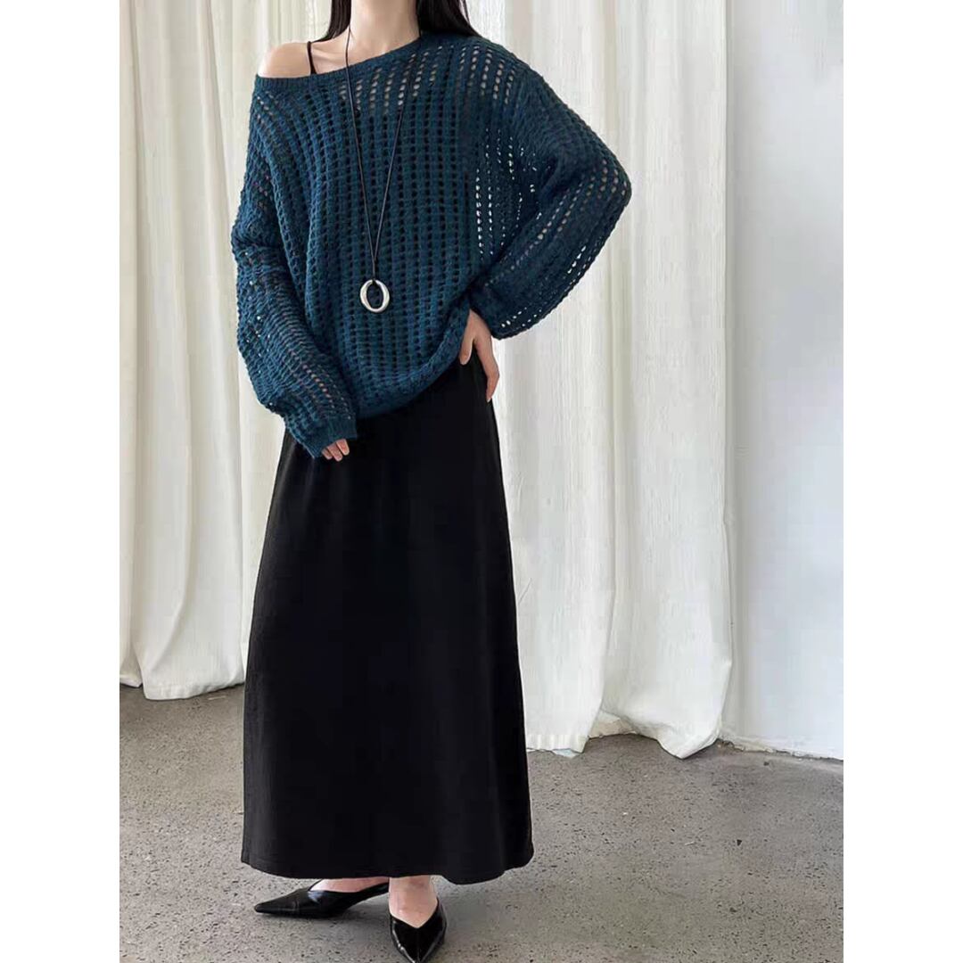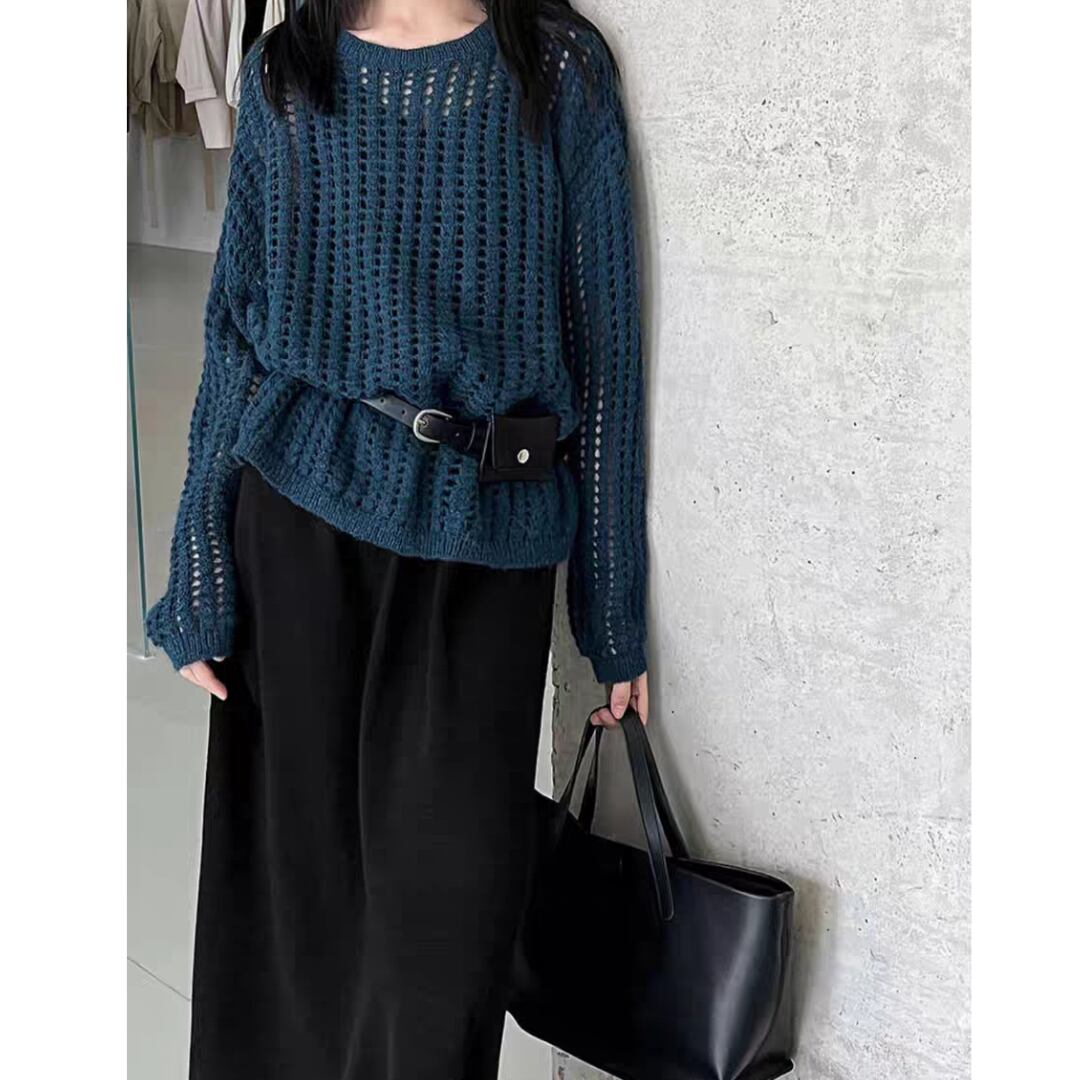 ざっくりとした透かし編みが魅力のメッシュニットと、シンプルなキャミソールワンピースを組み合わせたセットアップ。