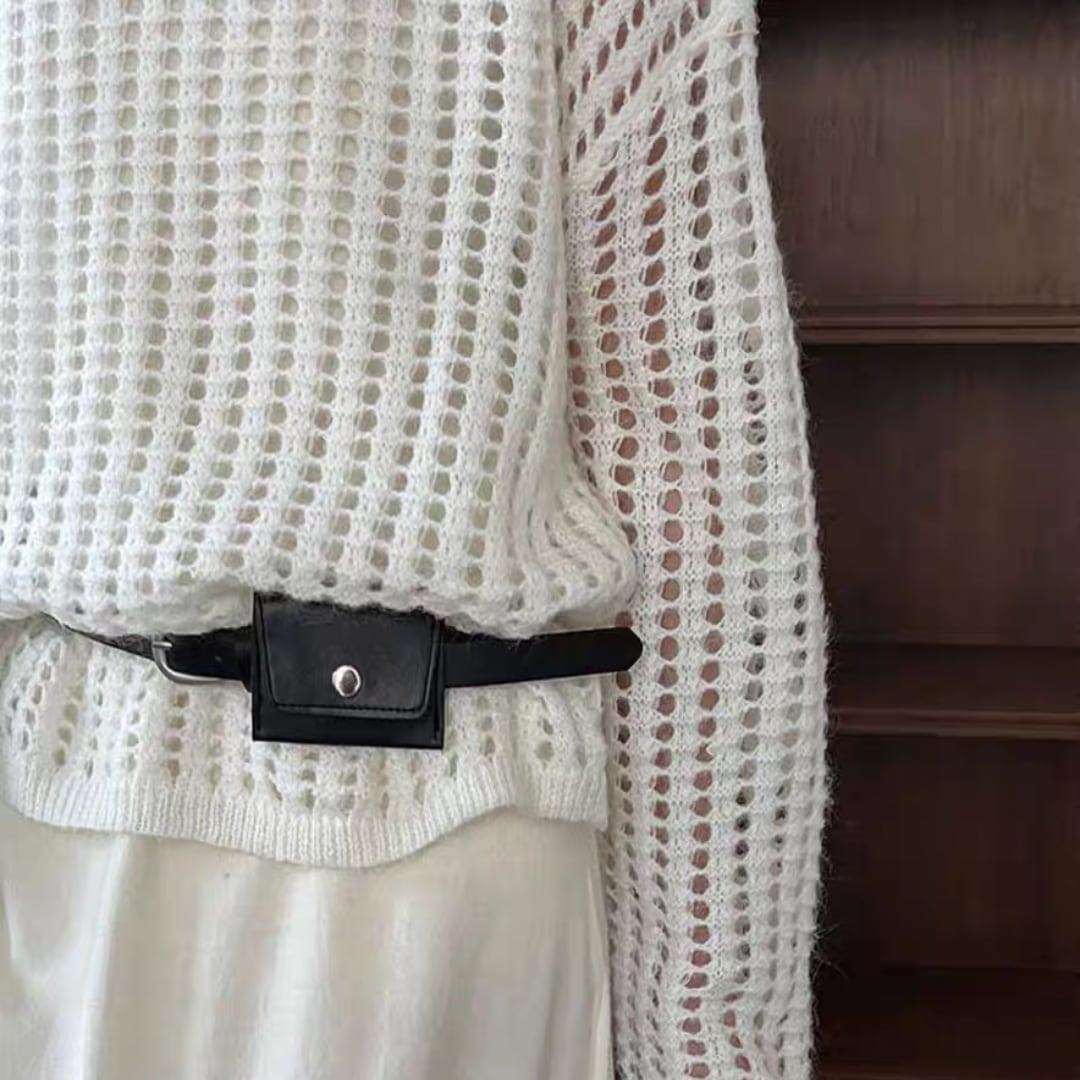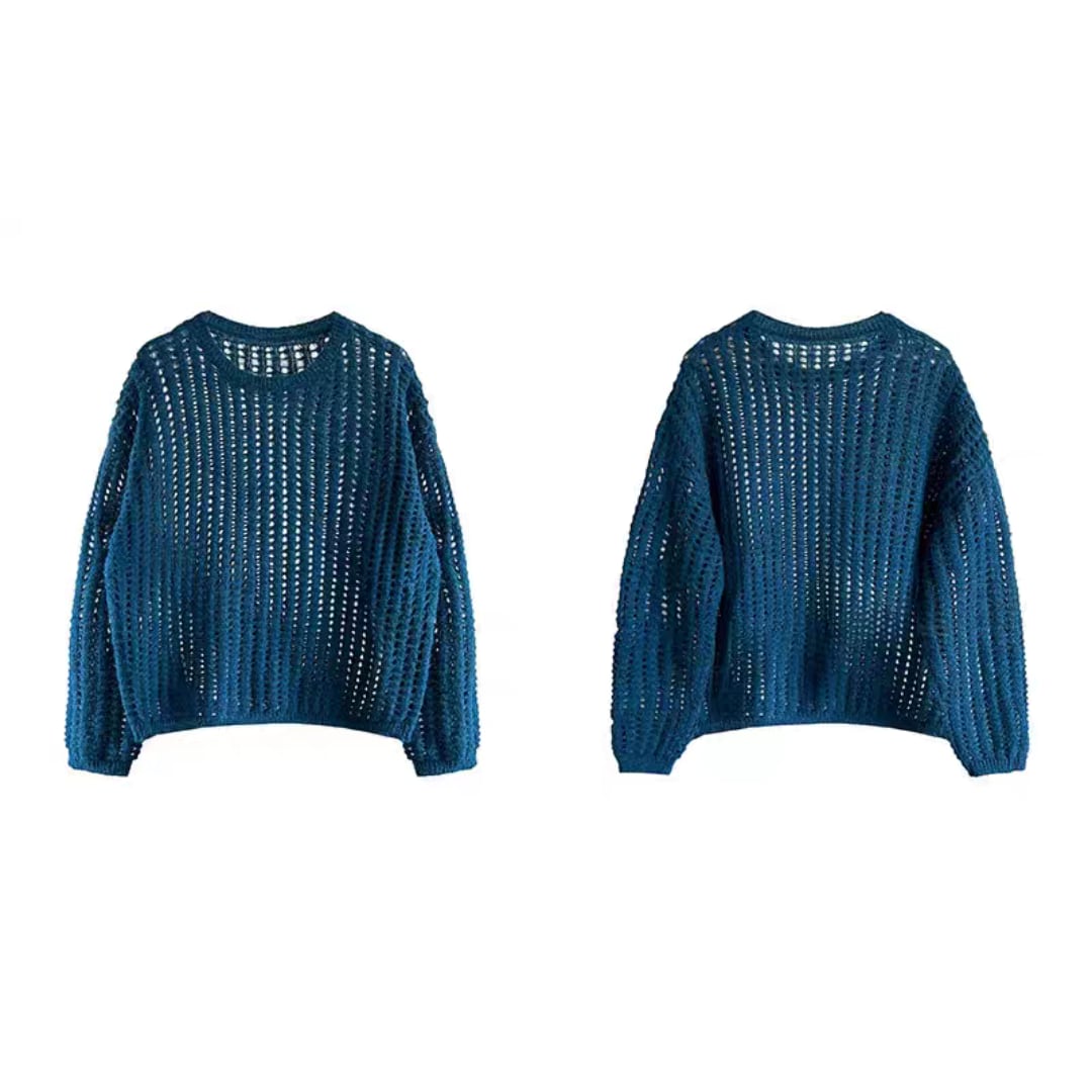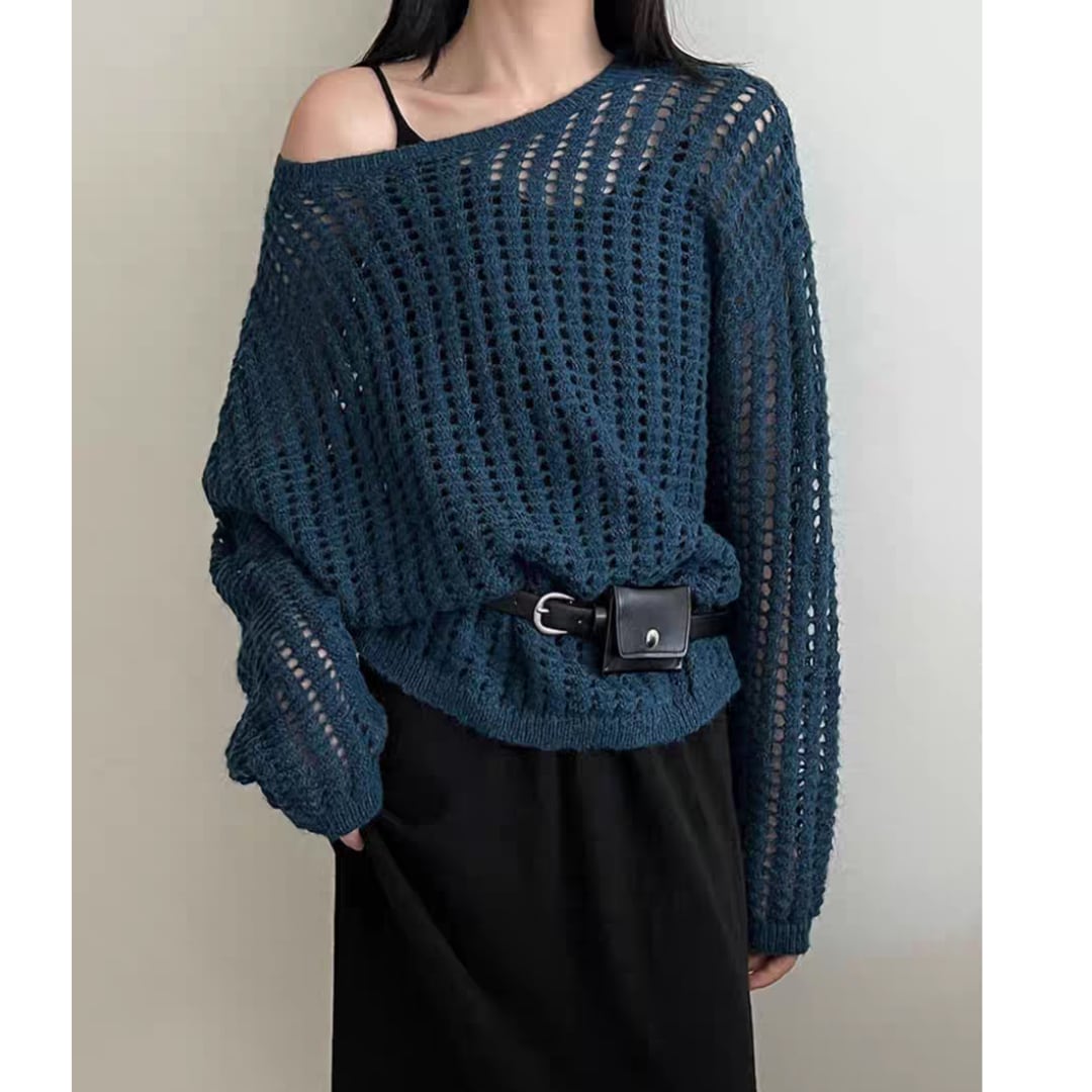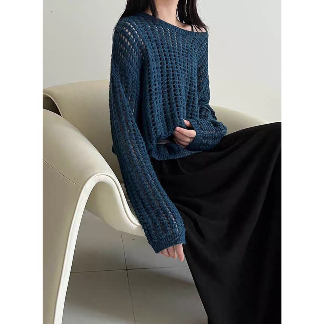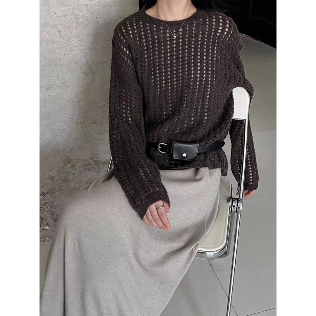 ざっくりとした透かし編みが魅力のメッシュニットと、シンプルなキャミソールワンピースを組み合わせたセットアップ。