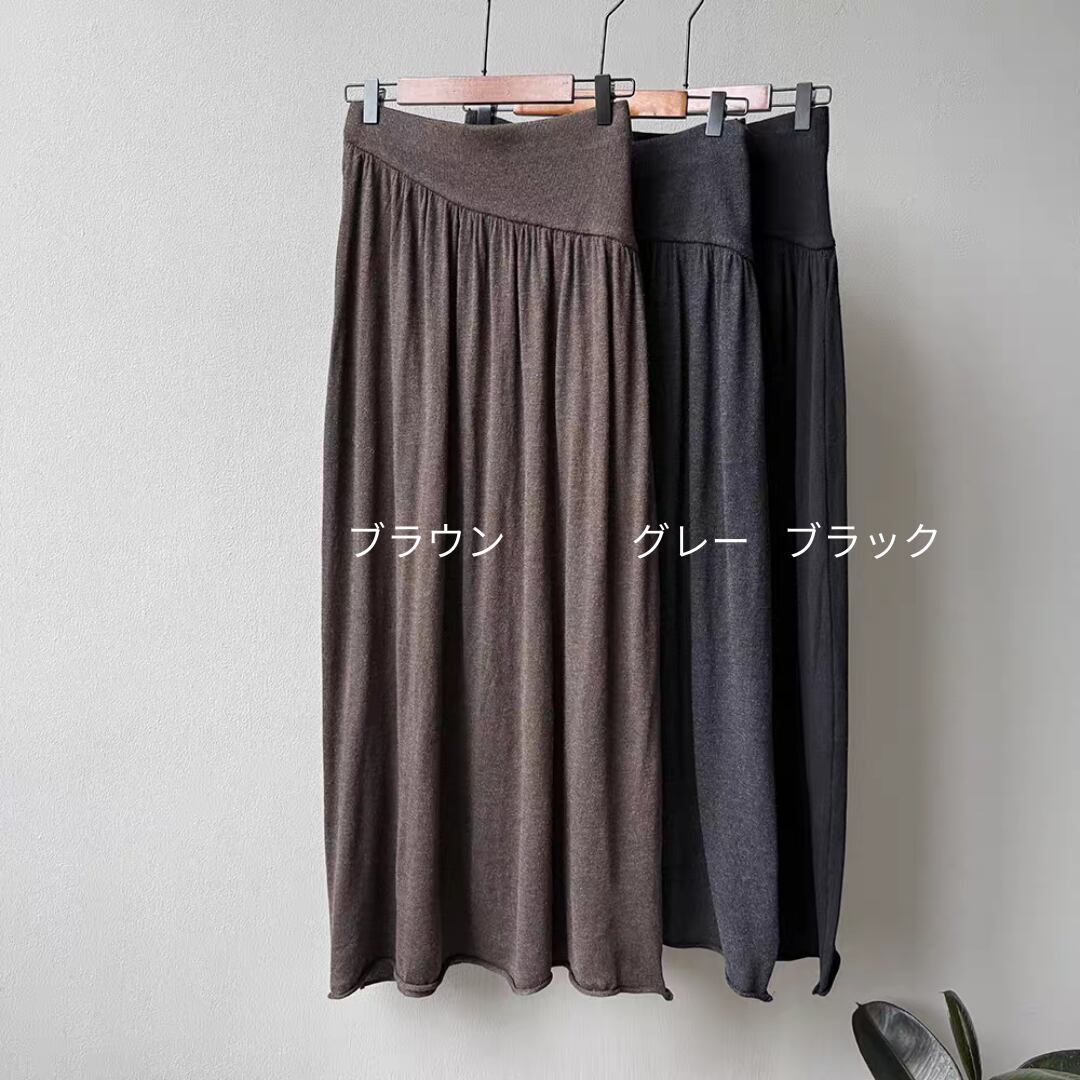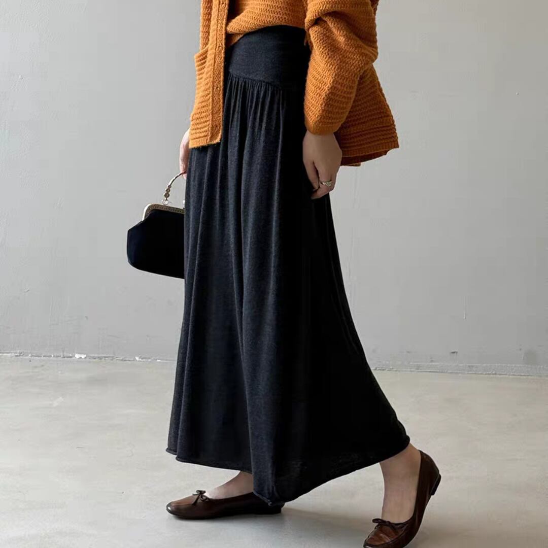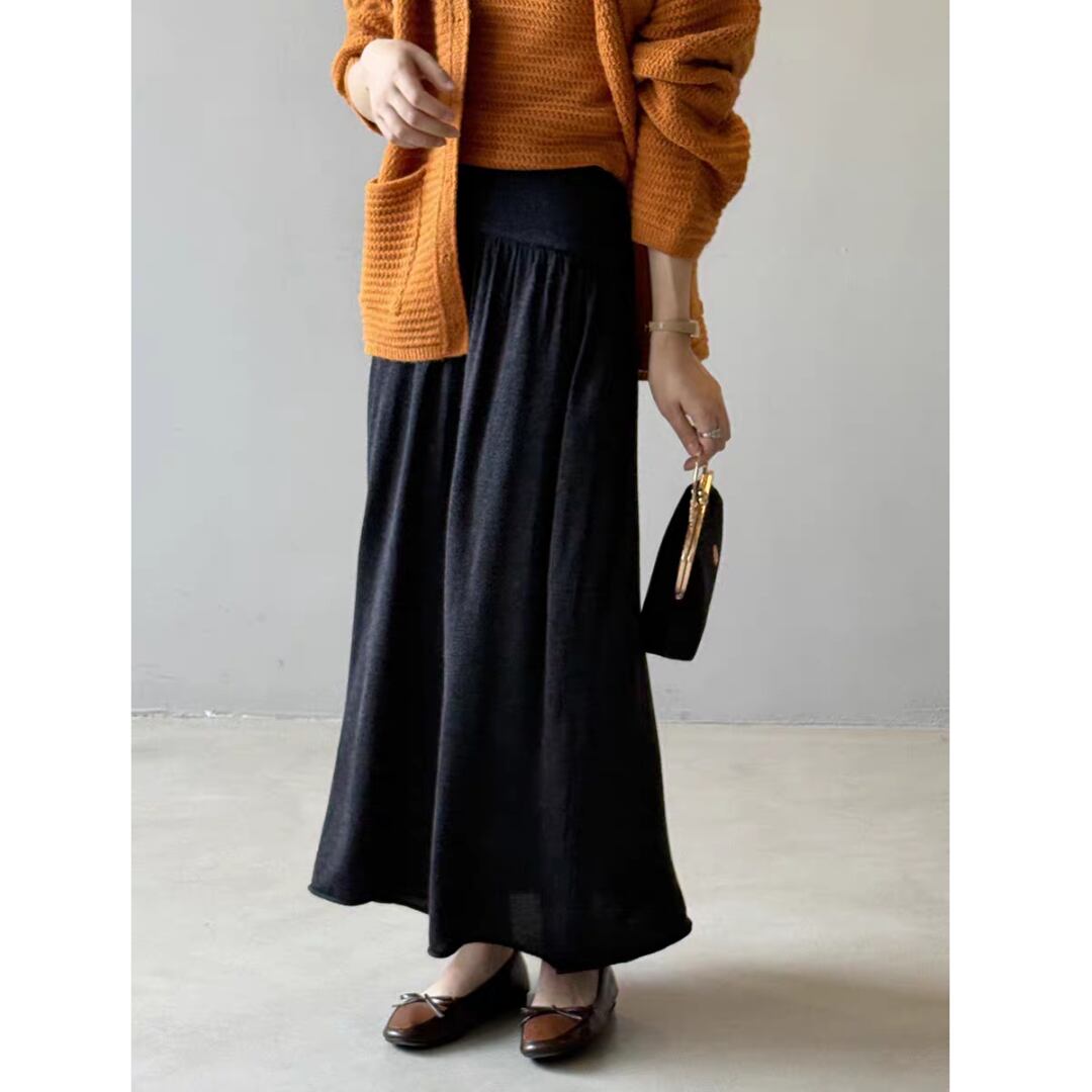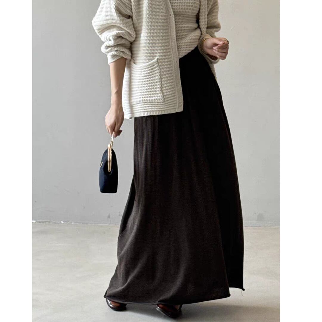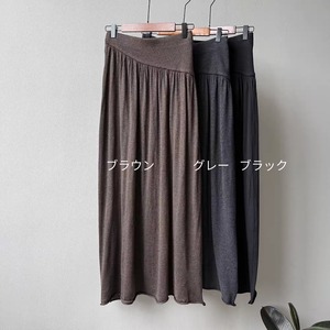 ウエスト部分は幅広のリブ切替えでフィット感があり、トップスをインしてもバランスよく着こなせます。ふんわりとしたフレアシルエットが女性らしい動きを演出し、カジュアルからきれいめまで幅広く活躍するアイテムです。