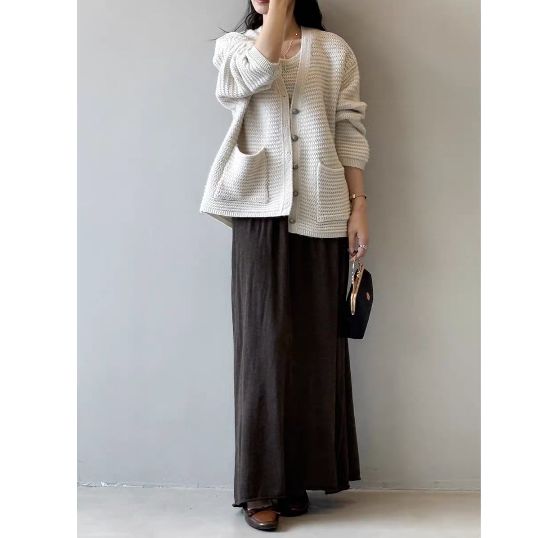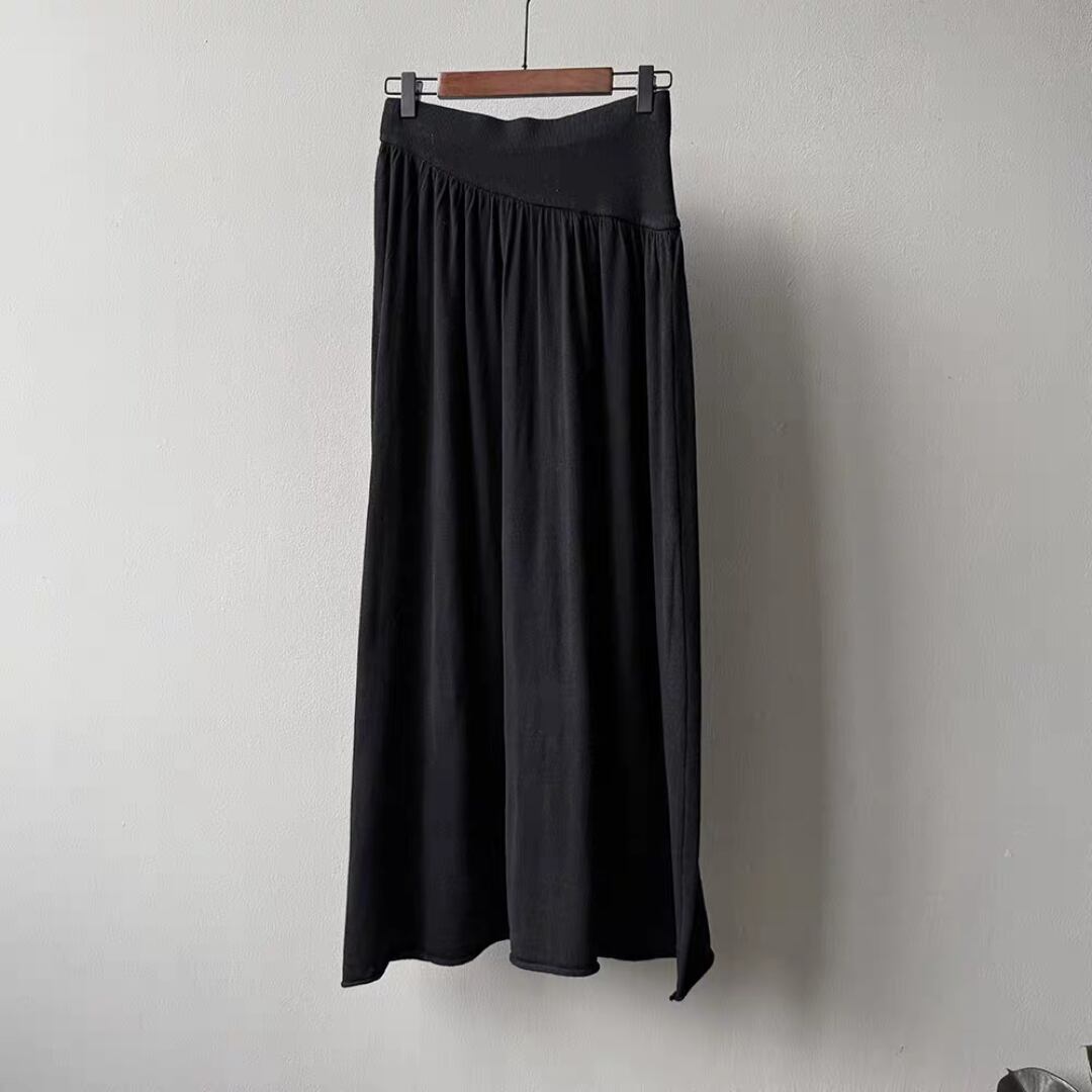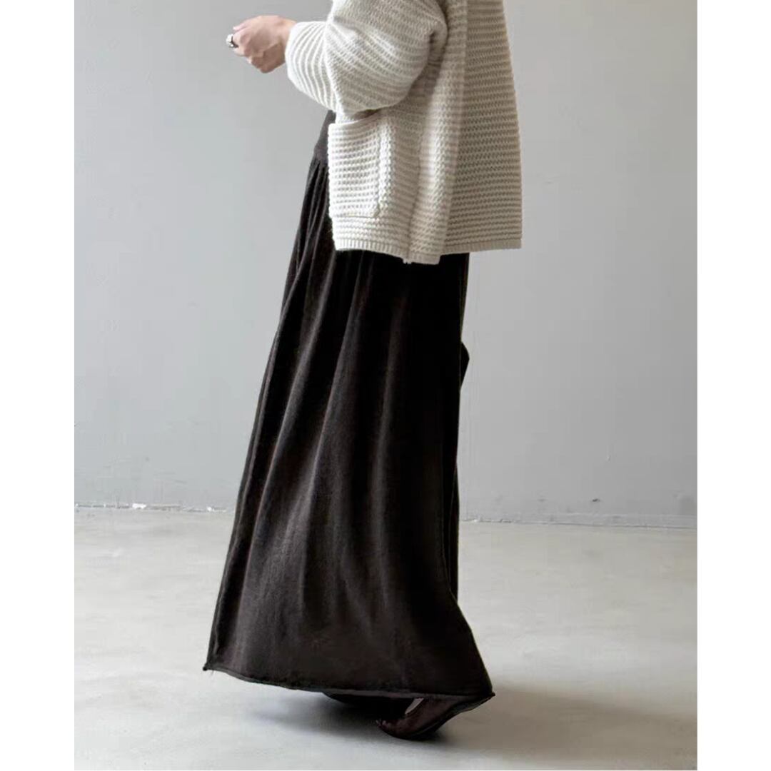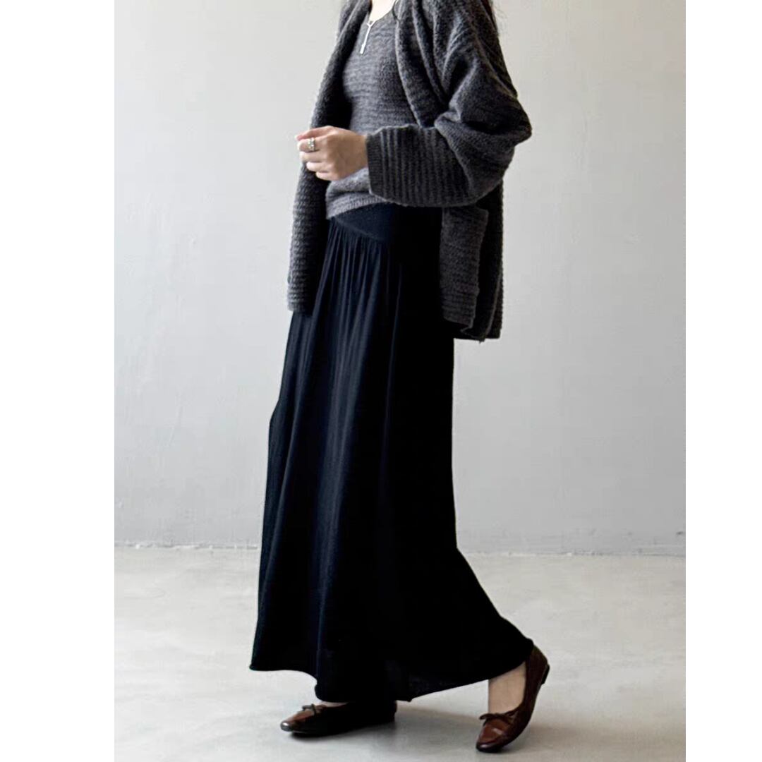 ウエスト部分は幅広のリブ切替えでフィット感があり、トップスをインしてもバランスよく着こなせます。ふんわりとしたフレアシルエットが女性らしい動きを演出し、カジュアルからきれいめまで幅広く活躍するアイテムです。