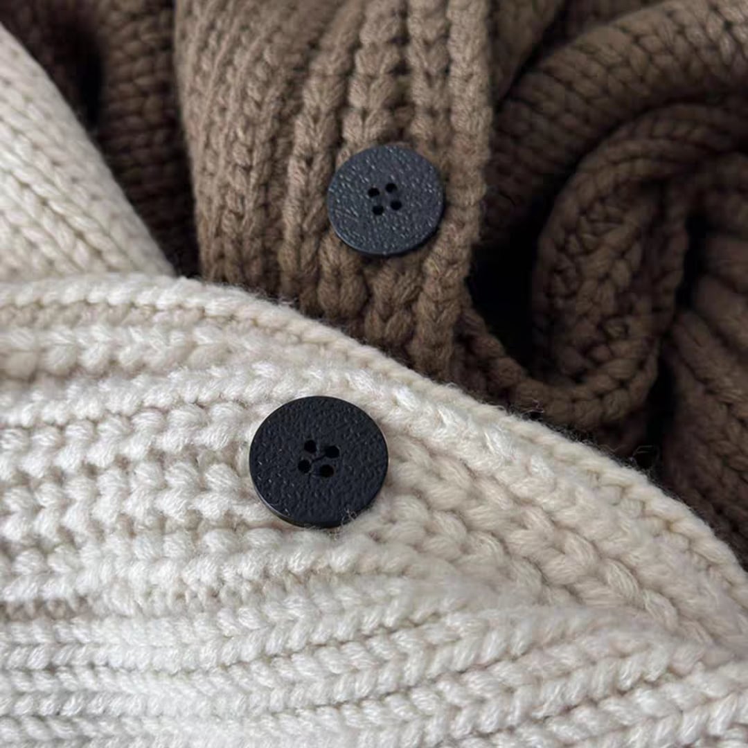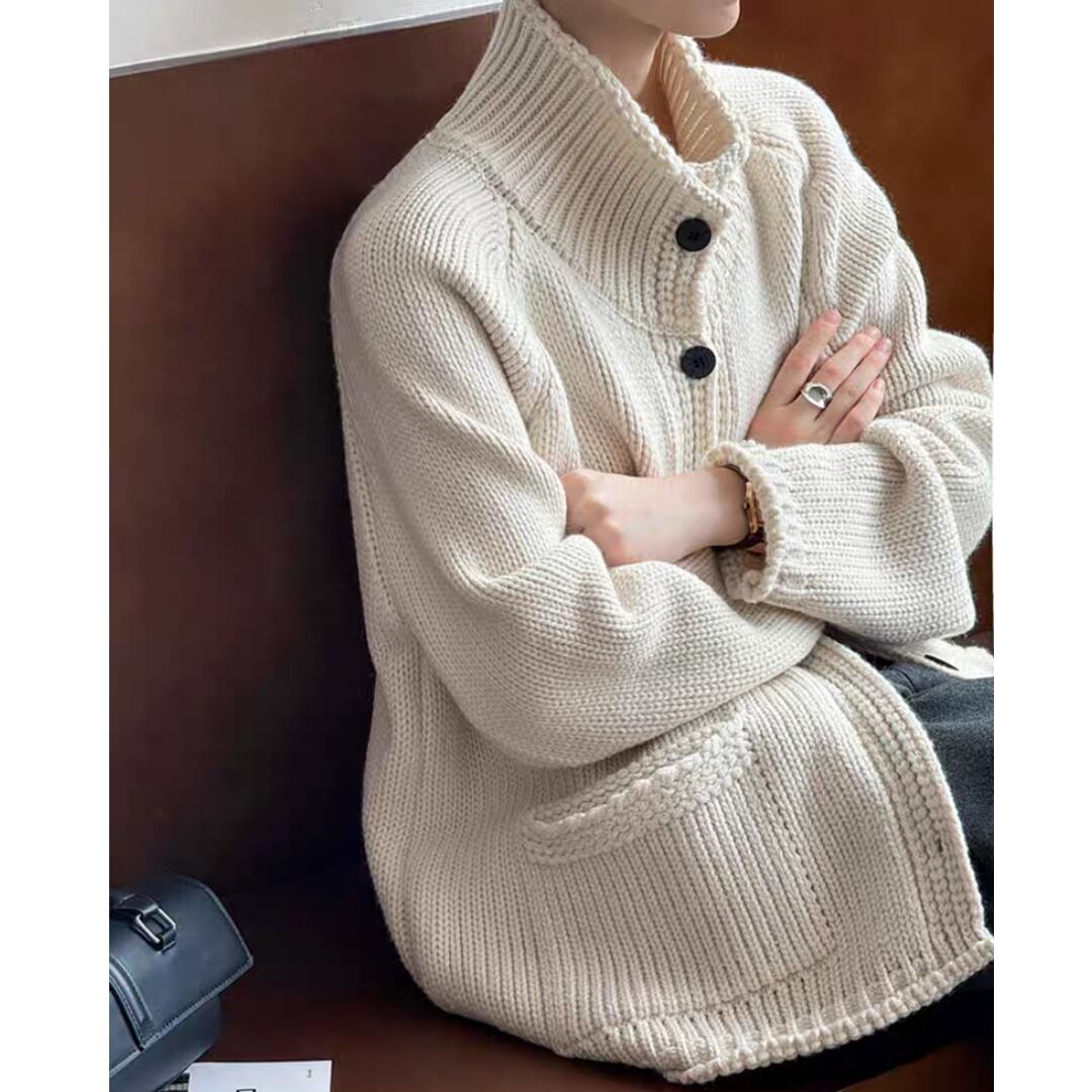 ハイネックデザインに大きめのボタンをあしらい、首元までしっかり包み込むので防寒性も◎。