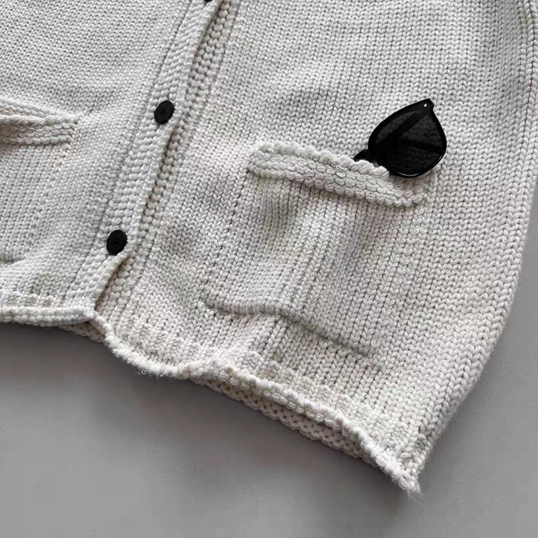 フロントのポケットやリブ編みのディテールがさりげないアクセントになり、大人カジュアルな雰囲気を演出。