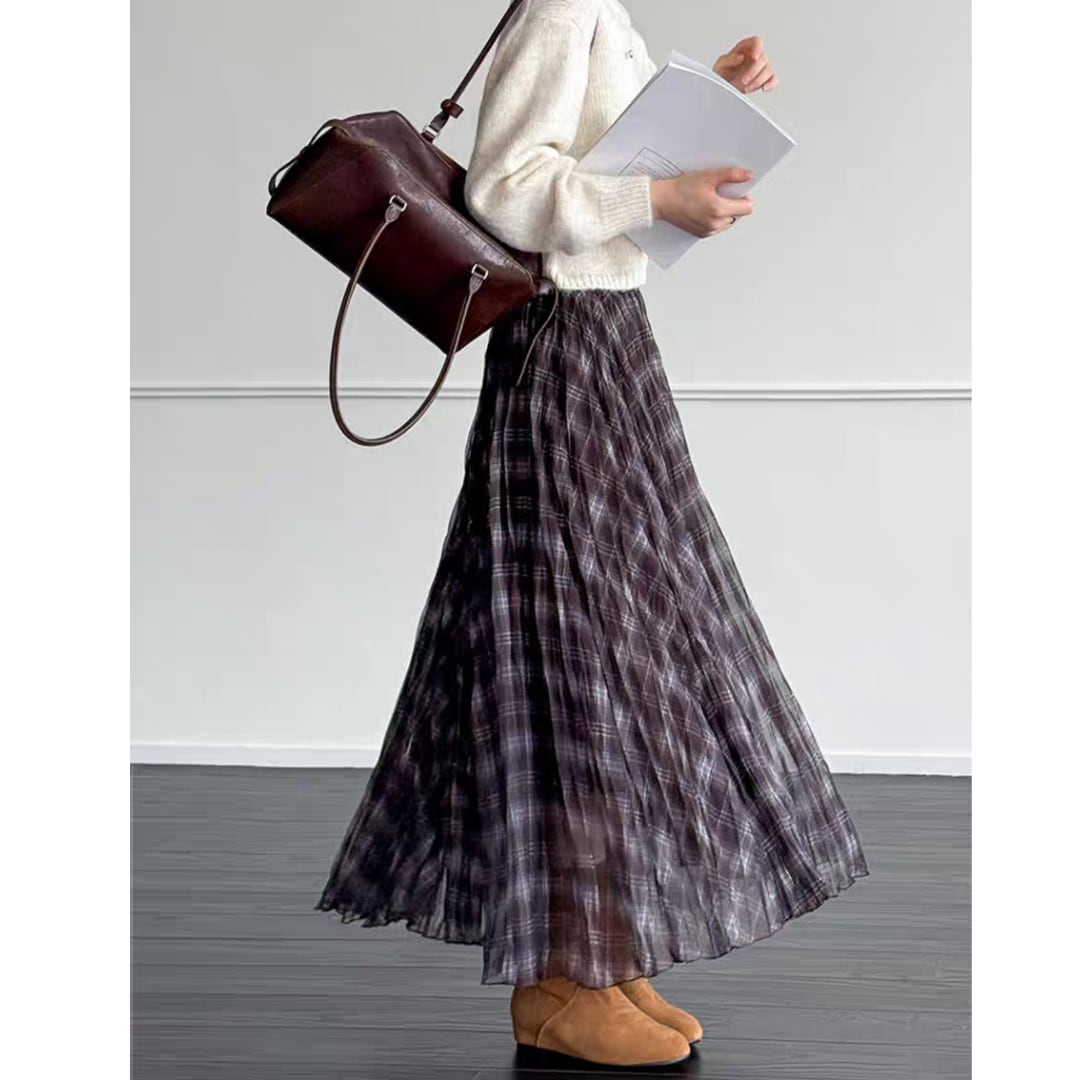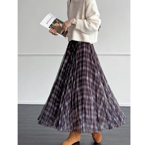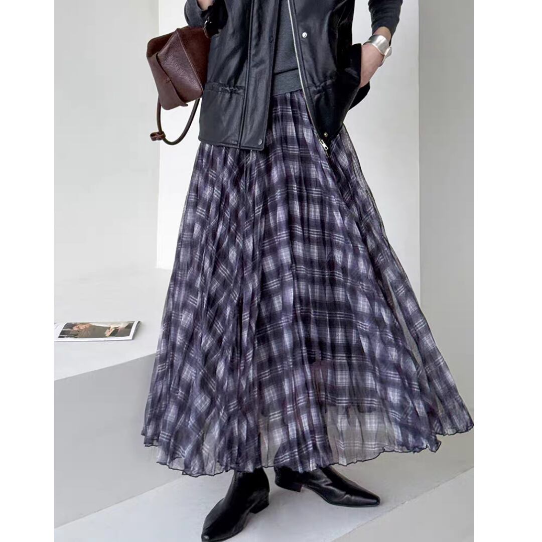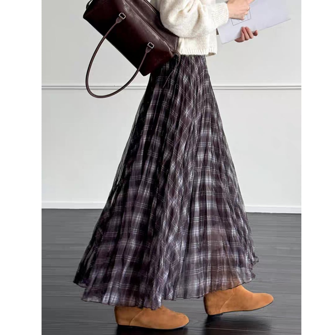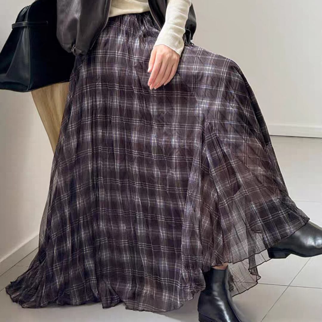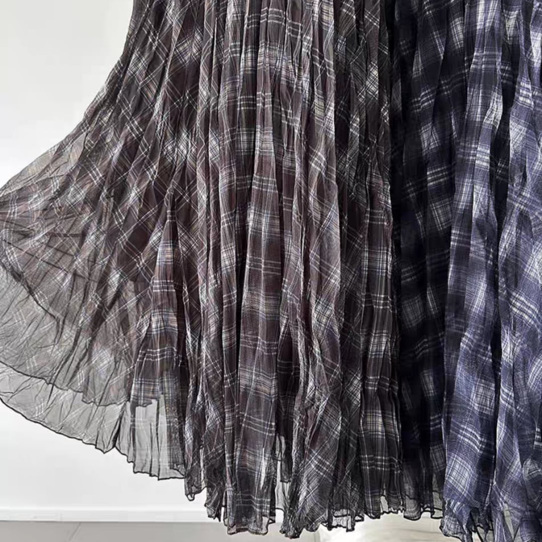 軽やかな透け感のある素材で仕立てた、チェック柄のプリーツロングスカート。