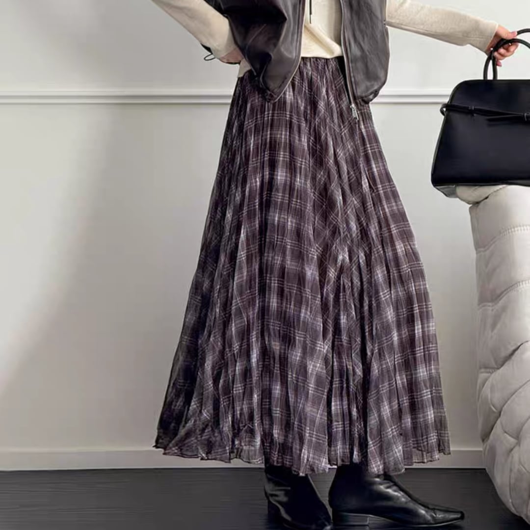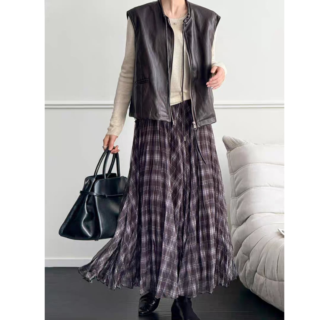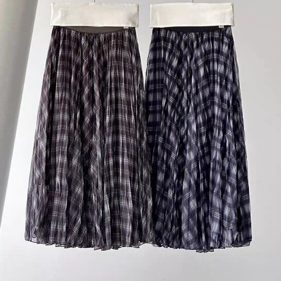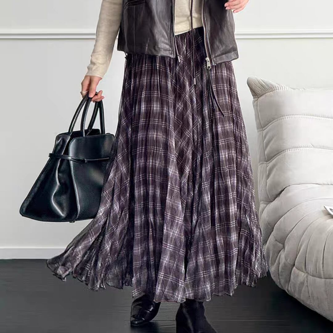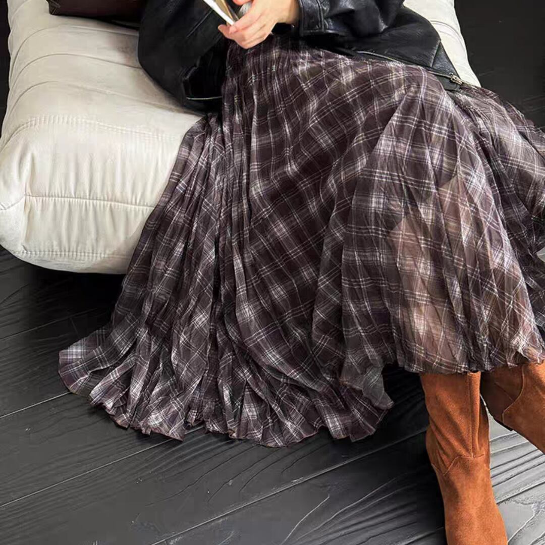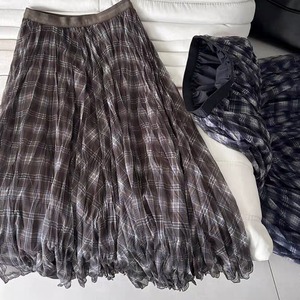 軽やかな透け感のある素材で仕立てた、チェック柄のプリーツロングスカート。
