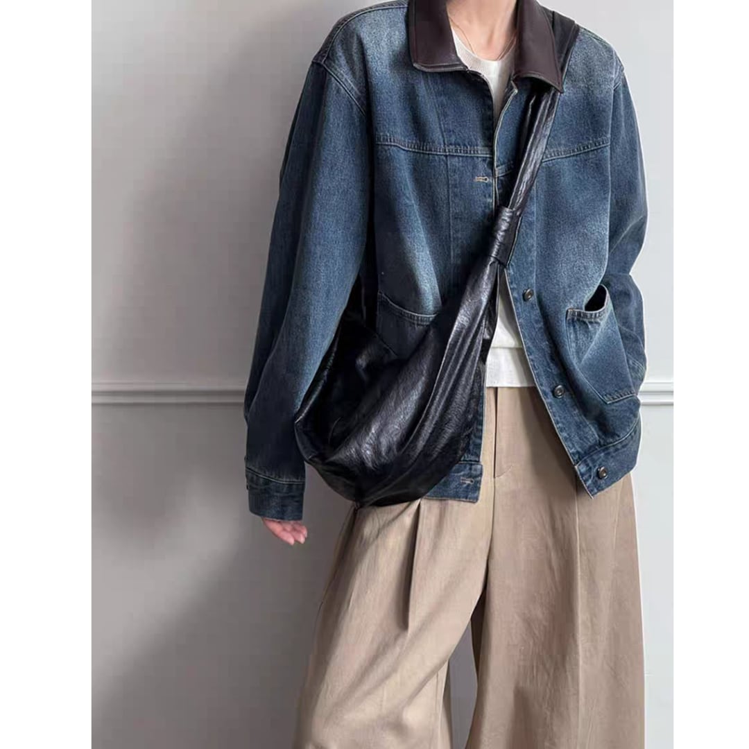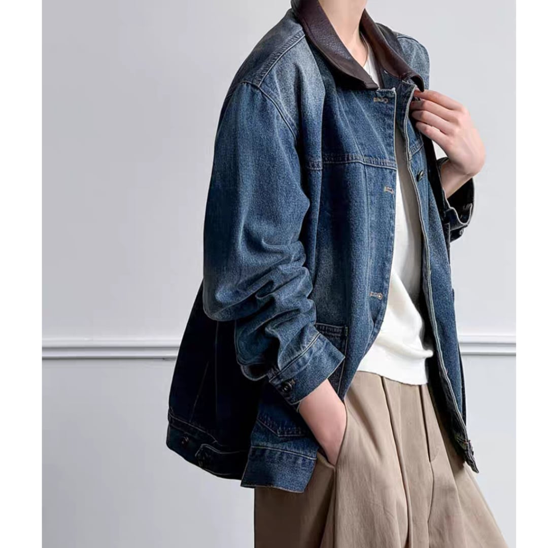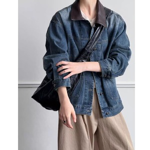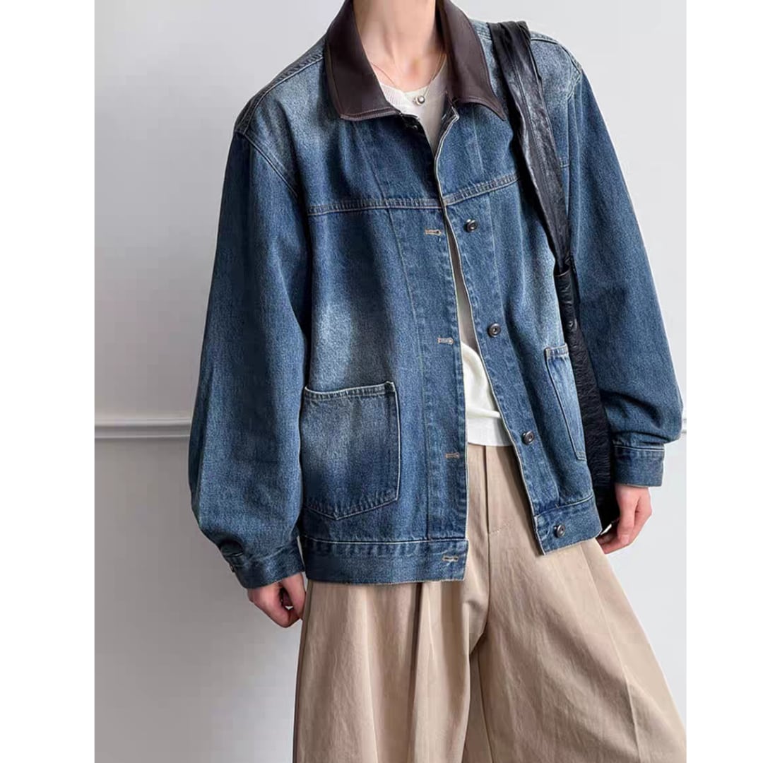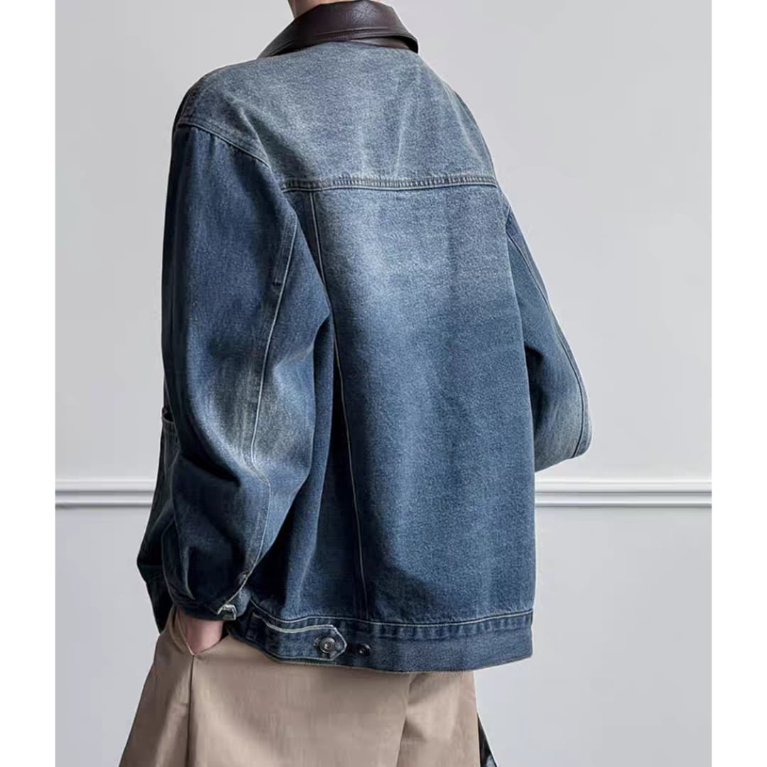 カジュアルなデニムに異素材の襟を組み合わせた、遊び心のあるデニムジャケット。
