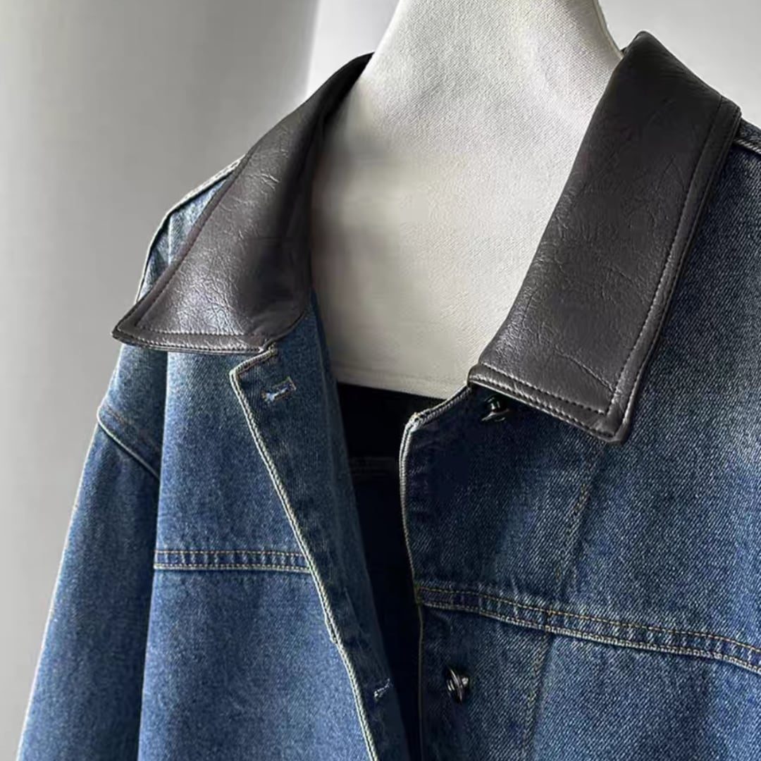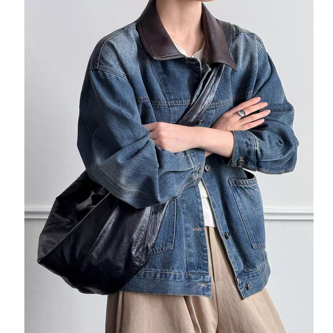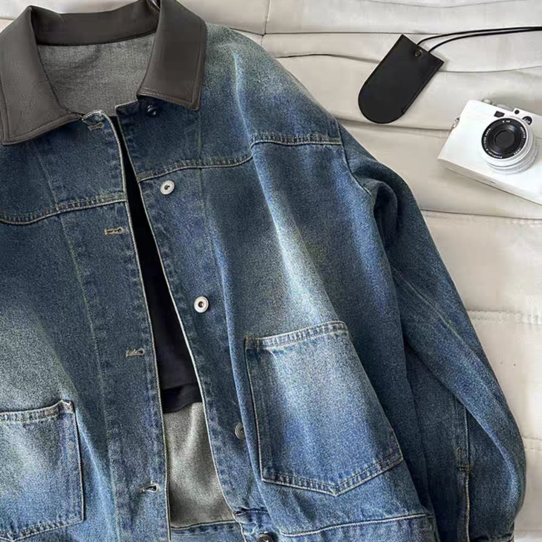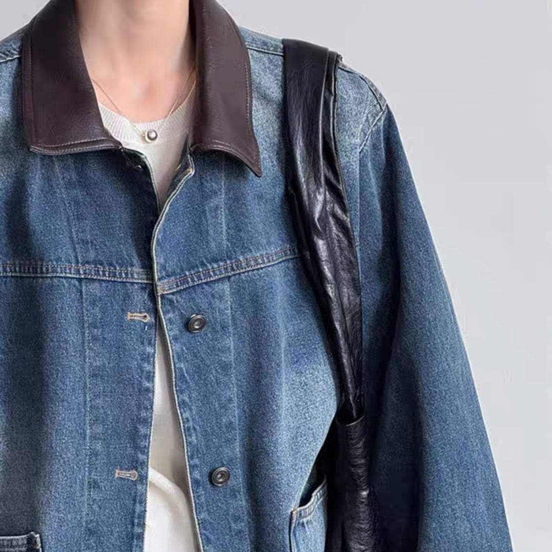カジュアルなデニムに異素材の襟を組み合わせた、遊び心のあるデニムジャケット。