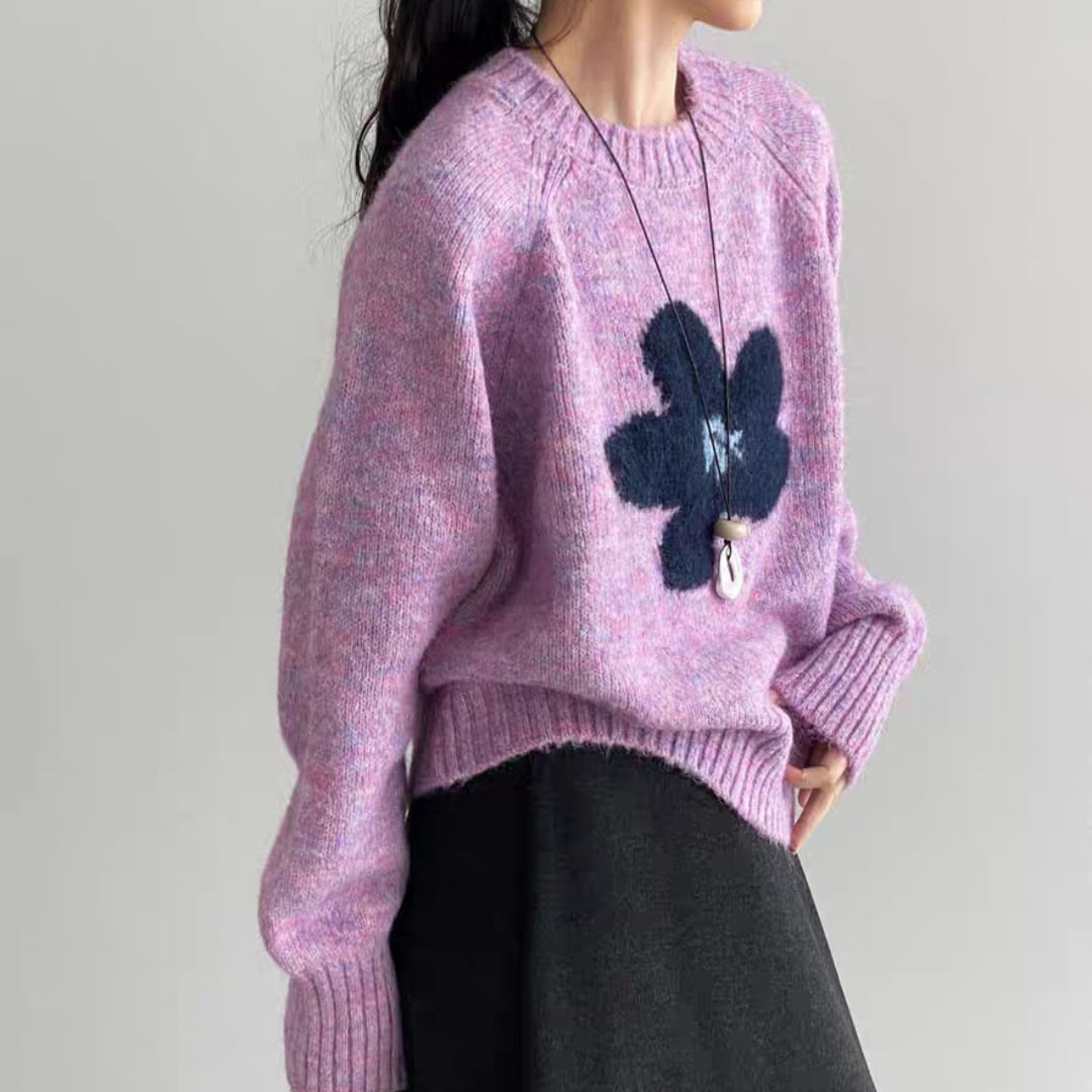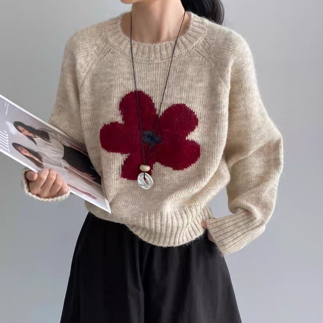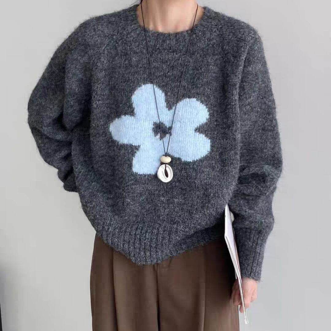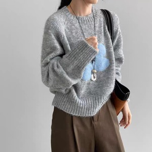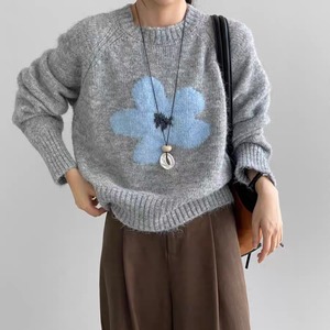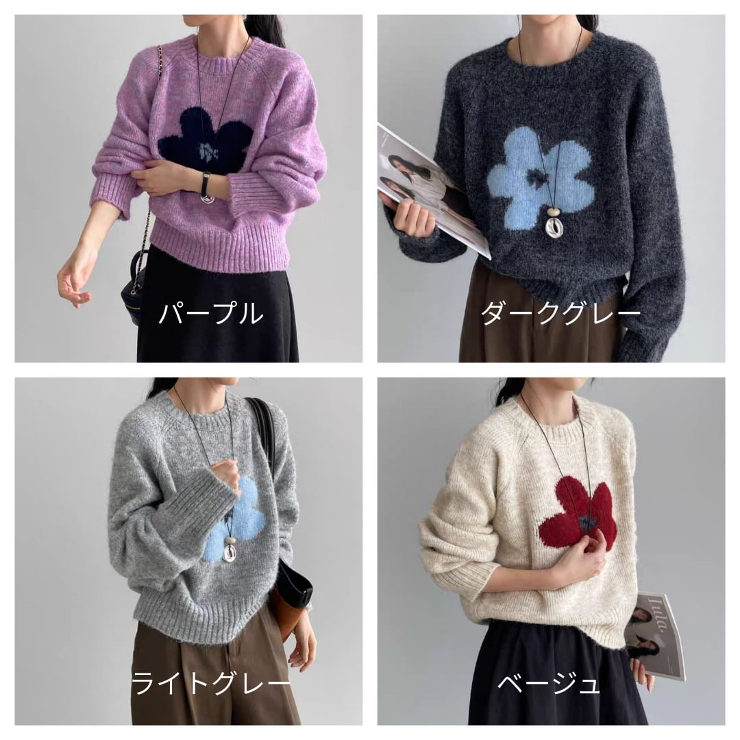 ふんわりとした質感が魅力のニットプルオーバー。フロントに大胆にあしらったフラワーモチーフが、シンプルなコーディネートに華やぎをプラス。