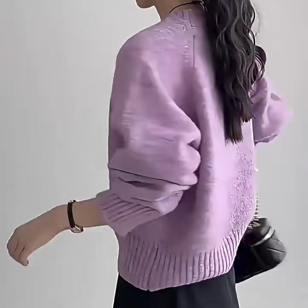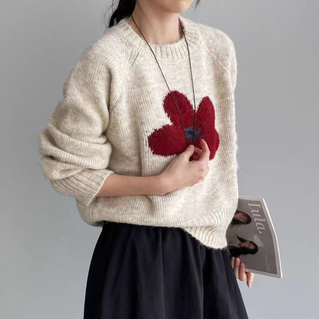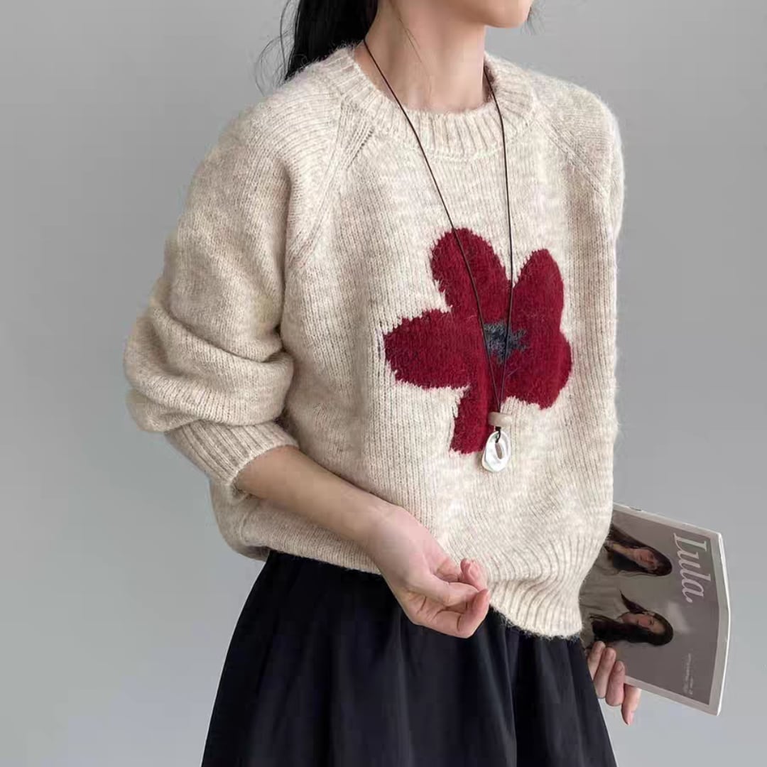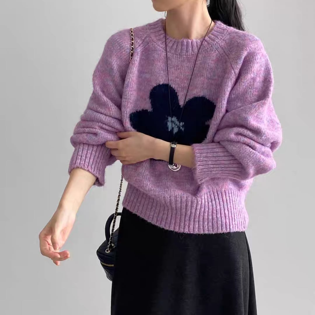 ふんわりとした質感が魅力のニットプルオーバー。フロントに大胆にあしらったフラワーモチーフが、シンプルなコーディネートに華やぎをプラス。