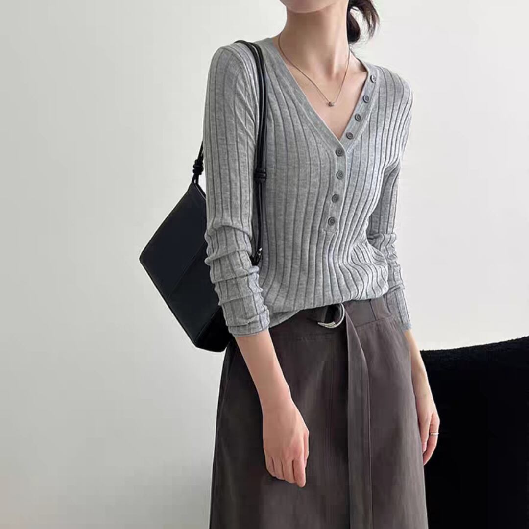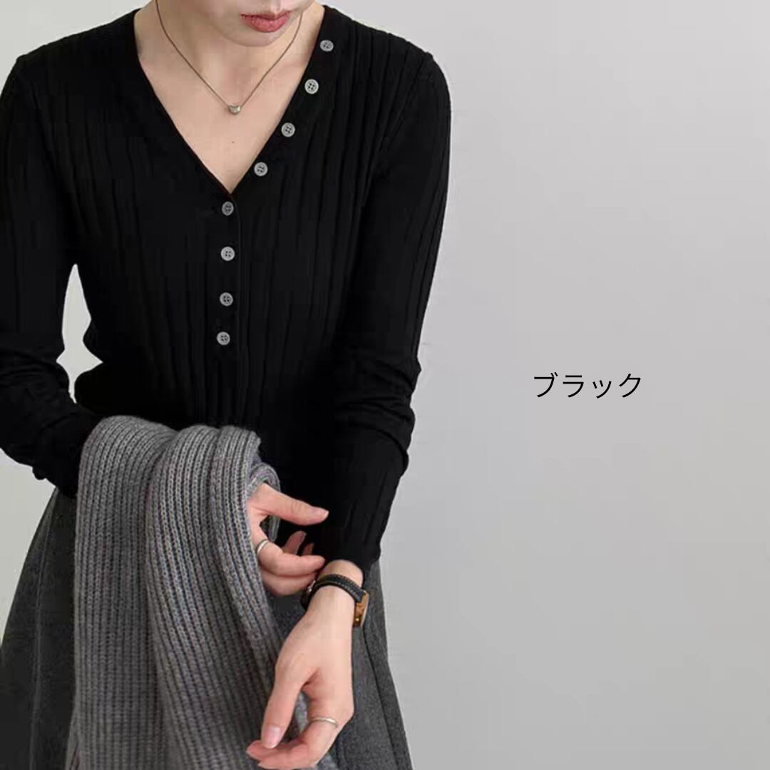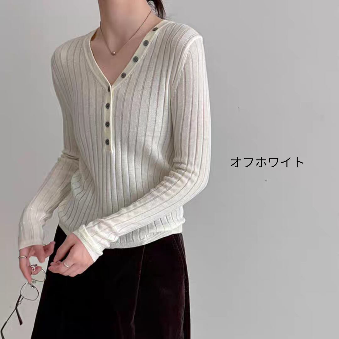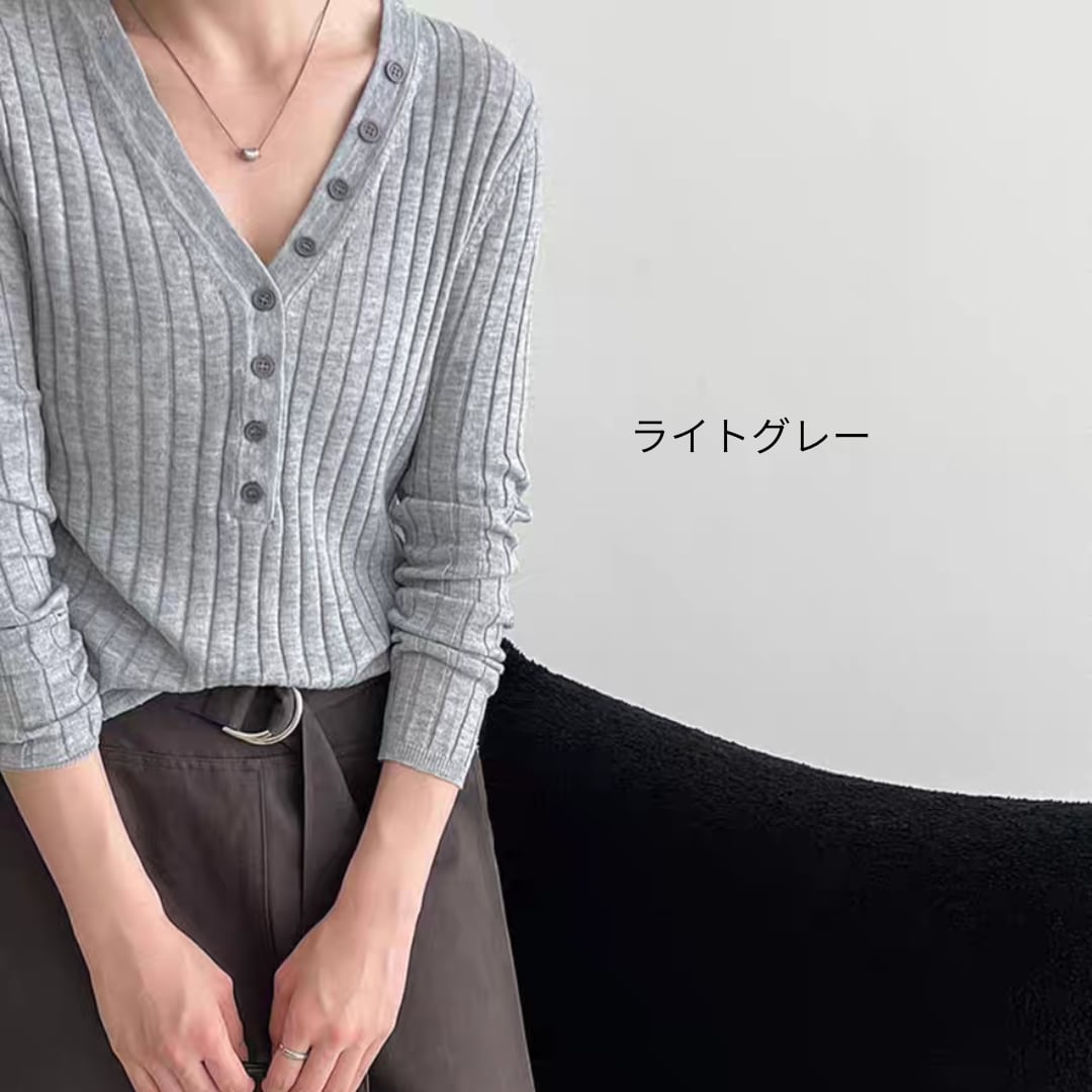 程よくフィットするリブ編みが女性らしいシルエットを引き立てるVネックニットトップス。