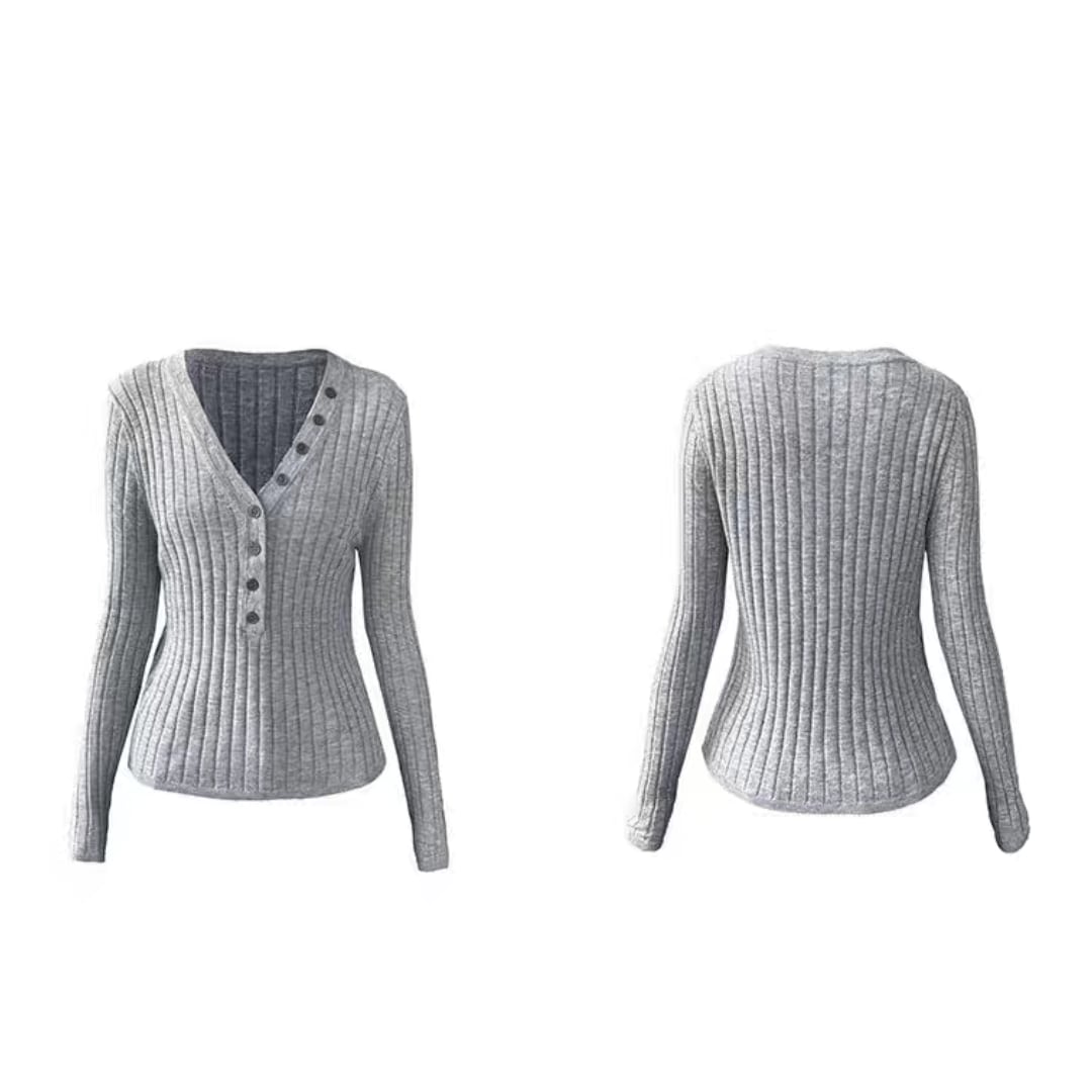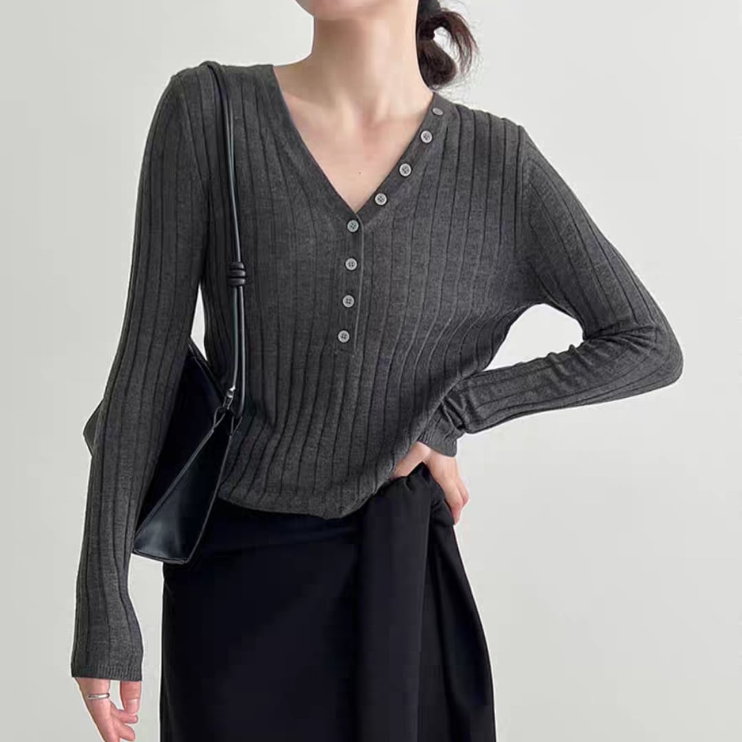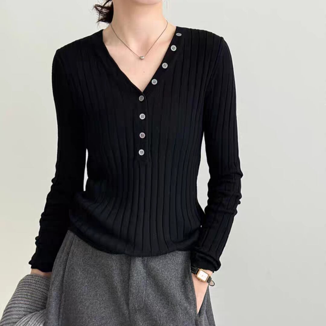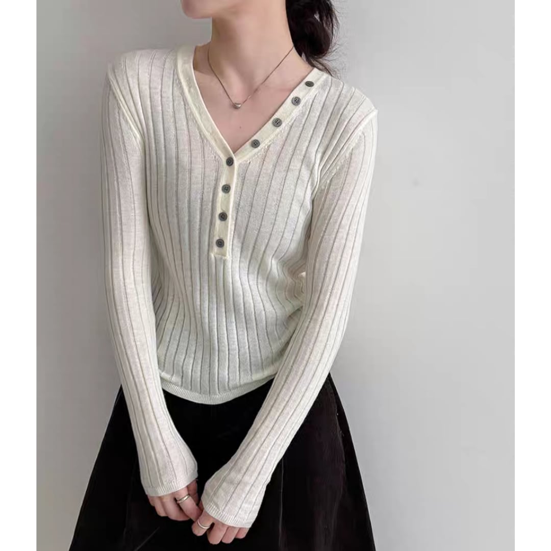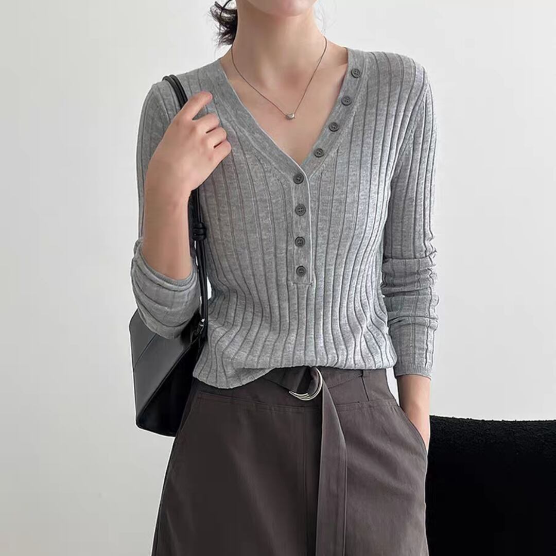 程よくフィットするリブ編みが女性らしいシルエットを引き立てるVネックニットトップス。