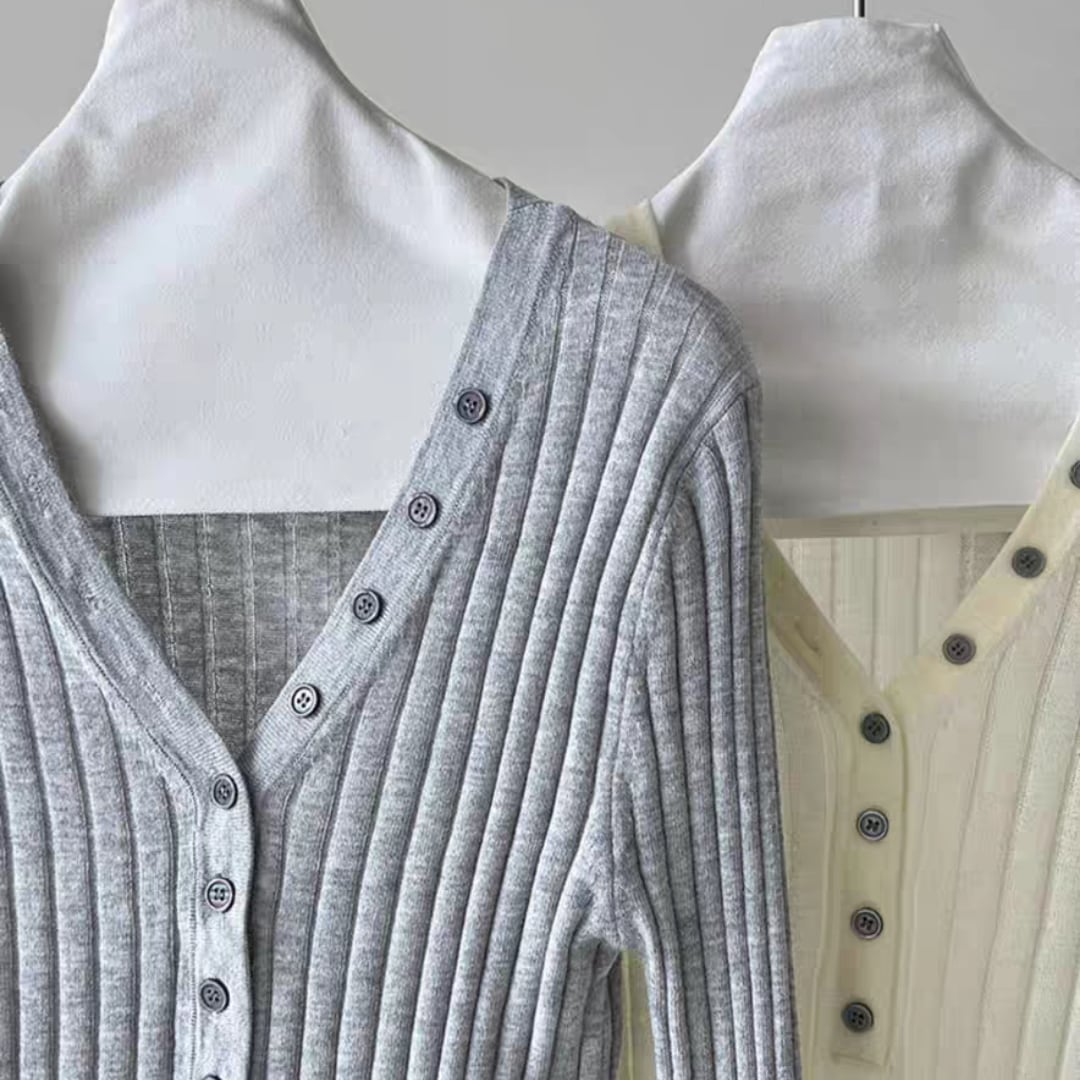 斜めに並んだフロントボタンがアクセントとなり、シンプルながらも洗練された印象を与えます。