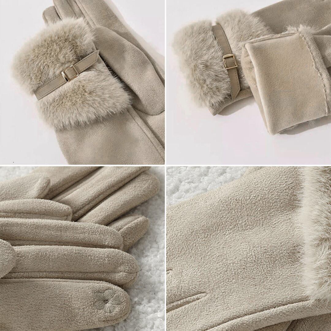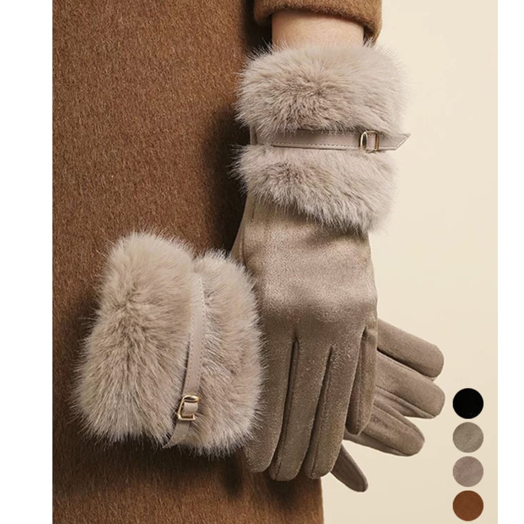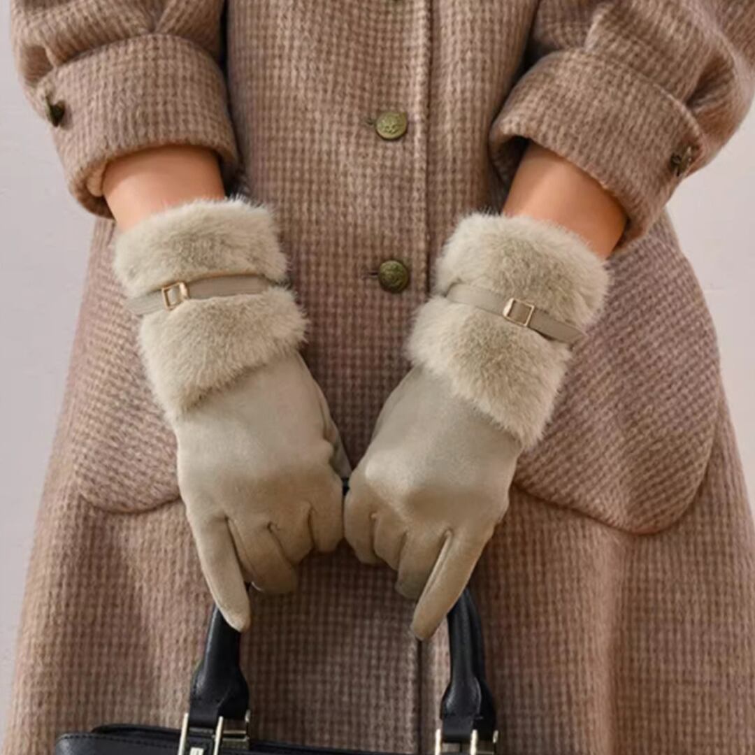やわらかなスエード調素材にファーをあしらった、上品でフェミニンなデザインの手袋。