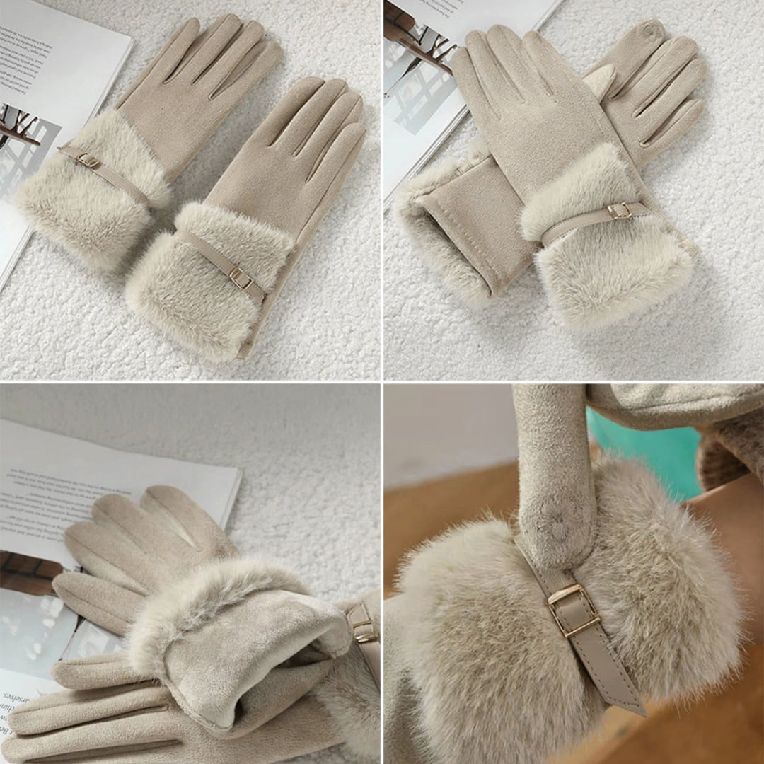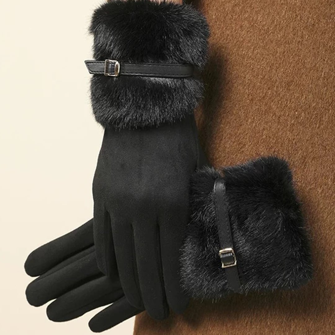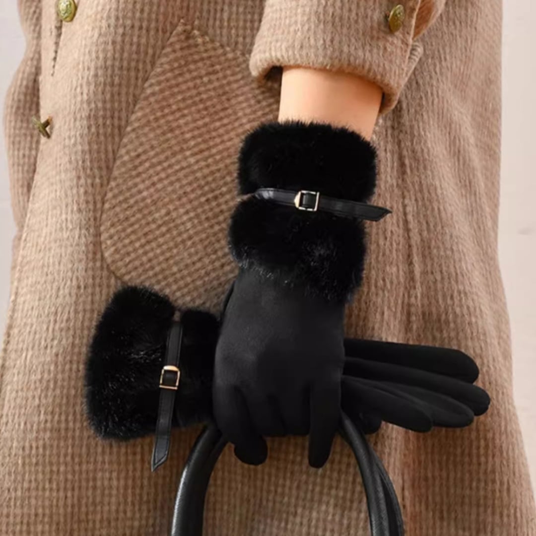 やわらかなスエード調素材にファーをあしらった、上品でフェミニンなデザインの手袋。