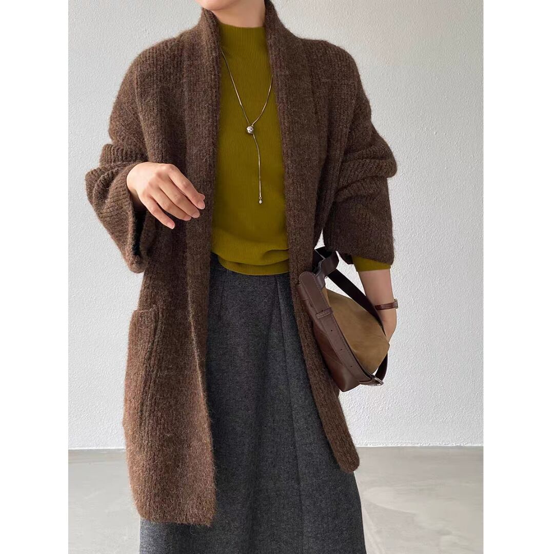 ふんわりとしたシャギー素材で仕立てた、ぬくもりを感じるロングカーディガン。
