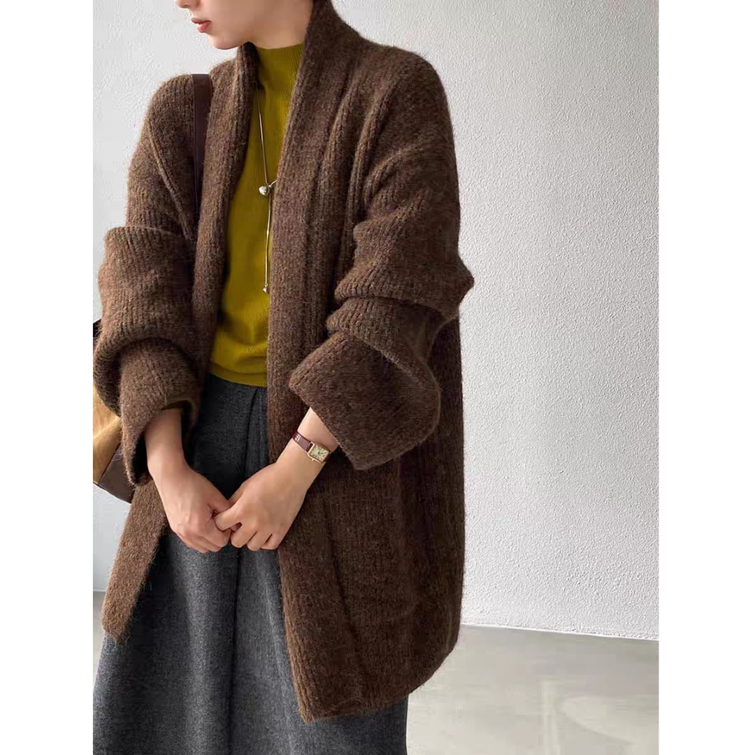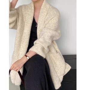 厚みのある編地でしっかり暖かく、肌寒い季節の羽織りとして活躍します。